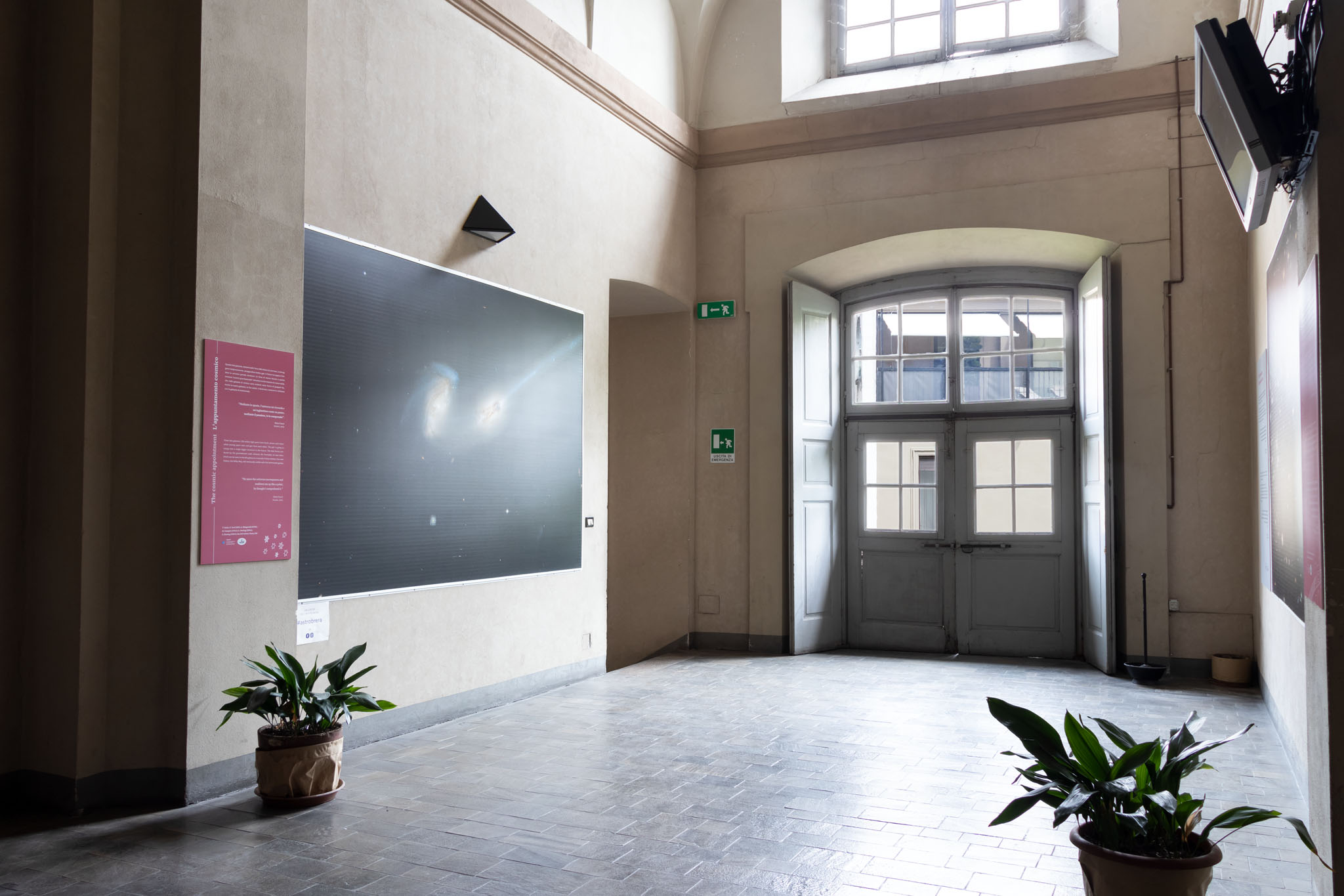 L'androne si trova in cima alla scalinata che conduce dai corridoi dell'Accademia di Brera (al piano terreno del Palazzo) alla sede dell'Osservatorio Astronomico, a cui si accede attraverso il portone di ingresso (visibile sulla sinistra della fotografia, appena prima delle bandiere).