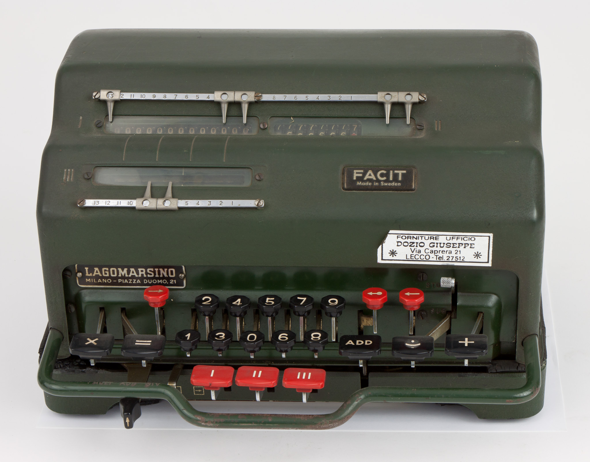Calcolatrice meccanica AB Addo Multo mod. 103 | 27.9(h) ☓ 16.7(w) ☓ 13(p) | A. B. Addo [Aktiebolaget Addo] (Malmö, Svezia) | circa 1950 | Buono. | B18/A3 | ||