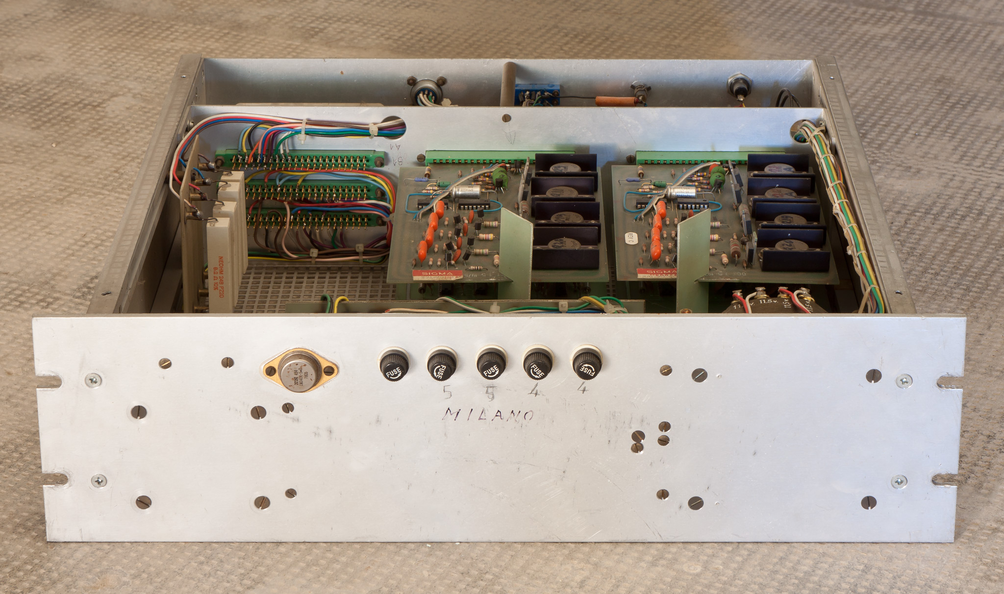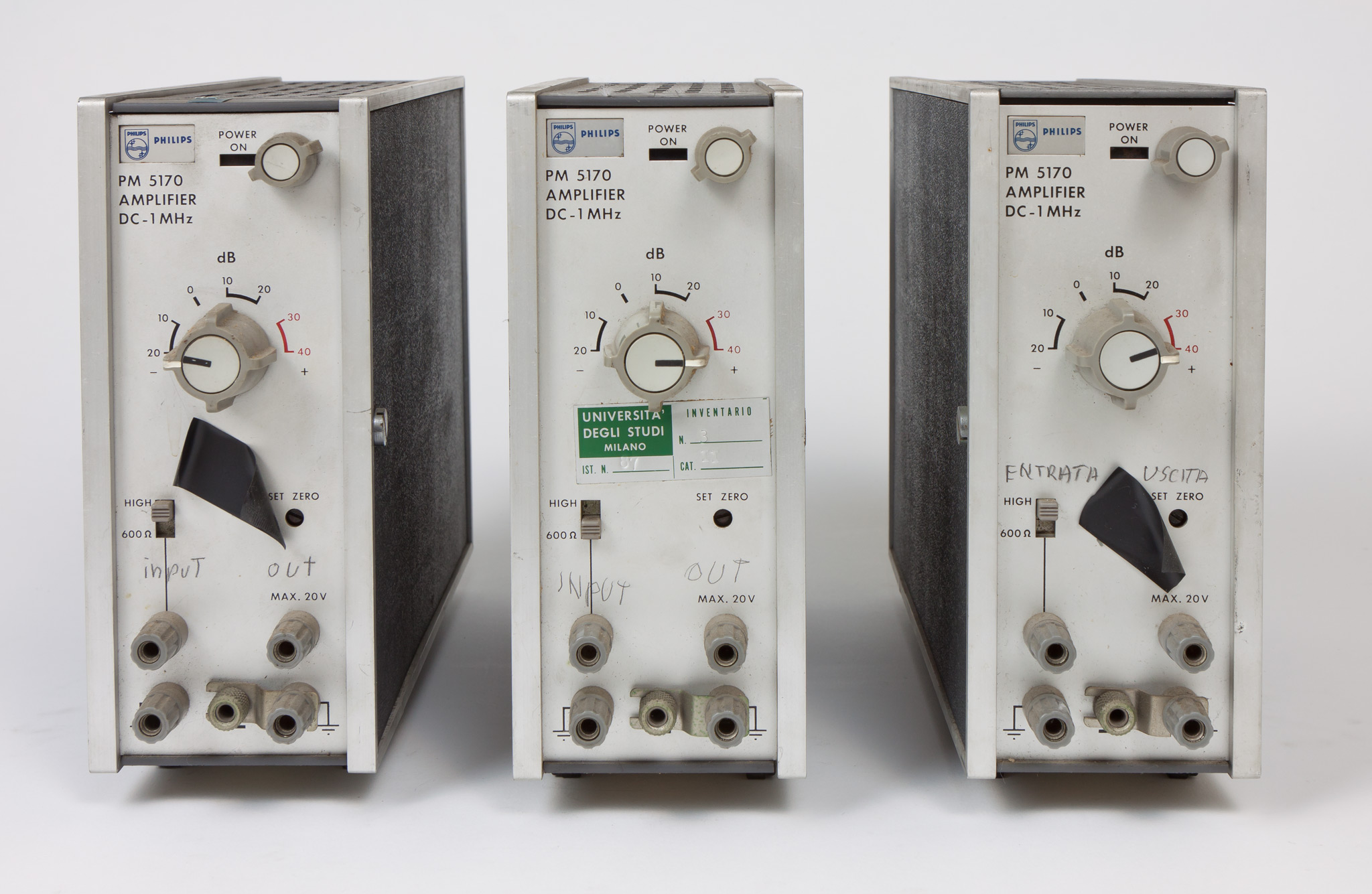 Tre amplificatori Philips PM 5170 | 7.5(w) ☓ 27.5(p) ☓ 19.5(h) | Philips | 1968 (uno dei tre) | Buono. | M701 | Università degli Studi di Milano (Ist. N. 87, Inventario N. 3, Cat. II); solo uno dei tre | |