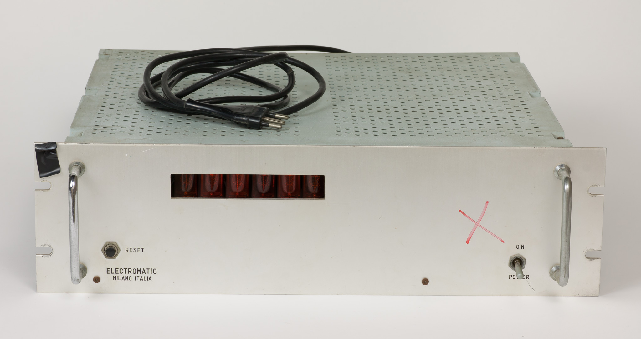 Ricevitore VLF CEI Type 301A | 48.3(w) ☓ 42.5(p) ☓ 8.7(h) | Communication Electronics Inc. (Rockville, Maryland, U.S.A.) | 1967 | Abbastanza buono. | M701 | Dovrebbe far parte del Centro di Cronometria di Merate, ma non si vede sulla foto del pannello di controllo fornita da Mazzoleni. Chiedere spiegazioni a Mazzoleni. | |