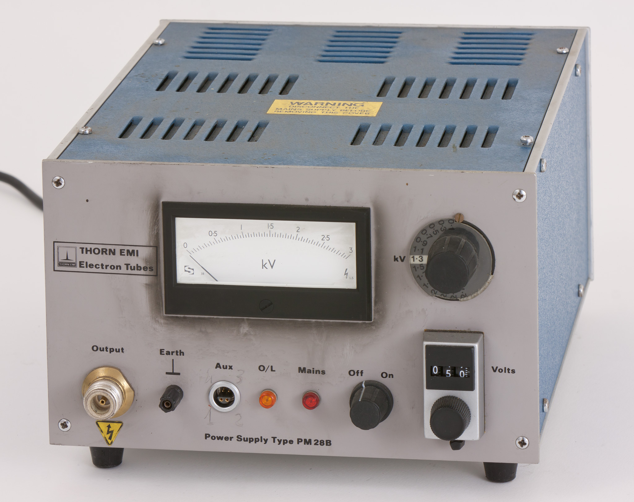 Alimentatore ad alta tensione Thorn EMI PM 28B | 28(w) ☓ 21.5(p) ☓ 14.5(h) | Thorn EMI Electron Tubes (England) | Buono; probabilmente funzionante. | M591 | Se la tensione di lavoro era 1750 V, come mai è regolato su 1350 V? | ||