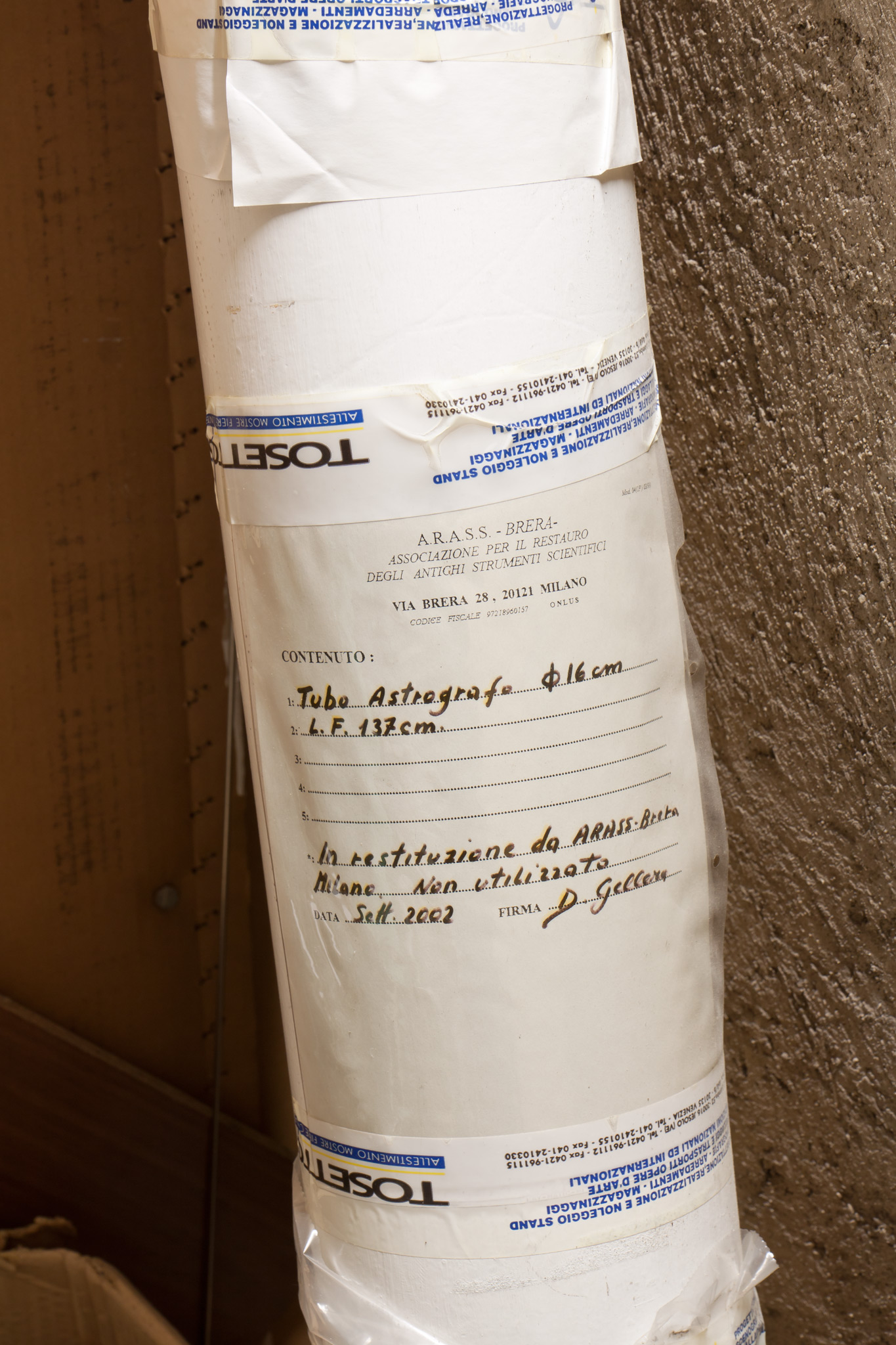 Tubo astrografo Ø 16 cm L.F. 137 cm. In restituzione da ARASS-Brera Milano.