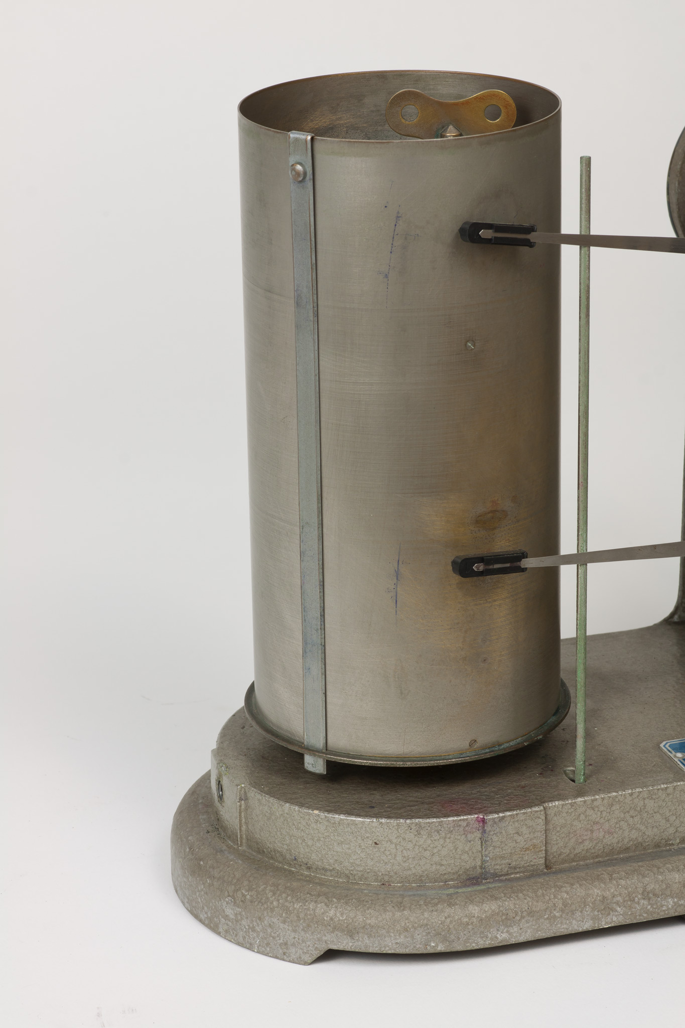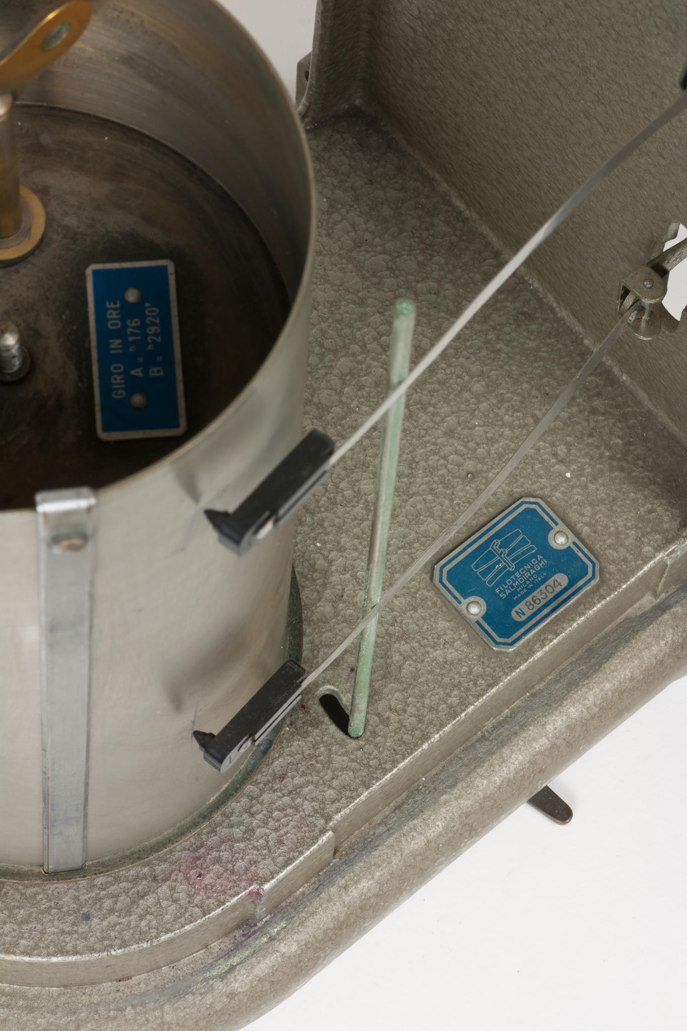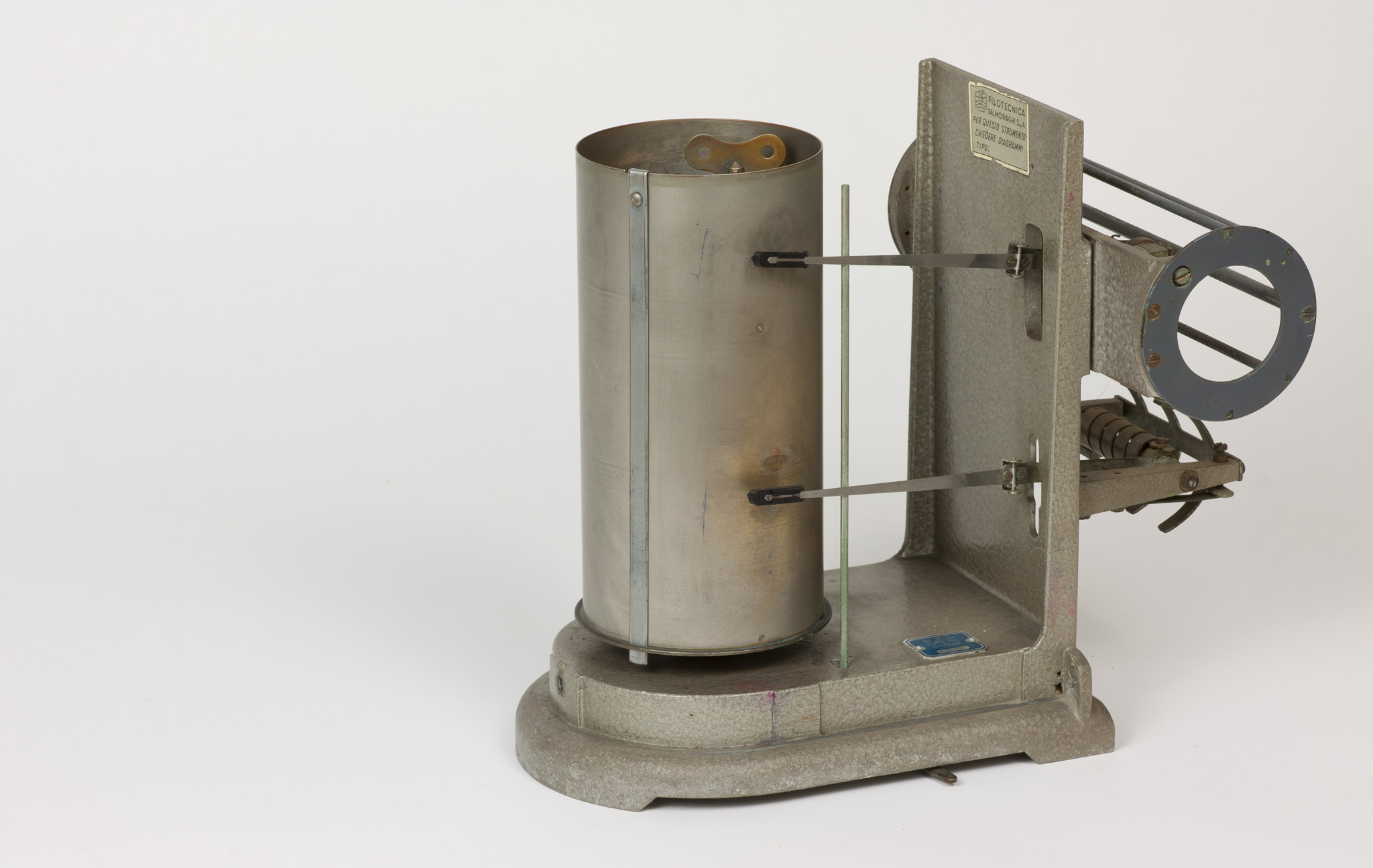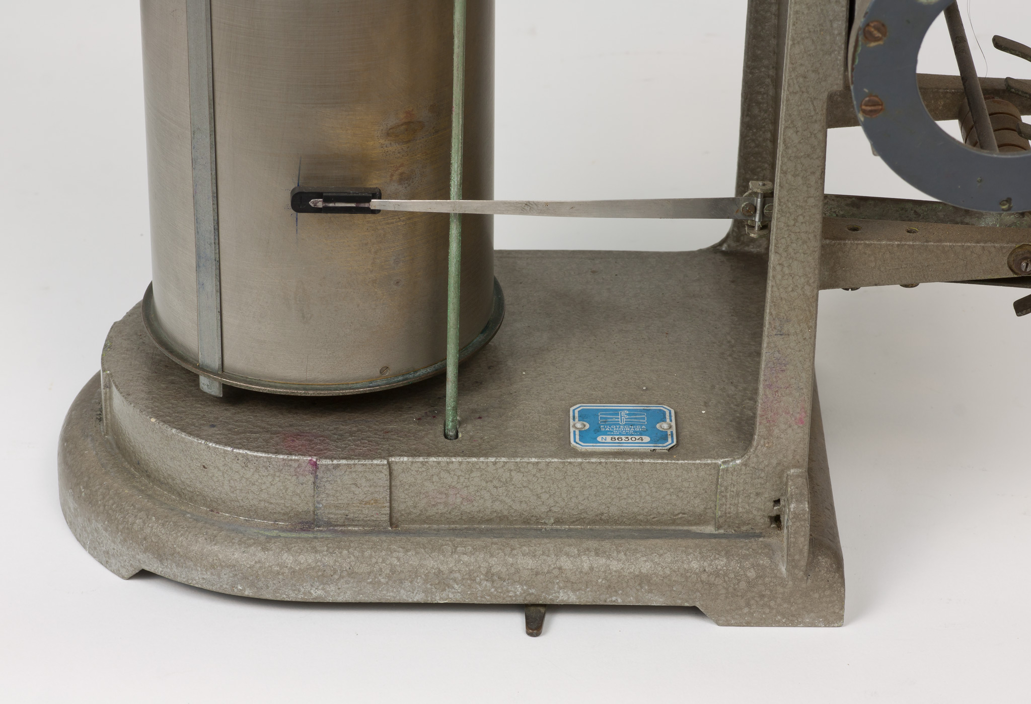 La velocità di rotazione può essere selezionata scegliendo tra due valori che corrispondono approssimativamente a una rotazione completa del cilindro in una settimana oppure in un giorno. In realtà, come riportato su una targhetta posta nella parte superiore del cilindro, la durata di una rivoluzione completa è un po' superiore, rispettivamente 7.33 giorni (posizione A) o 29.20 ore (posizione B), sia per dare un certo margine di tempo a chi deve cambiare la carta, sia perché una piccola parte della carta non è scrivibile perché coperta dalla lamina metallica che fissa il foglio al tamburo. La selezione della velocità si fa spostando il pignone dentato tra i due alberi motori che sporgono dalla base inferiore del cilindro e che ruotano a velocità diverse, contrassegnati con le lettere A e B. Lo strumento veniva usato con carta da grafico stampata appositamente, con le divisioni dei tempi sull'asse delle ascisse poste alla distanza esatta richiesta dalla velocità di rotazione e con le indicazioni dei giorni della settimana o delle ore del giorno, e con gli assi delle ordinate non rettilinei ma tracciati secondo un arco di cerchio, in modo da seguire la traiettoria curva del braccio del pennino attorno al suo fulcro (vedi scheda 45).