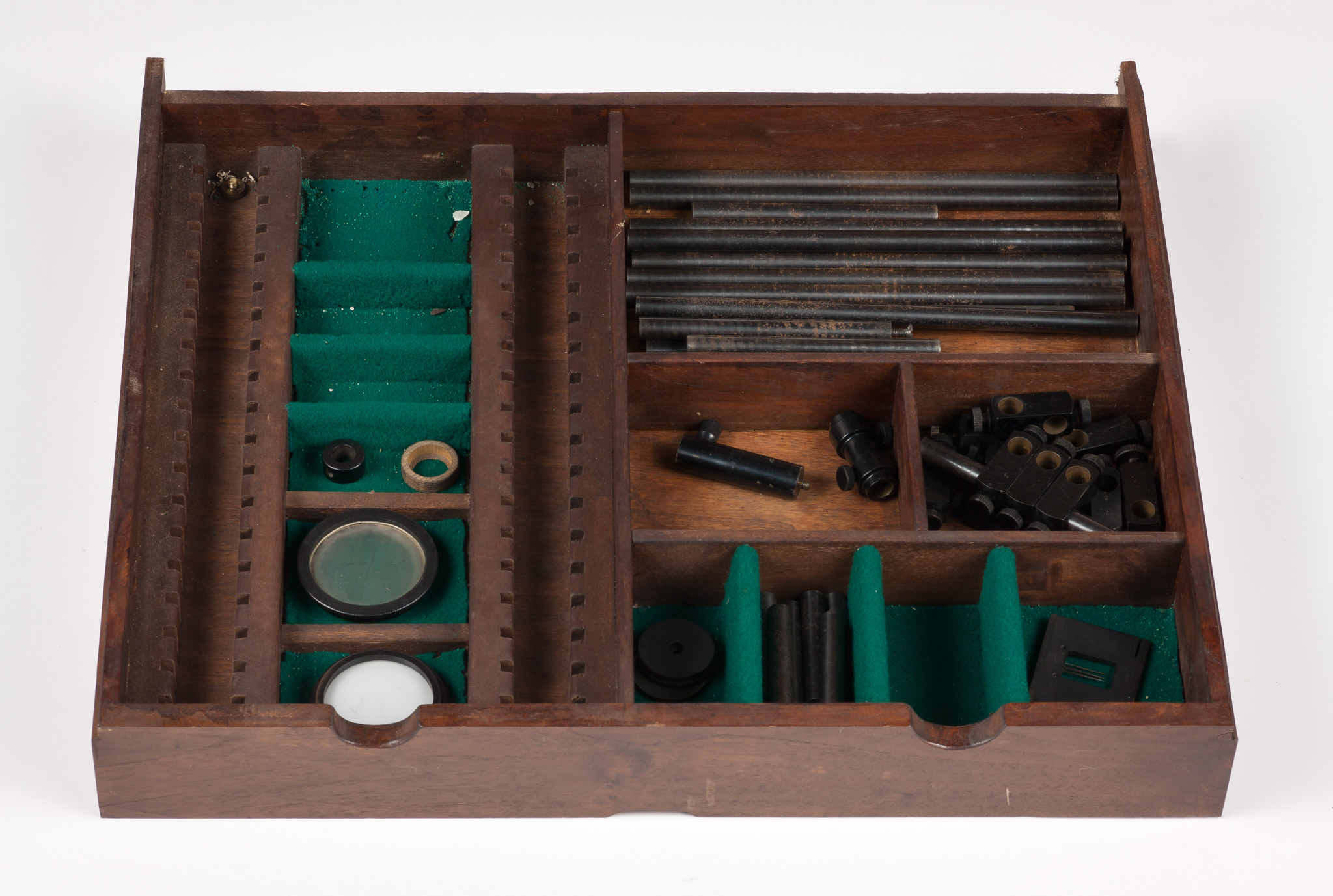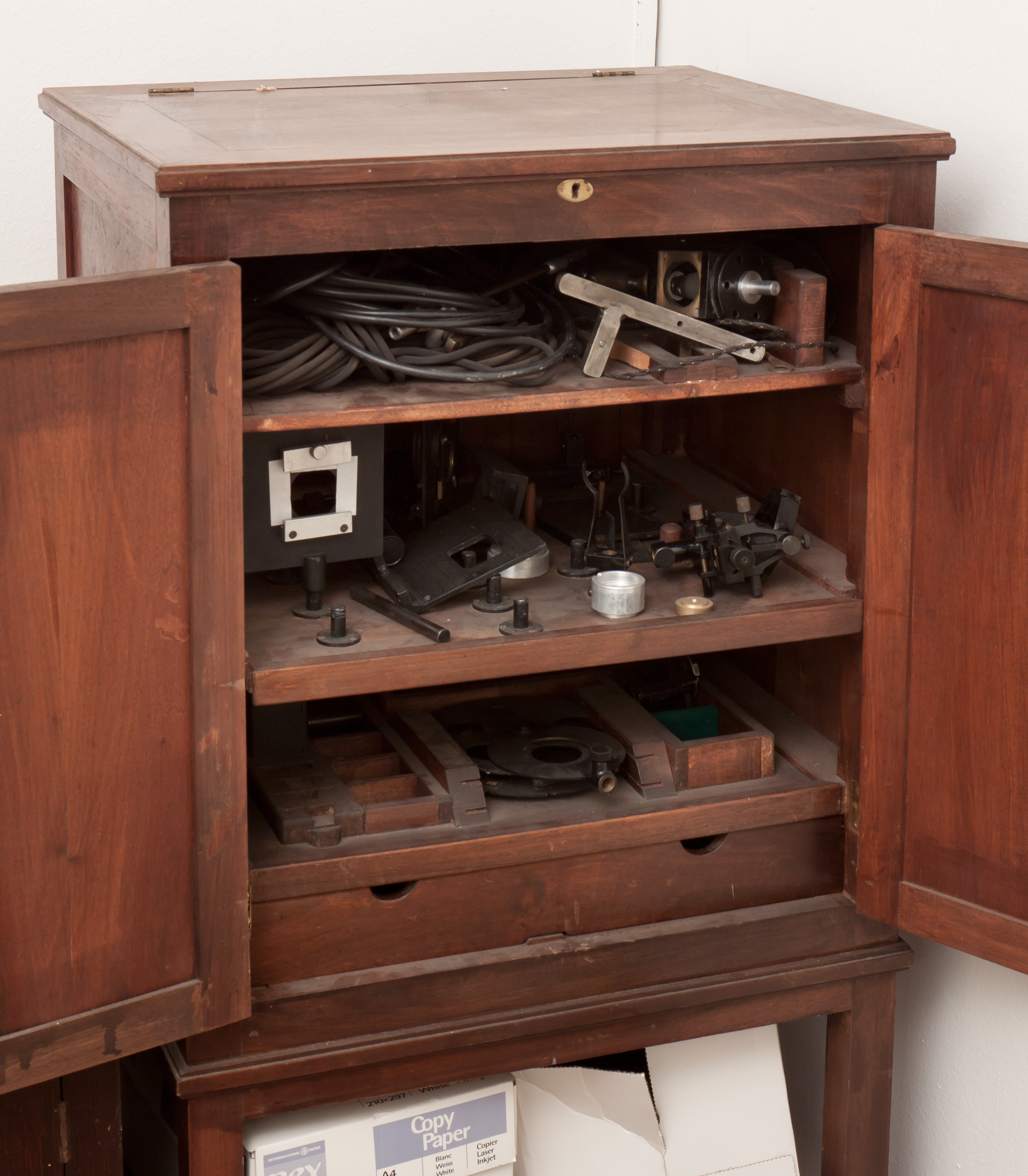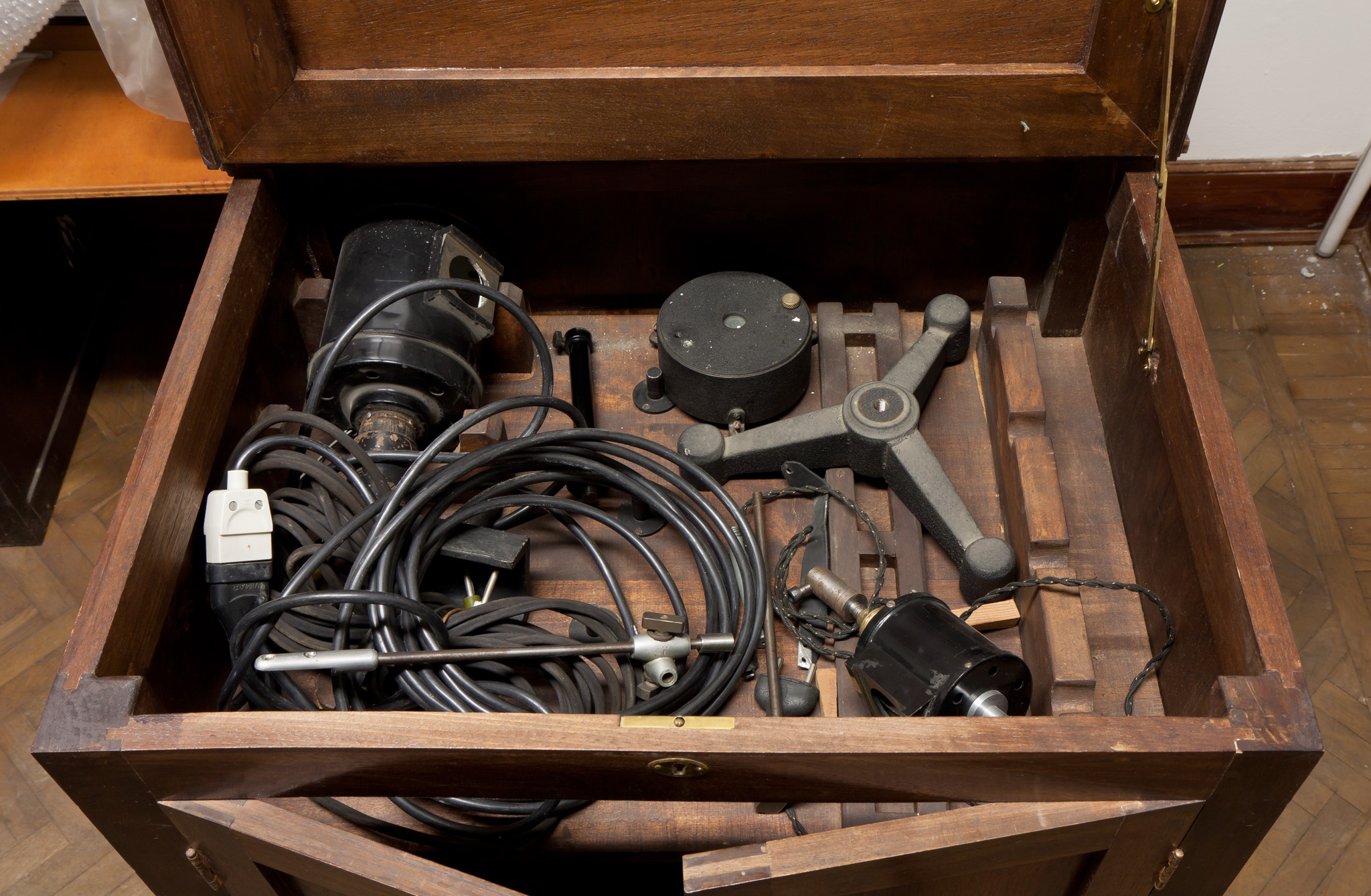 - Armadietto in legno contenente accessori per un banco ottico; parte