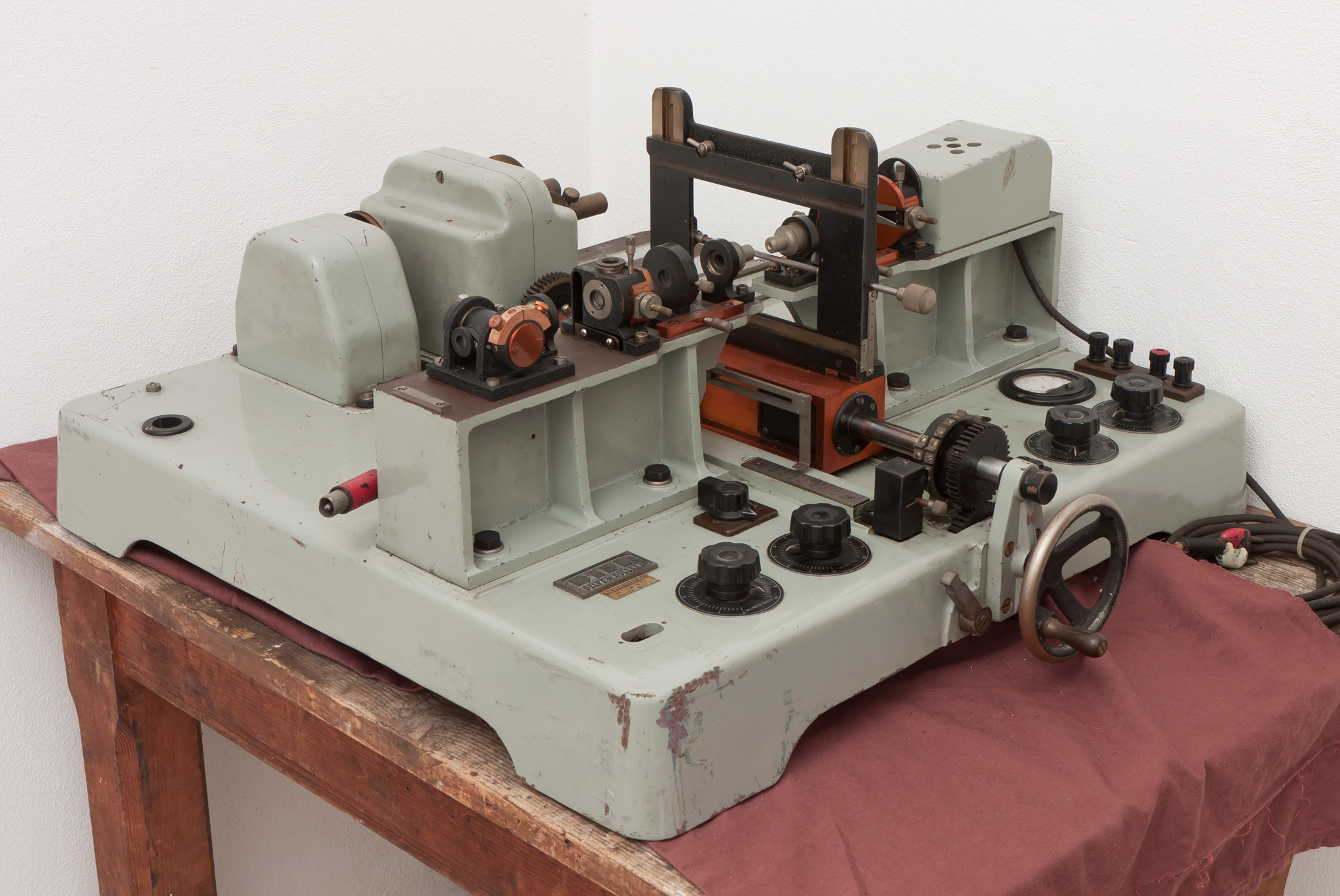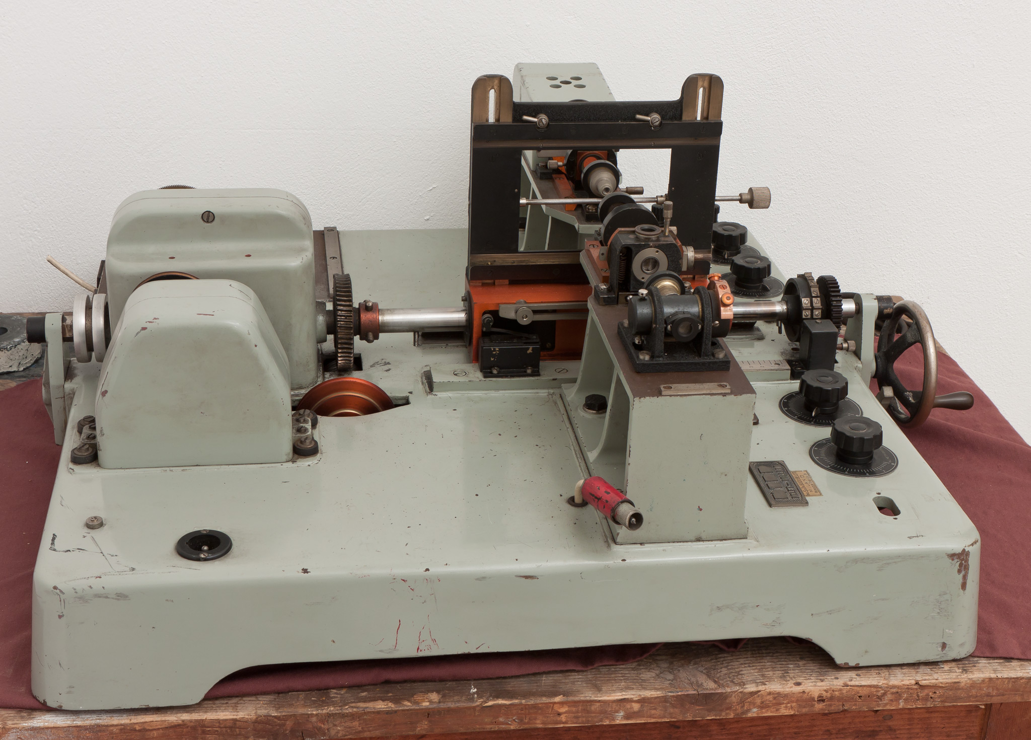 per l'analisi di spettrogrammiUn raggio luminoso, proveniente da una lampada ad incandescenza, cade, attraverso alla lastra fotografica da analizzare, su una termocoppia o su una pila termoelettrica. La corrente termoelettrica attraversa un galvanometro a bobina mobile, le cui deviazioni vengono registrate fotograficamente su un foglio di carta sensibile avvolta su un tamburo. Lo spostamento del porta-lastre e la rotazione simultanea del tamburo permettono di ottenere il diagramma dei dettagli dello spettro in esame. - Il tipo A1 é specialmente adatto per lavori di alta precisione. Tale apparecchio risolve i più fini dettagli dello spettro ed assicura un'alta precisione nella misura delle distanze delle linee. Inoltre quest'apparecchio ha una grande rapidità e permette di ottenere, in qualche minuto soltanto, la registrazione di uno spettro con centinaia di linee. L'errore della vite micrometrica che trasporta il carrello col porta-lastre, é minore di 0,001 mm. Lo spostamento della lastra é strettamente proporzionale alla rotazione del tamburo registratore. - Il tipo B é più semplice e specialmente adatto per l'esame di spettri le cui linee non siano troppo sottili, per es. gli spettri di raggi X e spettri di assorbimento di sostanze solide e liquide.