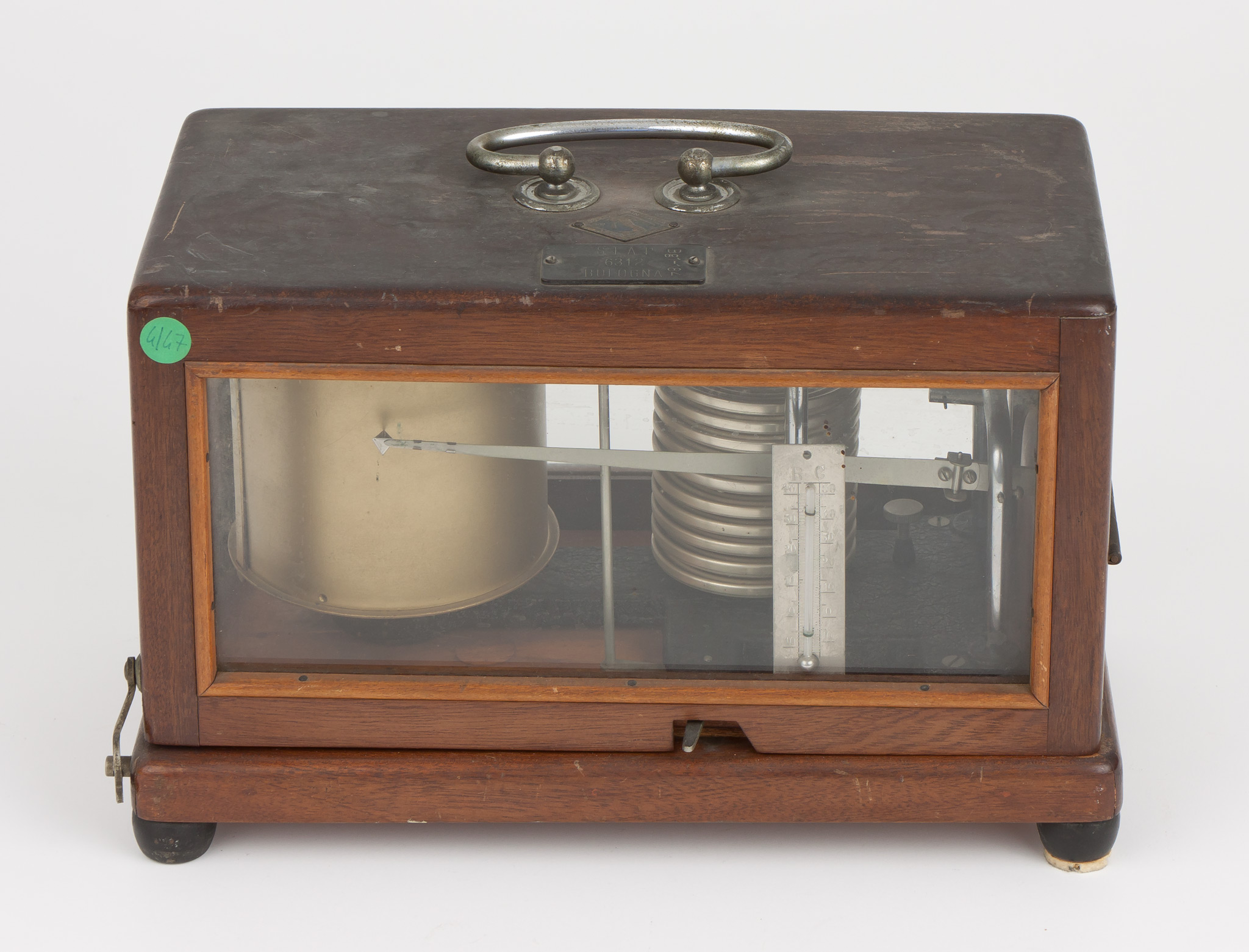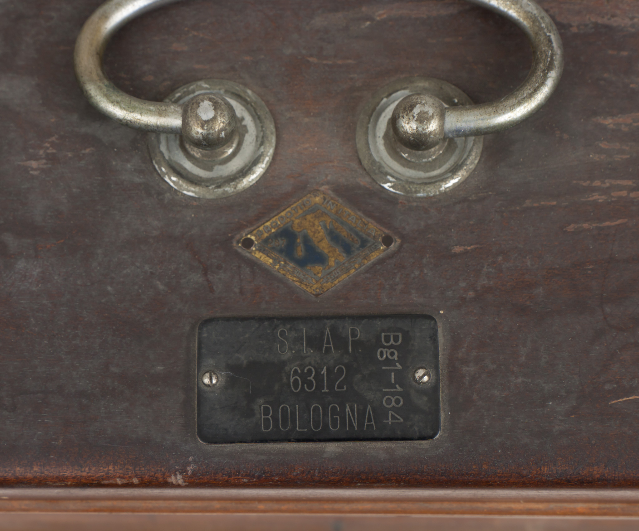 - Barografo con struttura esterna in legno. La targhetta metallica sulla parte superiore del coperchio riporta: S.I.A.P. / 6312 / BOLOGNA e, trasversalmente, Bg1-184.
