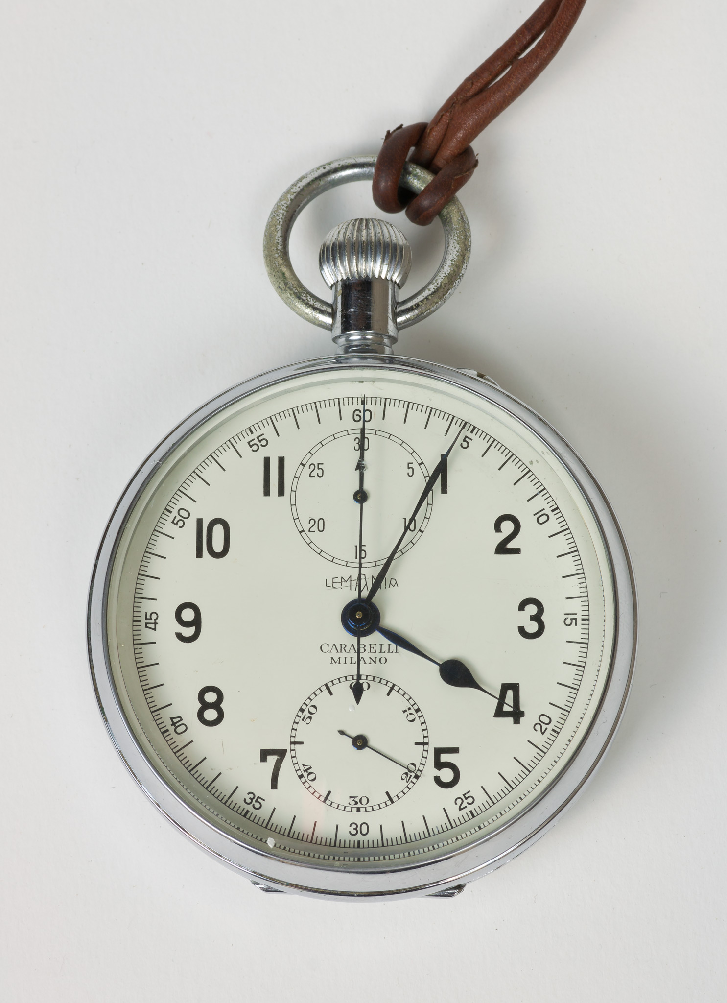 Note di Pietro Broglia.Risale alla seconda metà del novecento. Il quadrante porta le iscrizioni LEMANIA e CARABELLI / MILANO. Oltre alla numerazione delle ore la gradazione principale permette di leggere, quando utilizzato come cronometro, i secondi e i quinti di secondo, mentre i minuti, fino a trenta, sono leggibili su una gradazione di minori dimensioni.