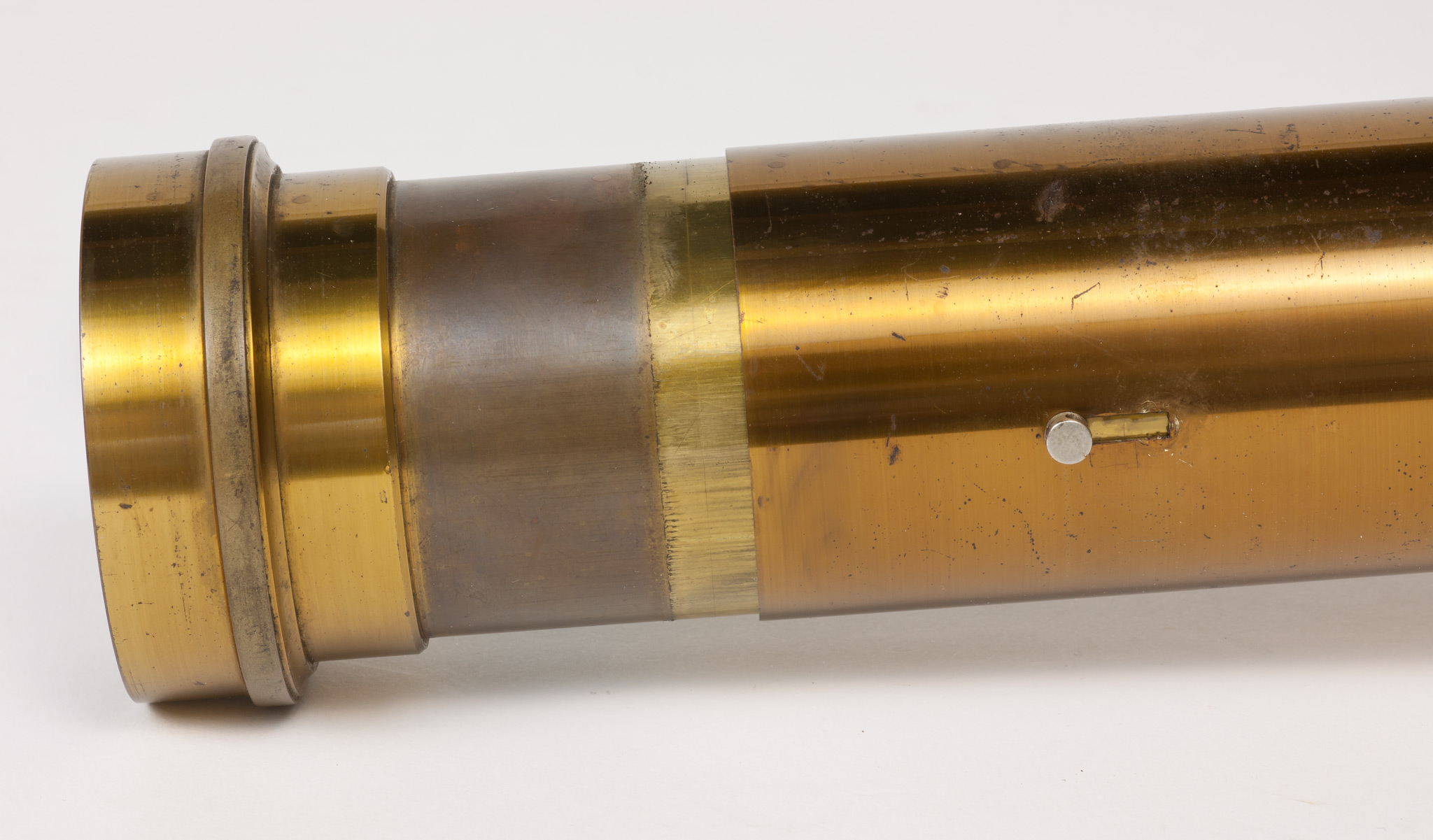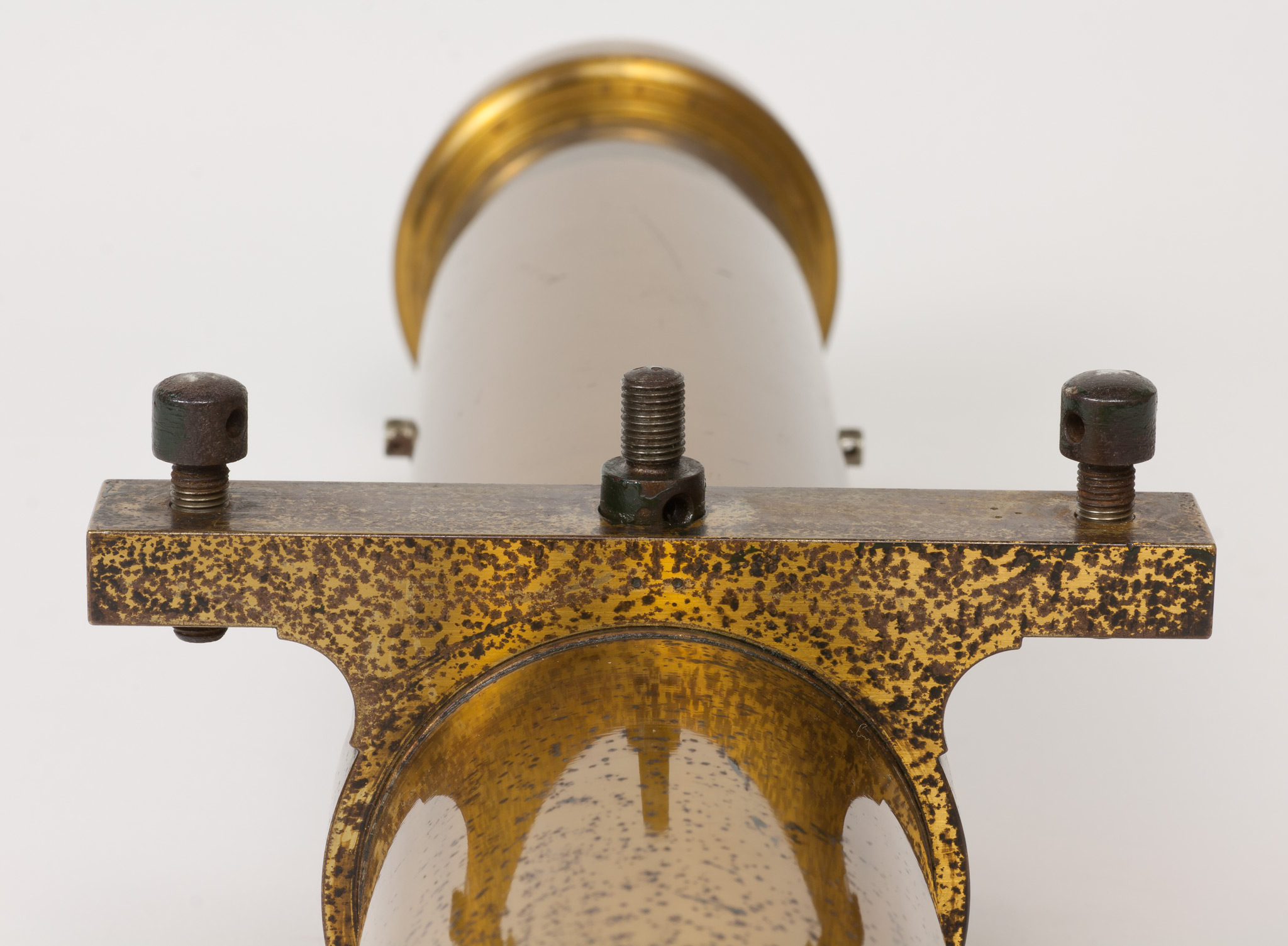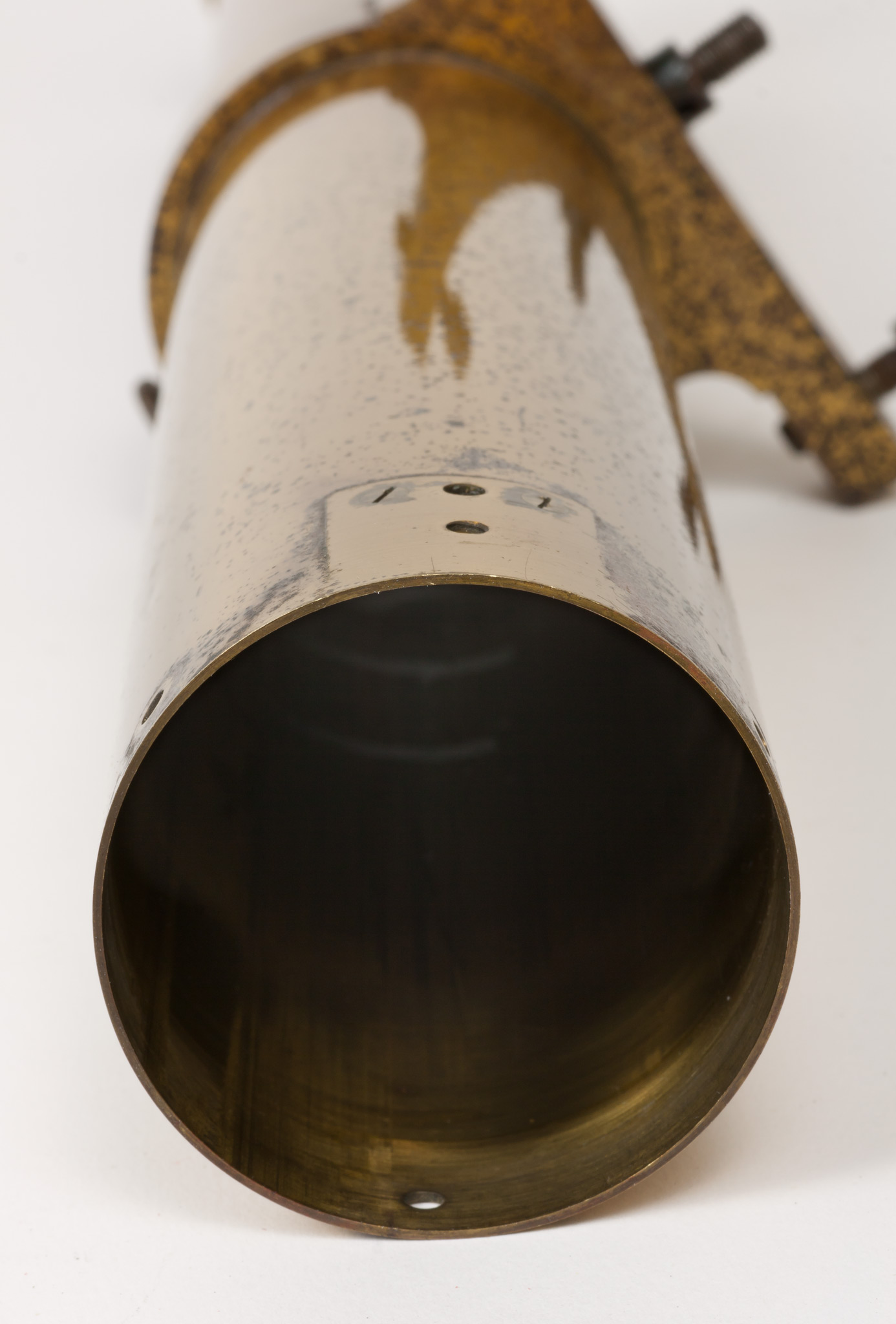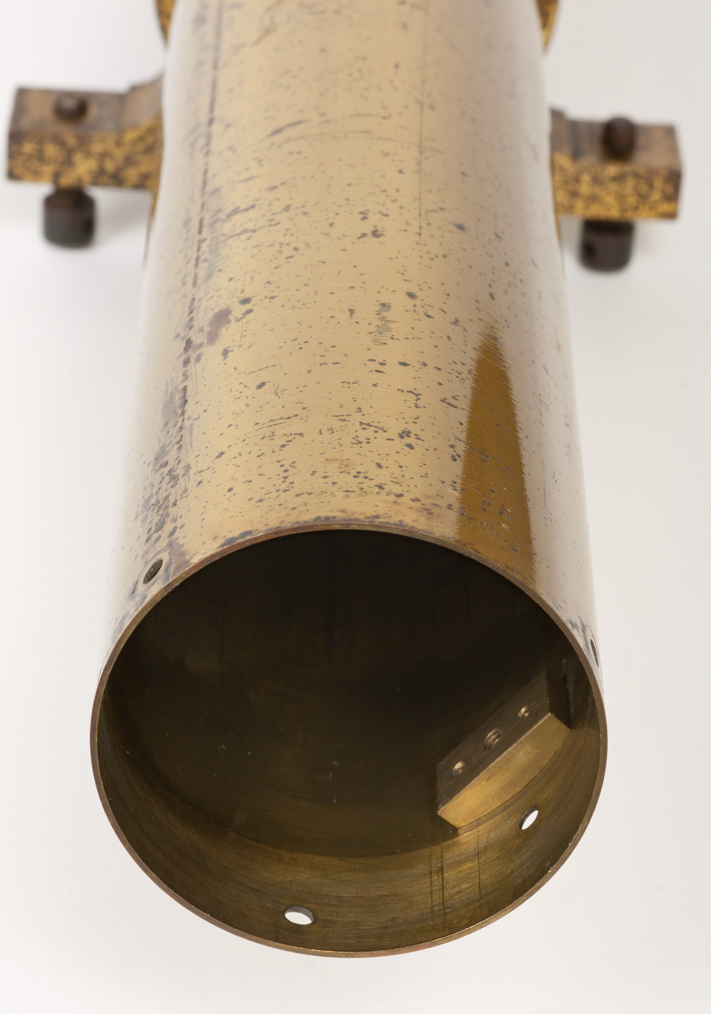 Il tubo principale, verso la sua metà, è circondato da un anello in ottone che si allarga su un lato a formare una sbarra che evidentemente serviva per fissare il tubo alla sua montatura. La sbarra porta tre grosse viti: quella centrale ha la testa posta internamente al tubo e fissa l'anello al tubo stesso. Alla testa di questa vite si accede svitando un apposito tappo a vite posto sul lato opposto dell'anello di ottone, che libera un foro di dimensioni sufficienti a farvi passare un cacciavite.