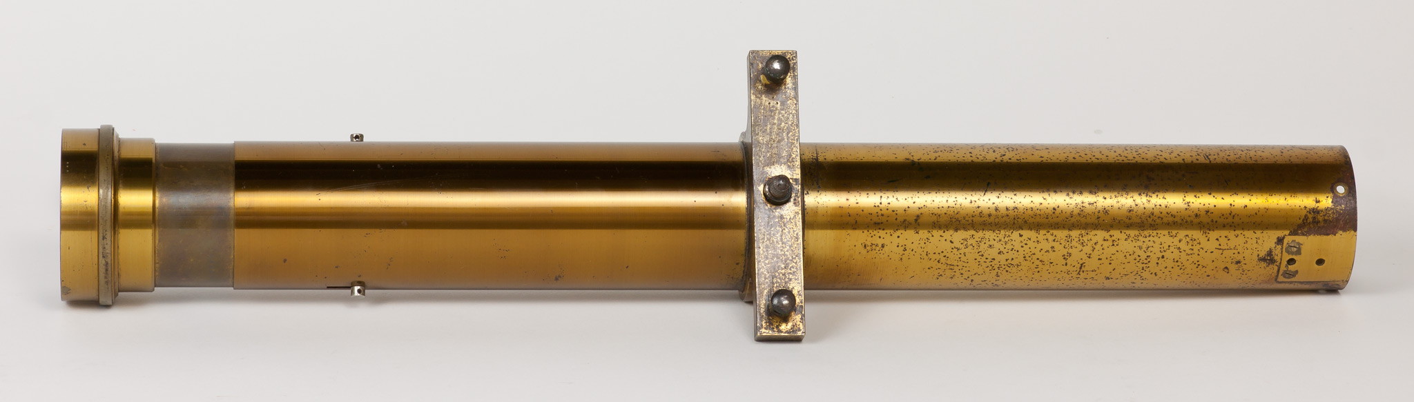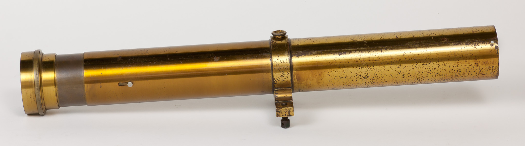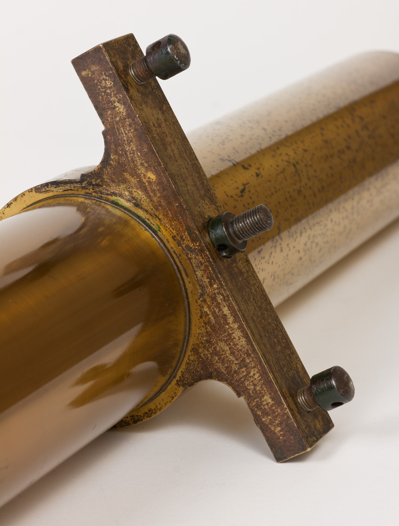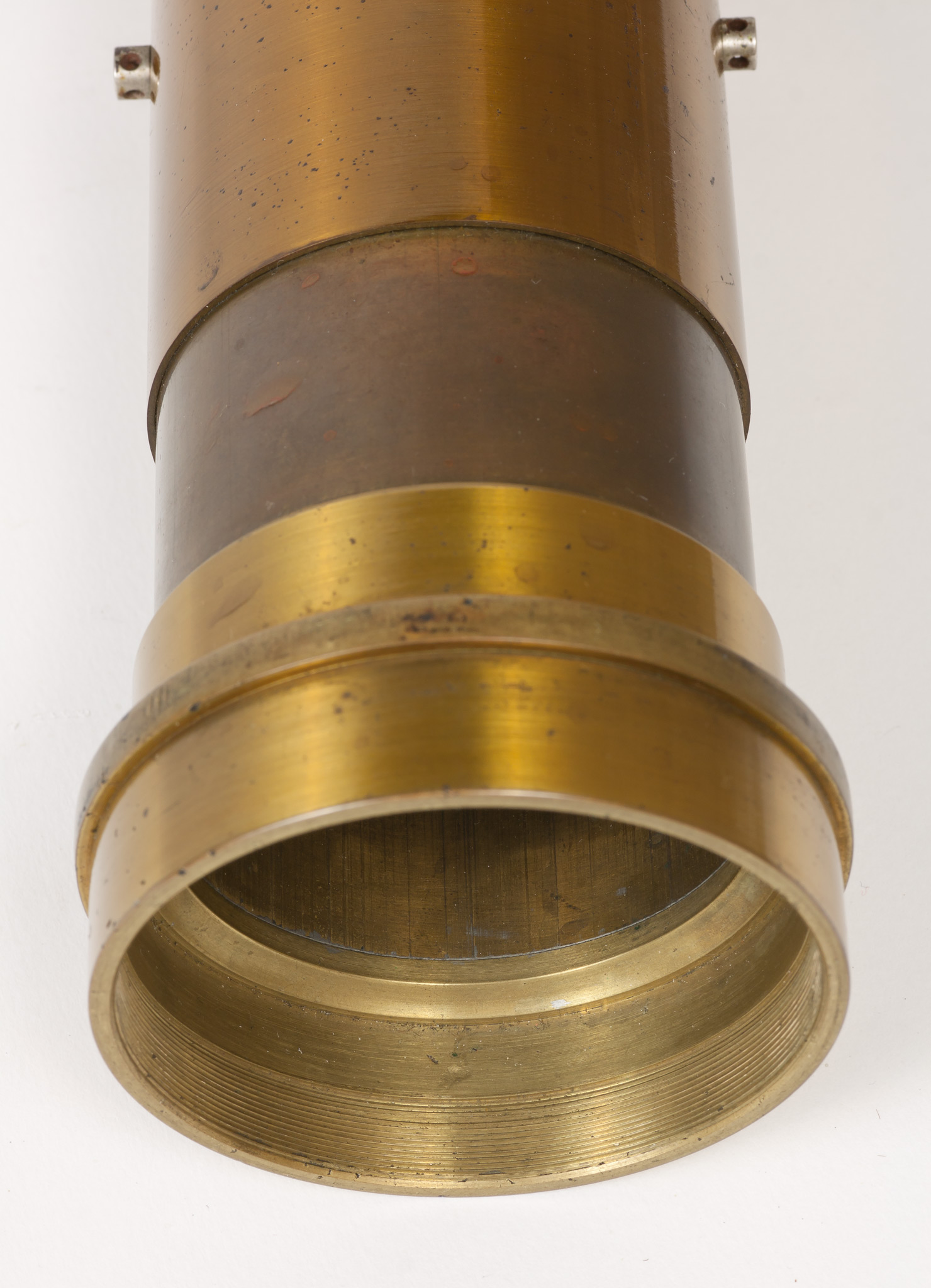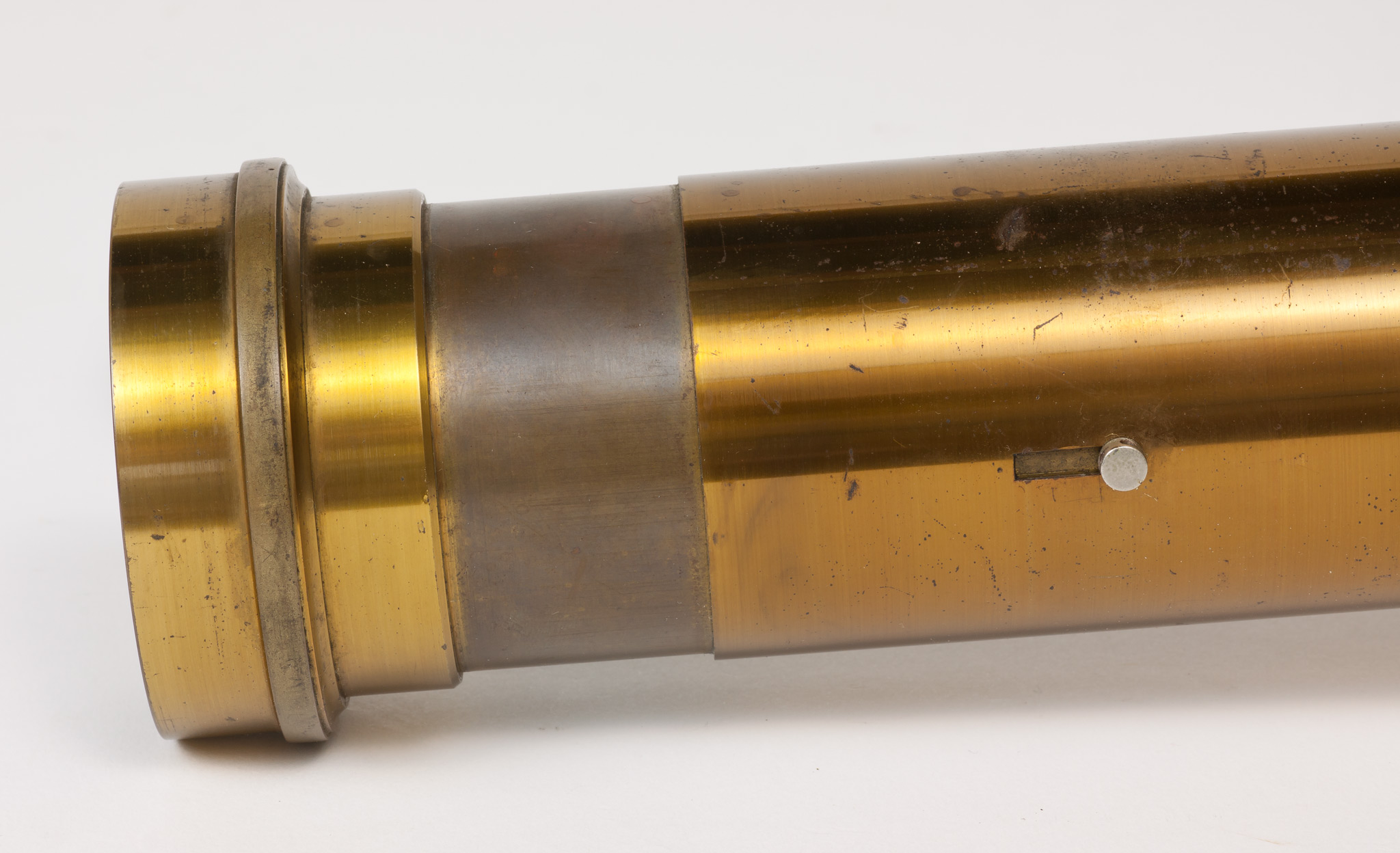 Il tubo principale, verso la sua metà, è circondato da un anello in ottone che si allarga su un lato a formare una sbarra che evidentemente serviva per fissare il tubo alla sua montatura. La sbarra porta tre grosse viti: quella centrale ha la testa posta internamente al tubo e fissa l'anello al tubo stesso. Alla testa di questa vite si accede svitando un apposito tappo a vite posto sul lato opposto dell'anello di ottone, che libera un foro di dimensioni sufficienti a farvi passare un cacciavite.