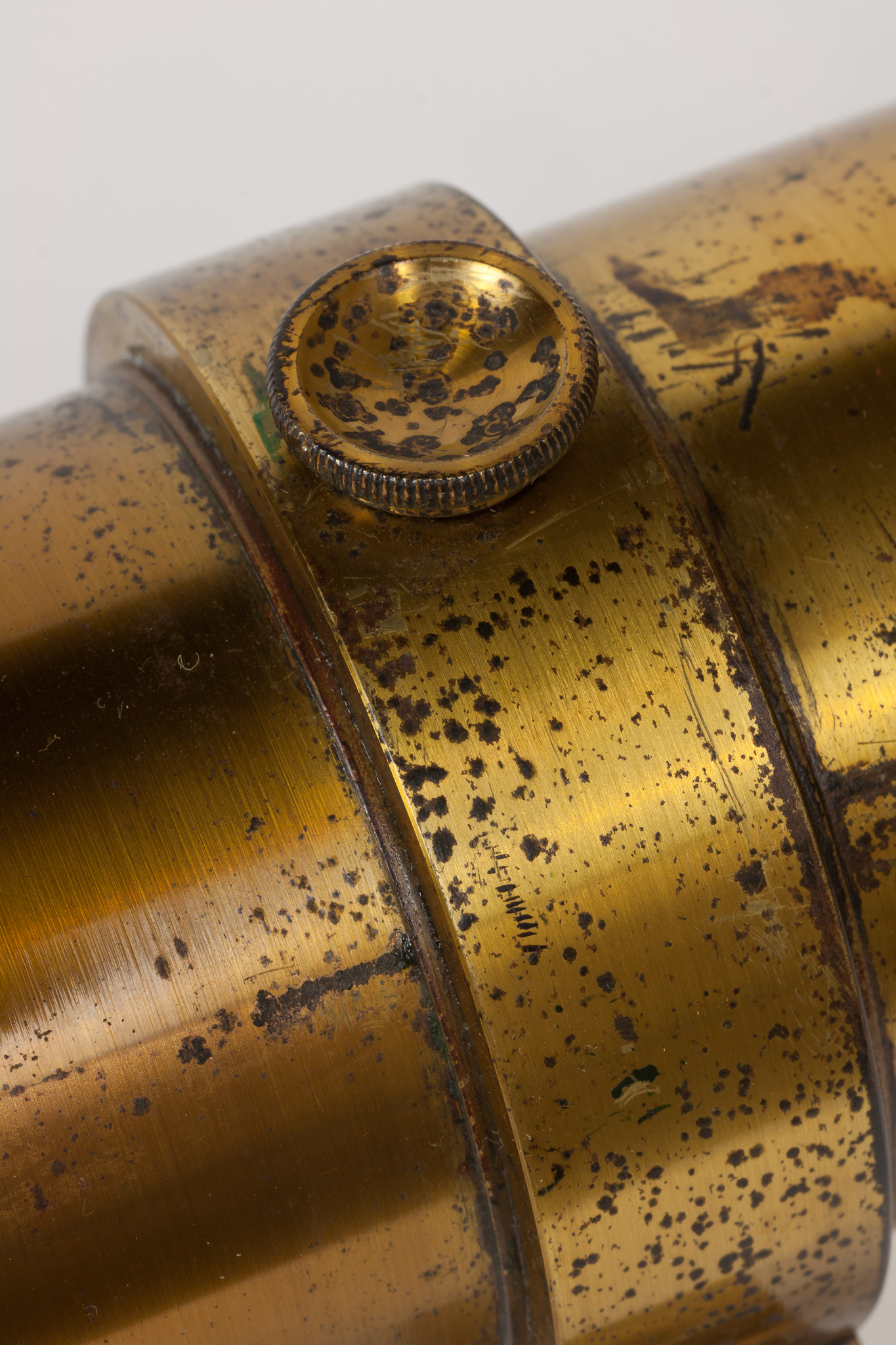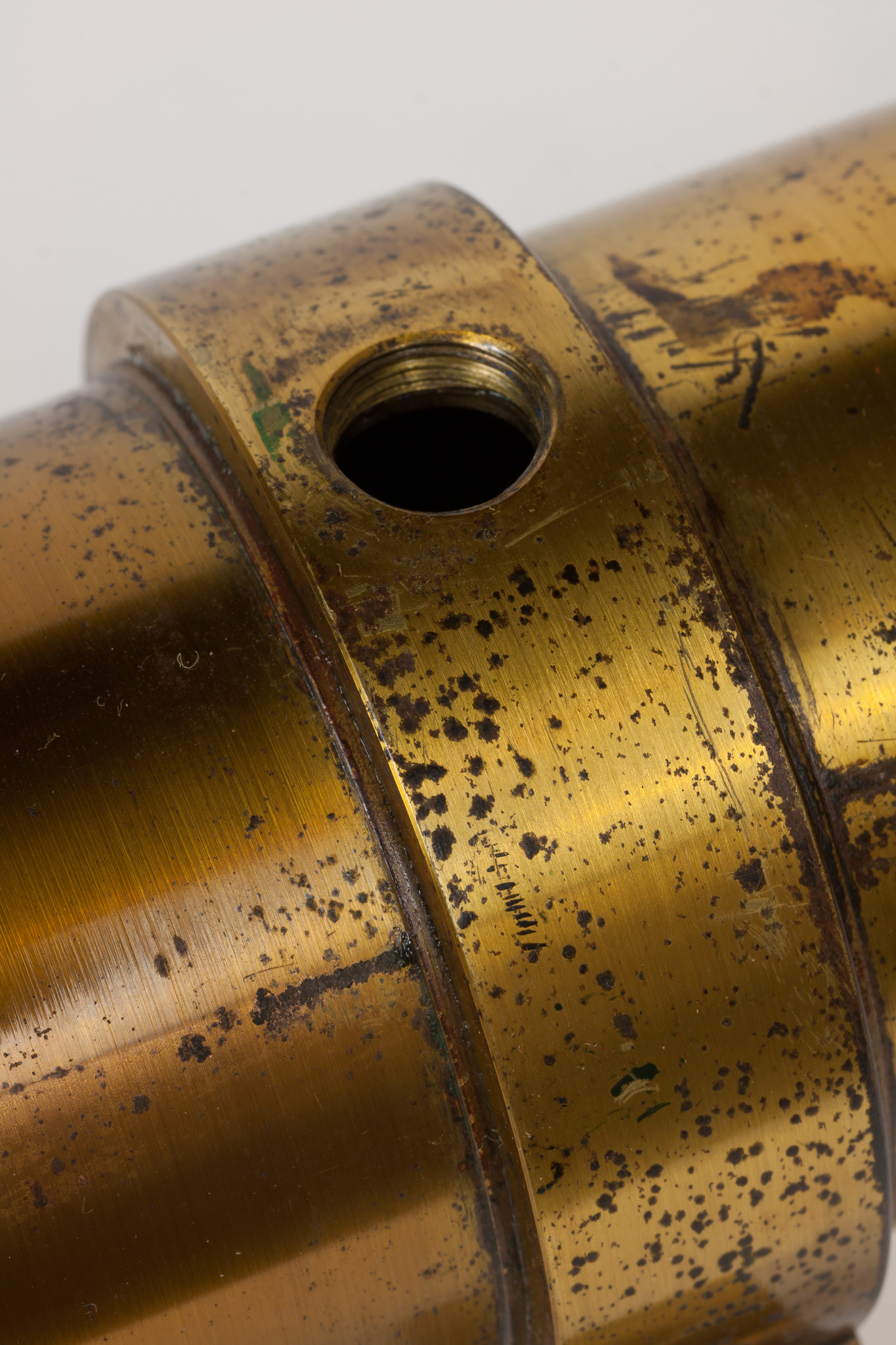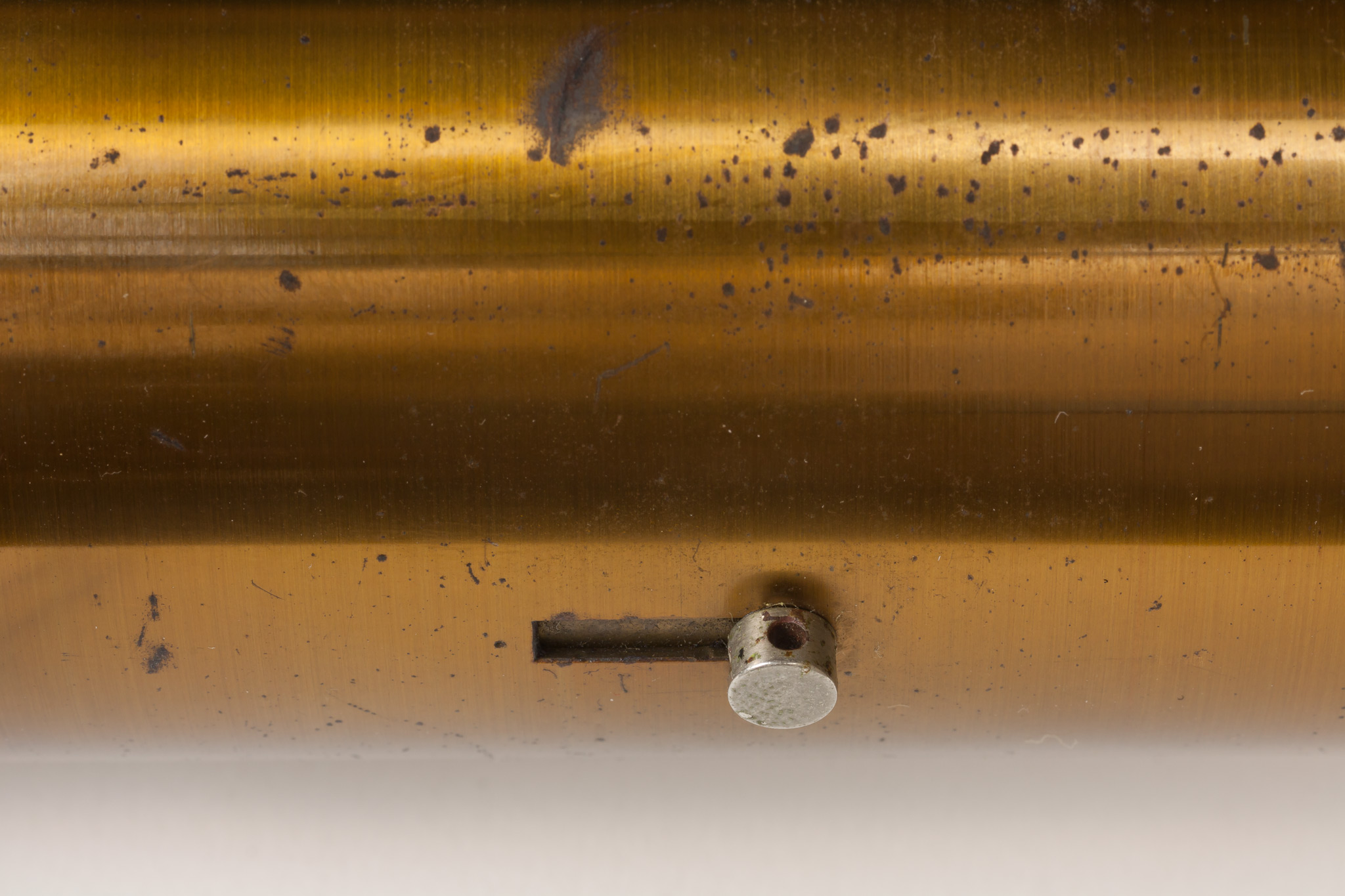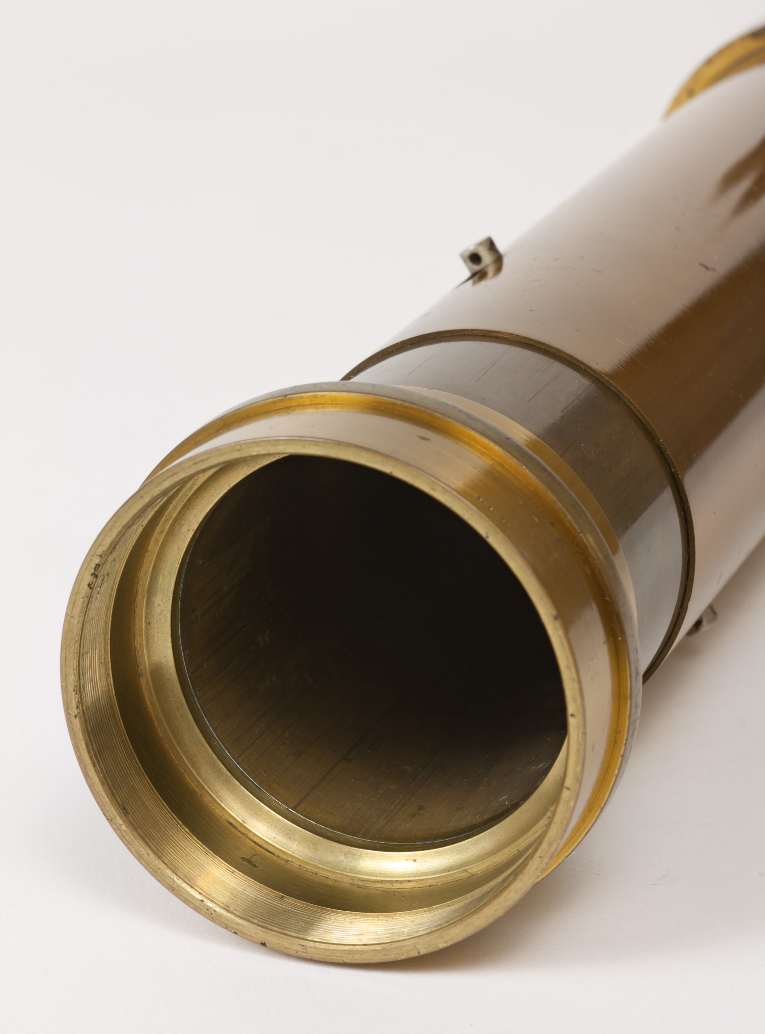 Il tubo principale, verso la sua metà, è circondato da un anello in ottone che si allarga su un lato a formare una sbarra che evidentemente serviva per fissare il tubo alla sua montatura. La sbarra porta tre grosse viti: quella centrale ha la testa posta internamente al tubo e fissa l'anello al tubo stesso. Alla testa di questa vite si accede svitando un apposito tappo a vite posto sul lato opposto dell'anello di ottone, che libera un foro di dimensioni sufficienti a farvi passare un cacciavite.