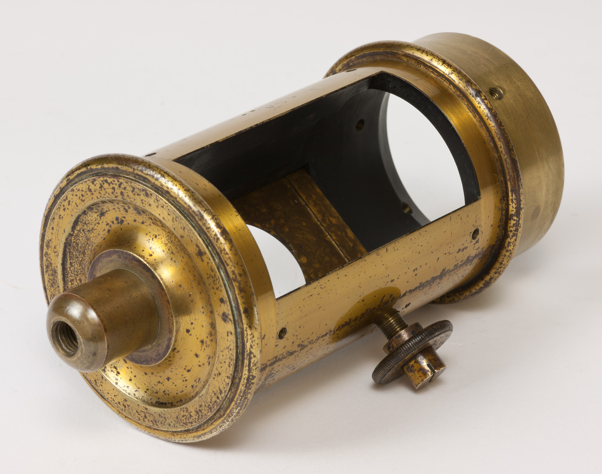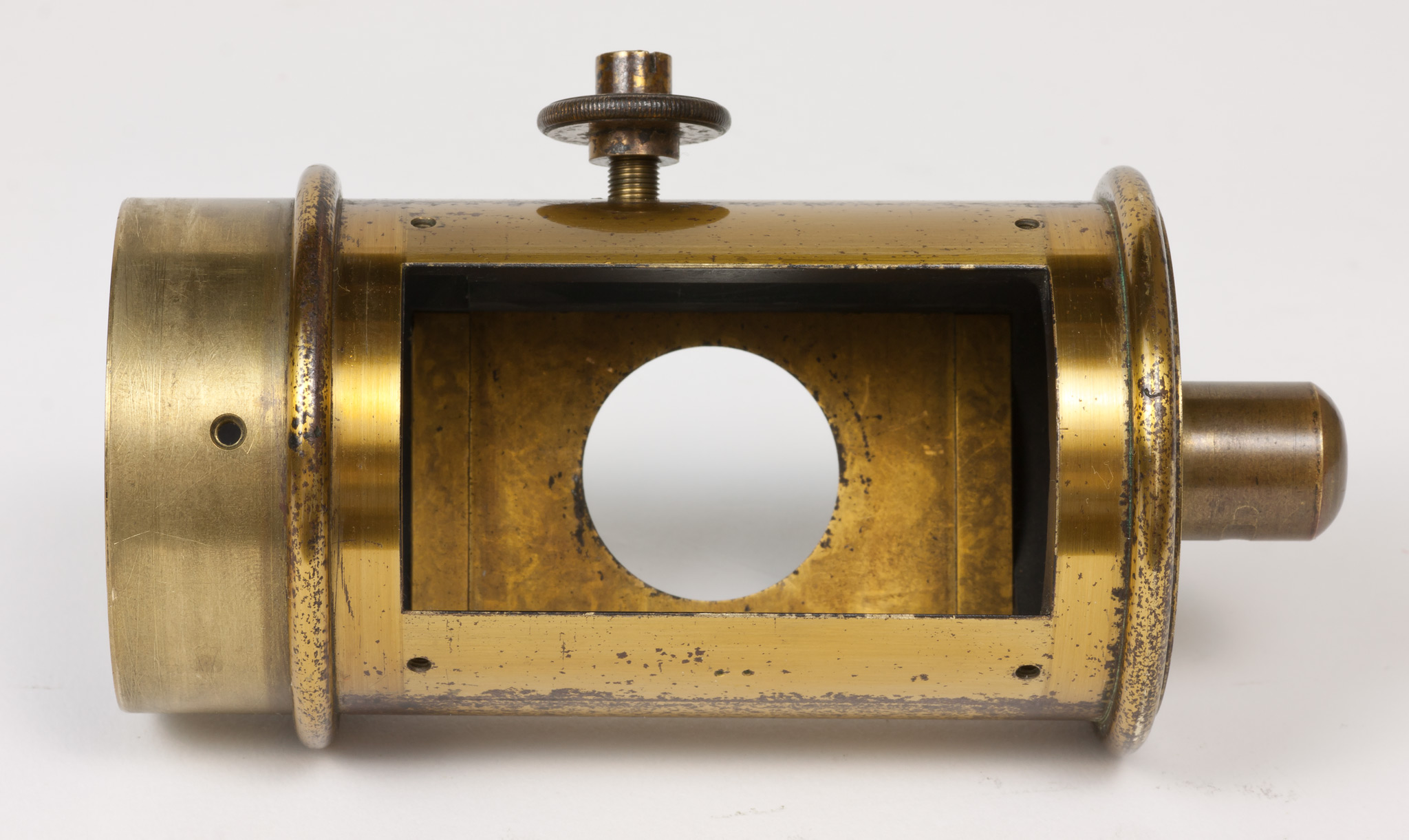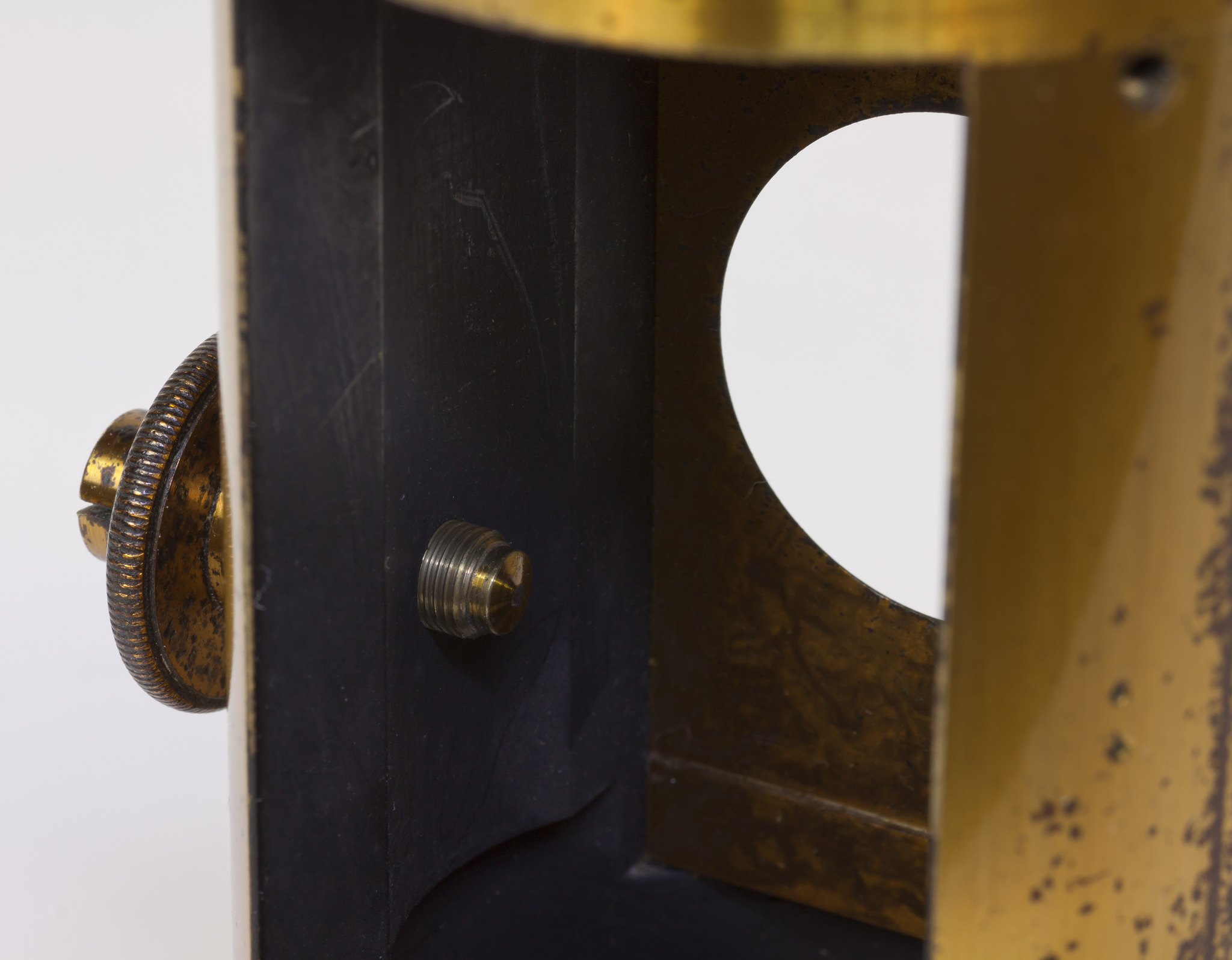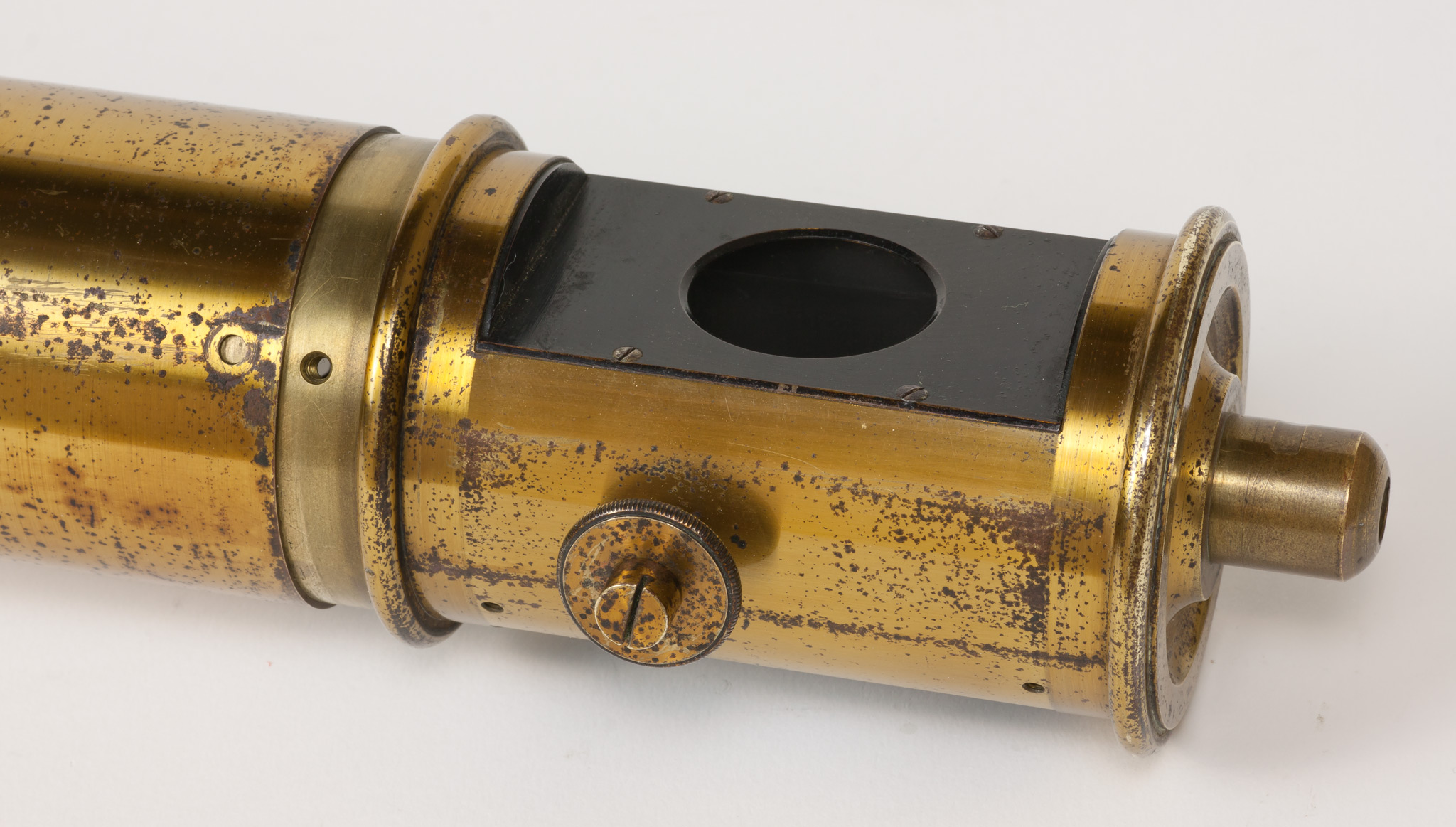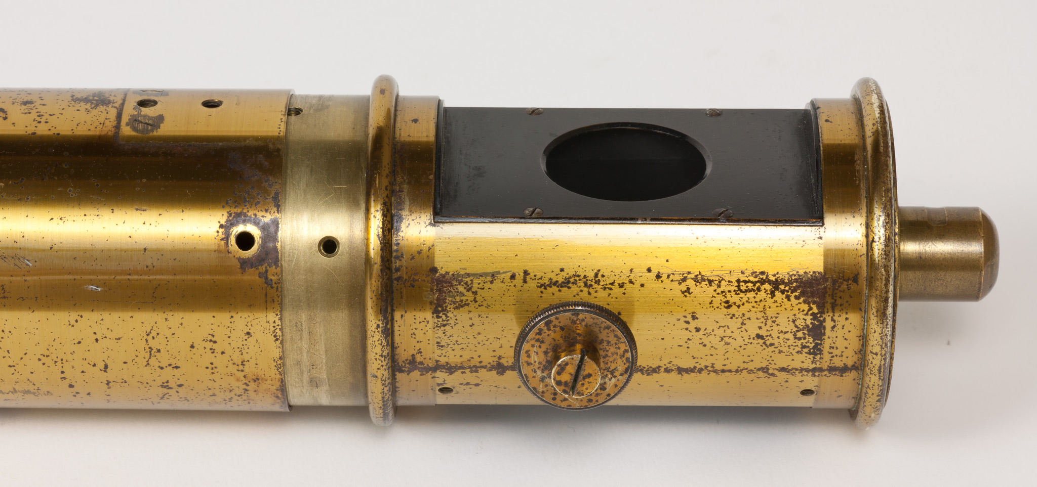 Sulla parete del tubo intermedia tra le due finestre c'è un foro filettato entro cui si avvita una grossa vite dotata di un fermo, avvitabile separatamente per mezzo di un dicso dal bordo zigrinato. La vite termina all'interno del tubo con una punta smussata che evidentemente serviva a premere e a tenere bloccato qualche dispositivo.