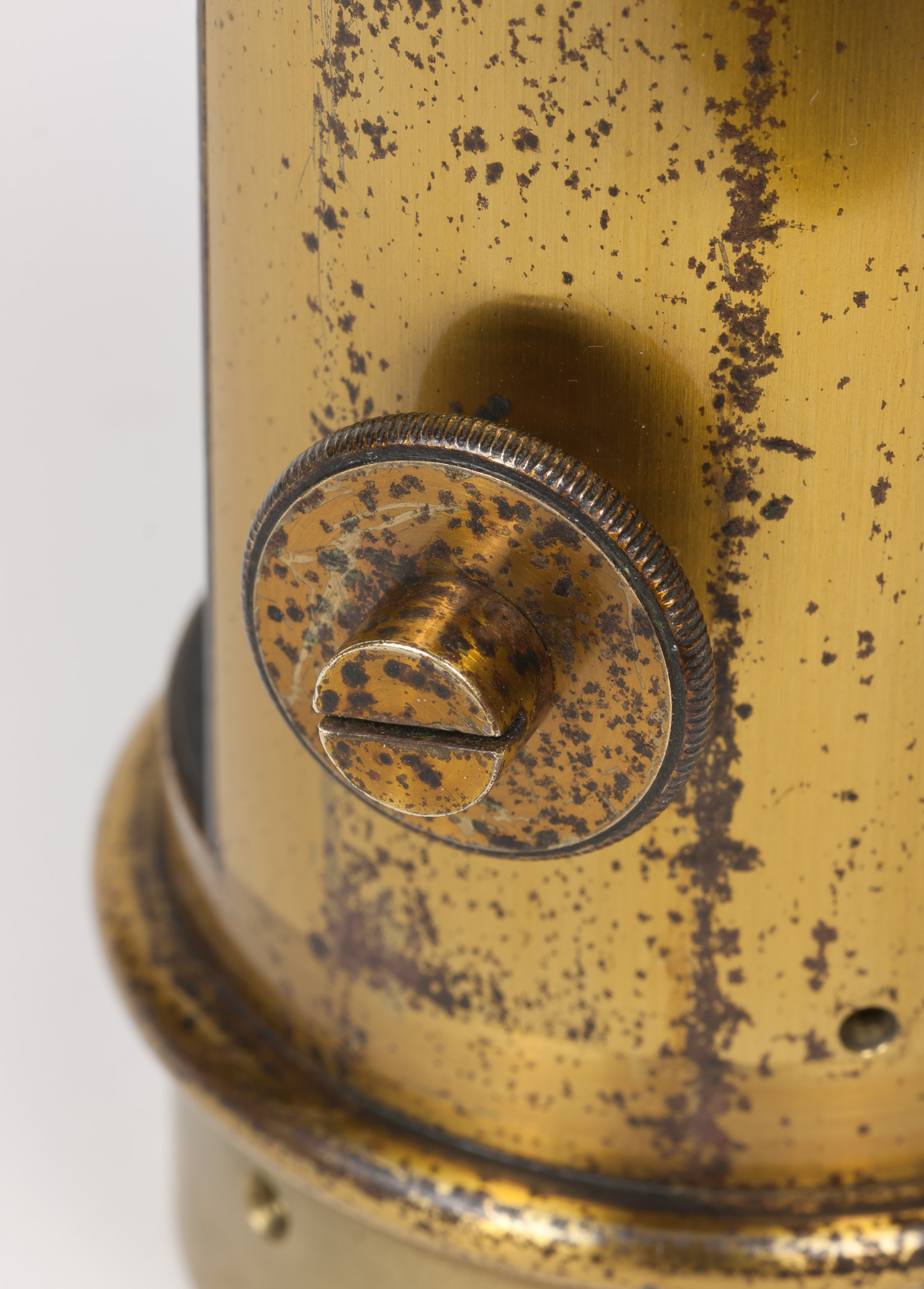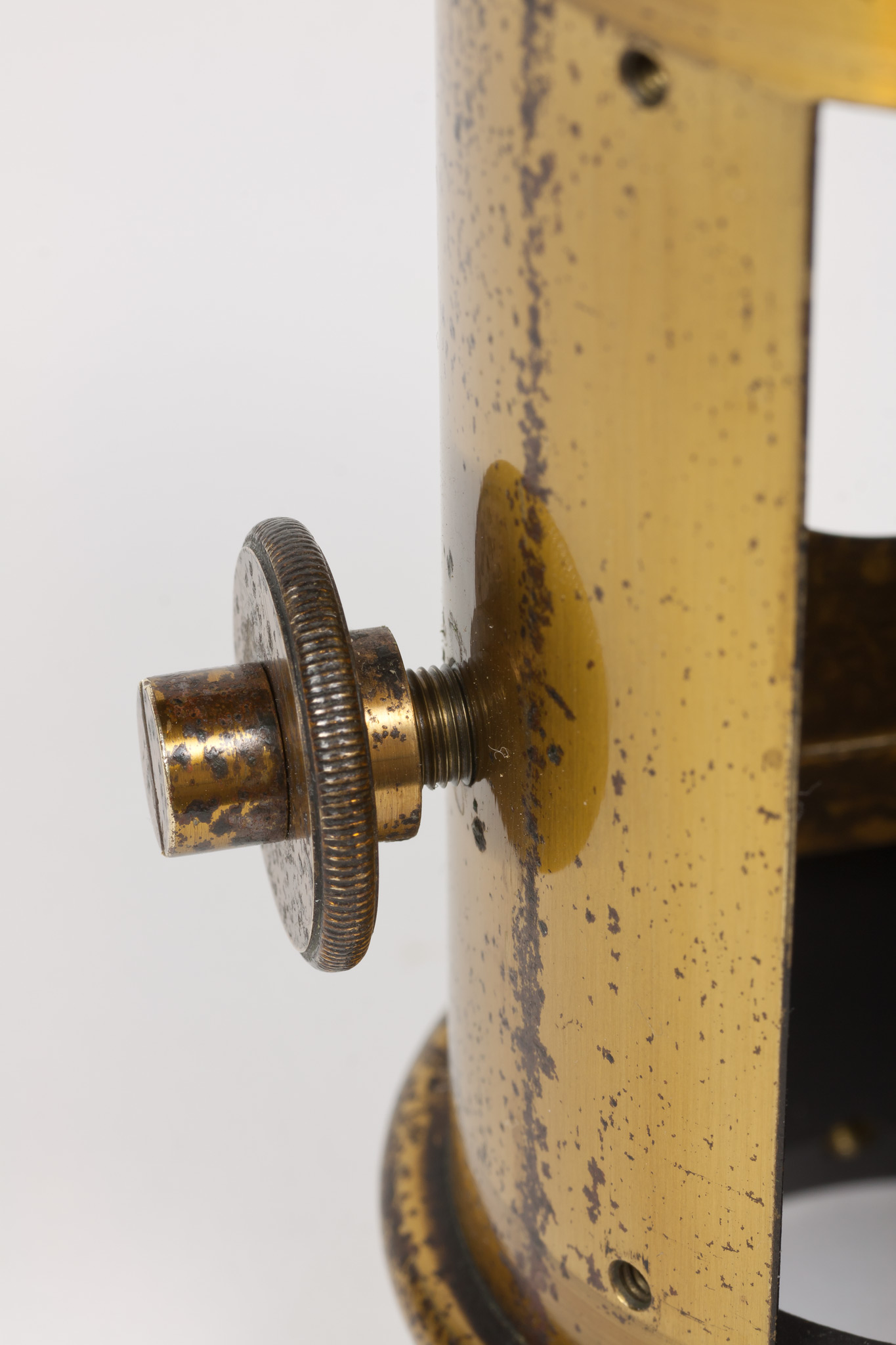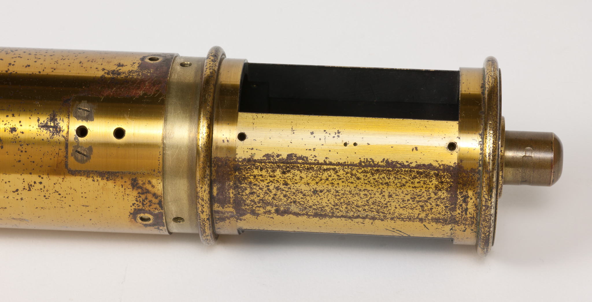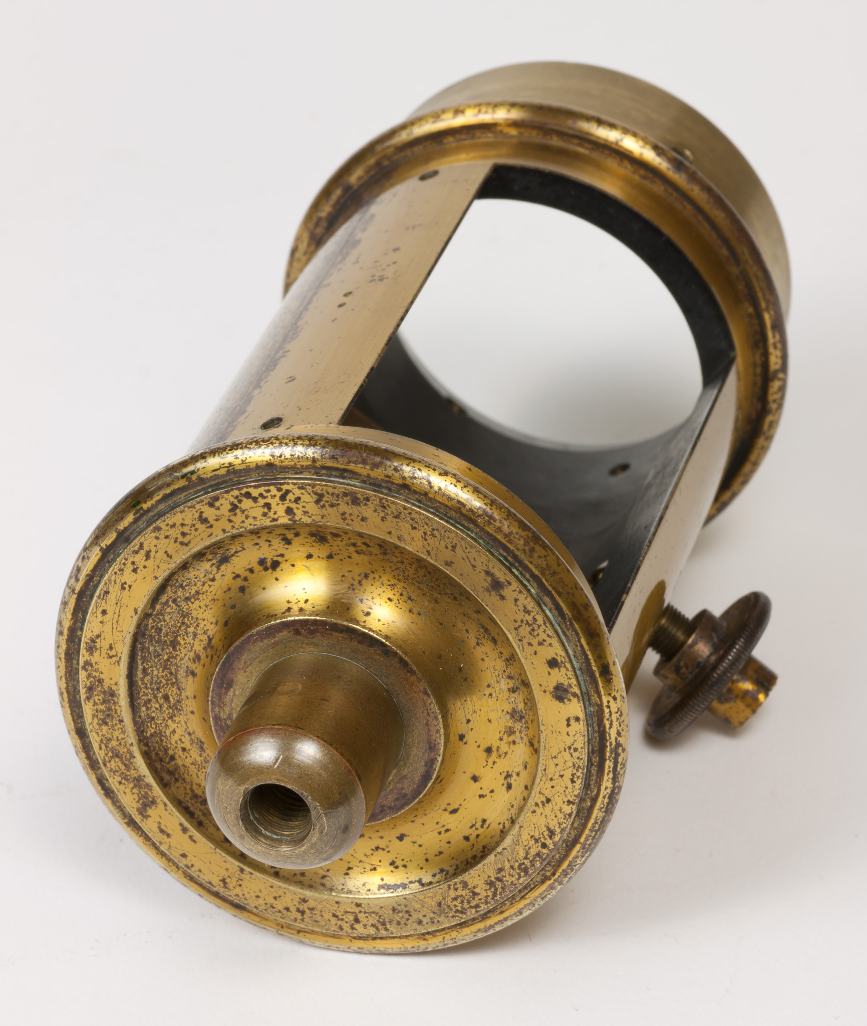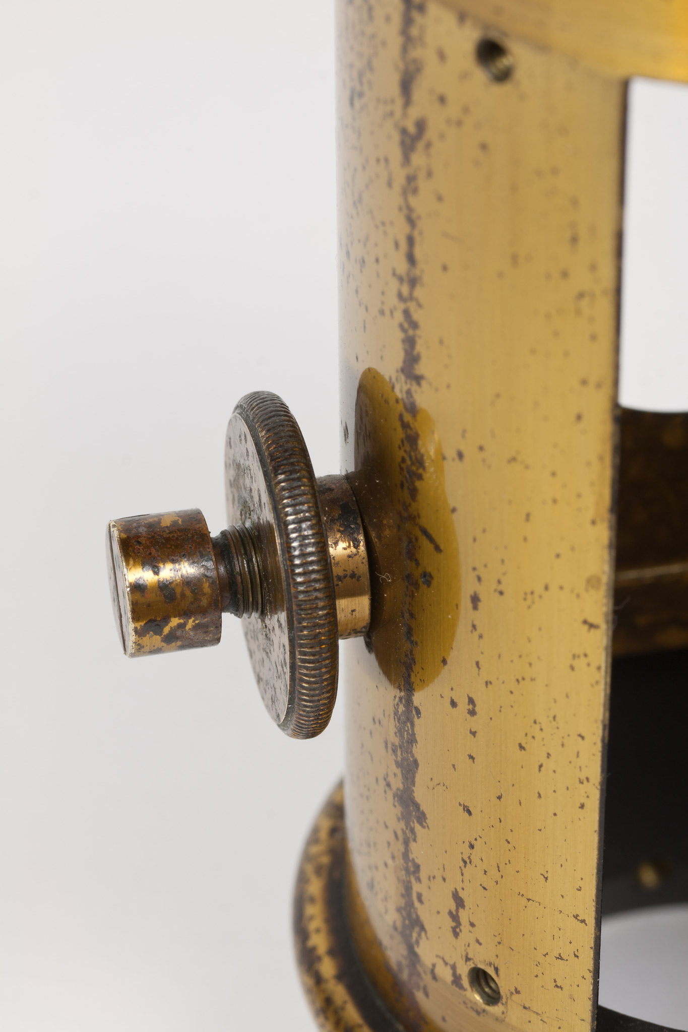 Sulla parete del tubo intermedia tra le due finestre c'è un foro filettato entro cui si avvita una grossa vite dotata di un fermo, avvitabile separatamente per mezzo di un dicso dal bordo zigrinato. La vite termina all'interno del tubo con una punta smussata che evidentemente serviva a premere e a tenere bloccato qualche dispositivo.