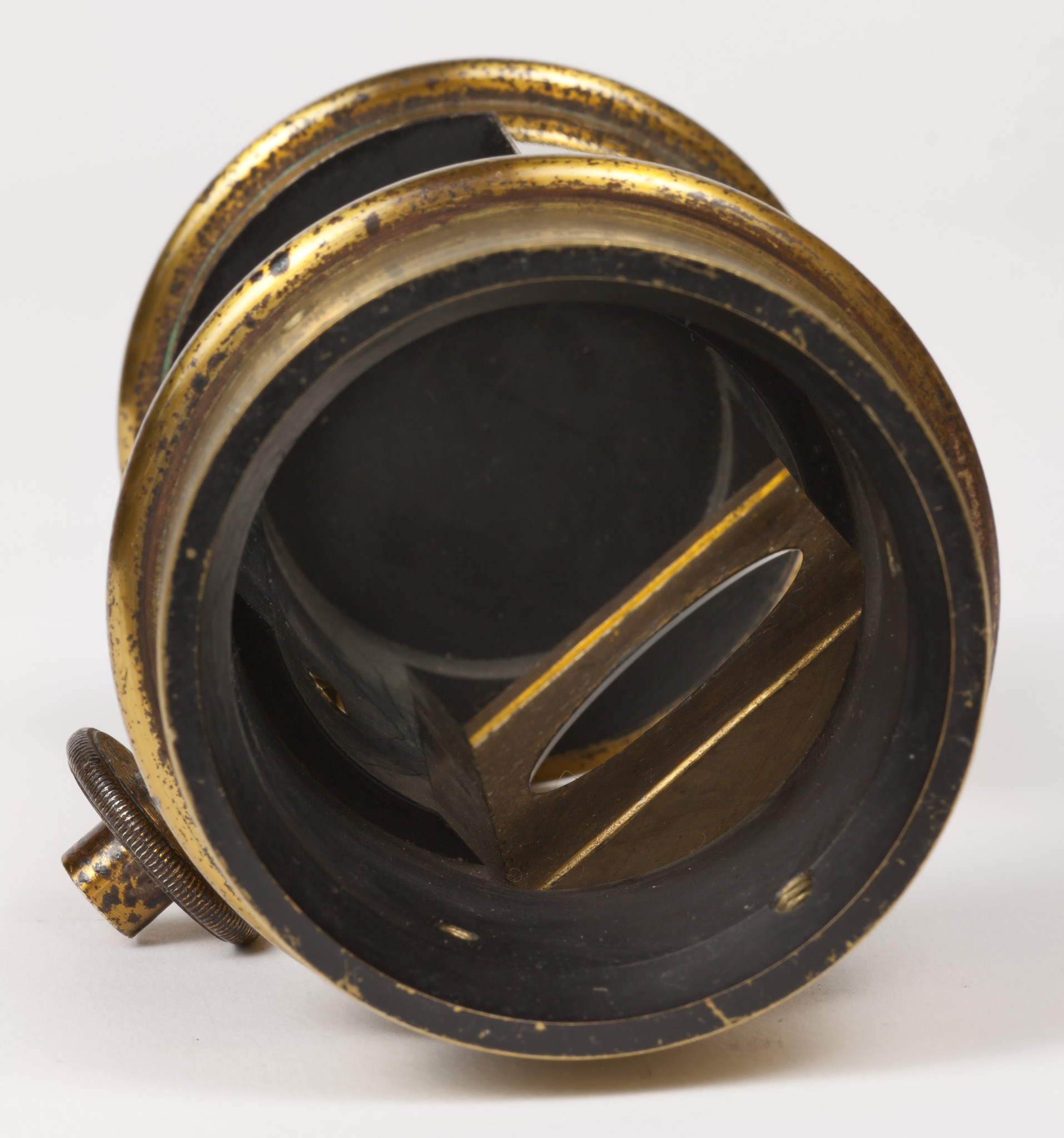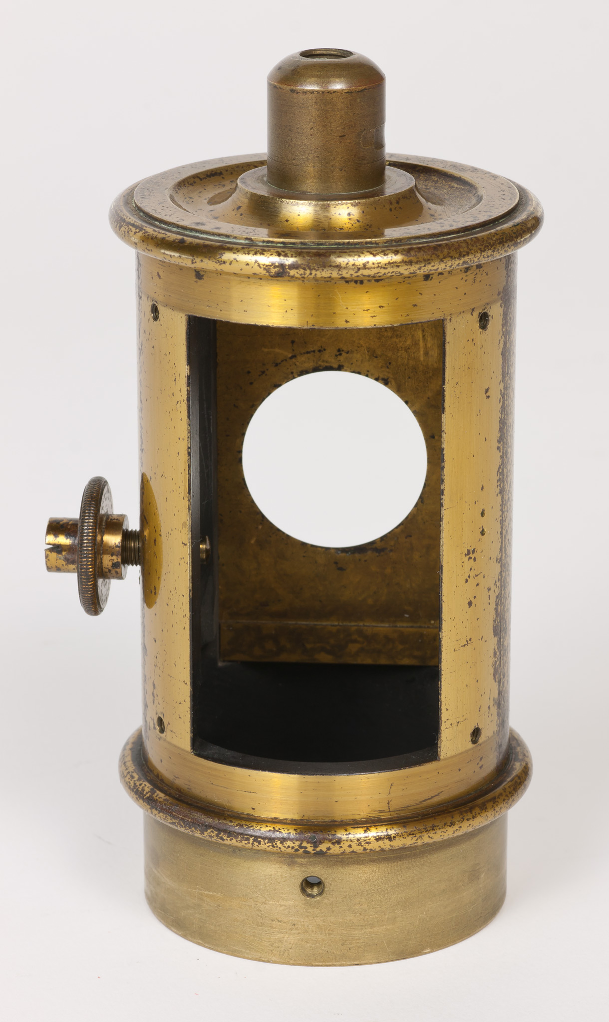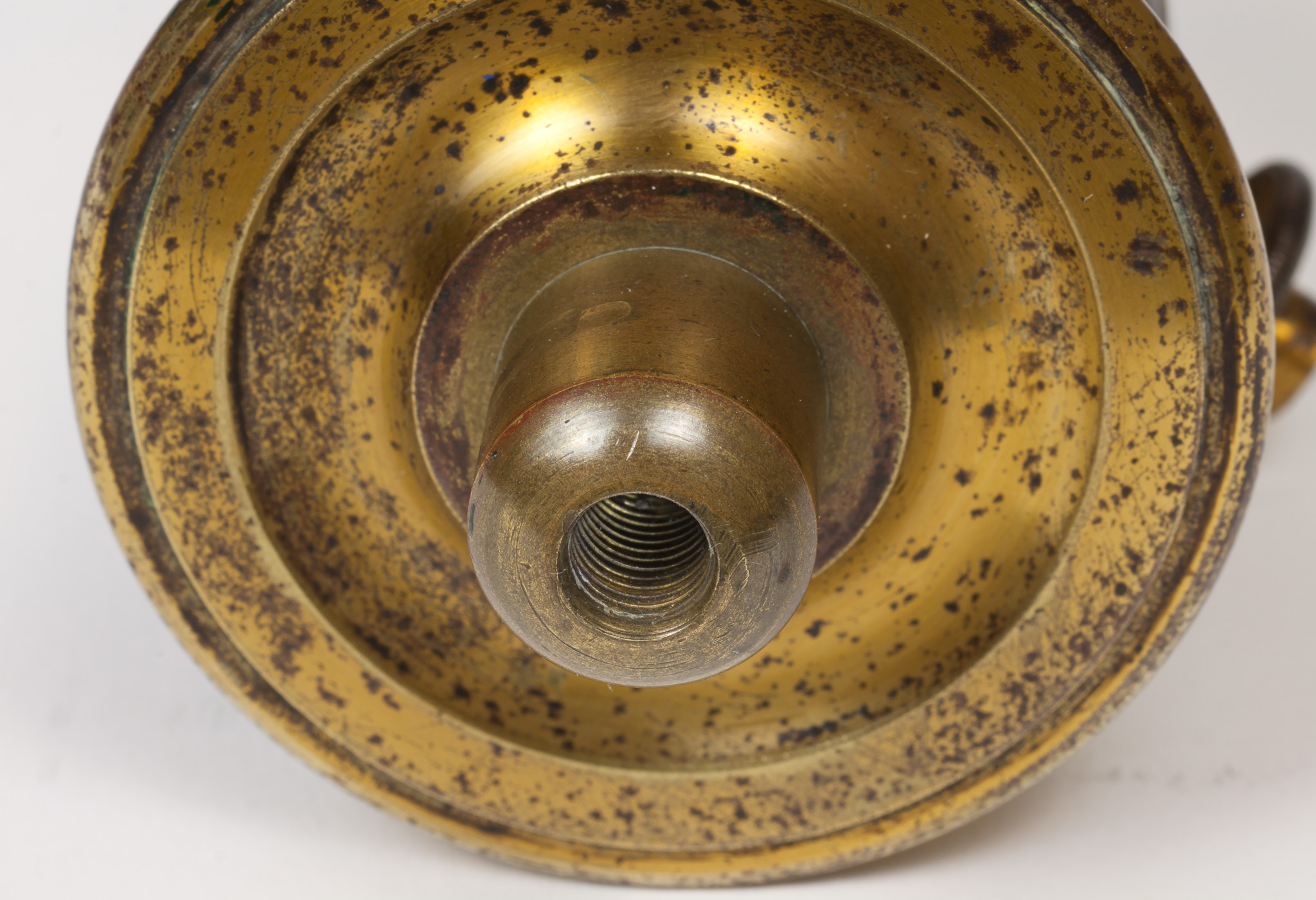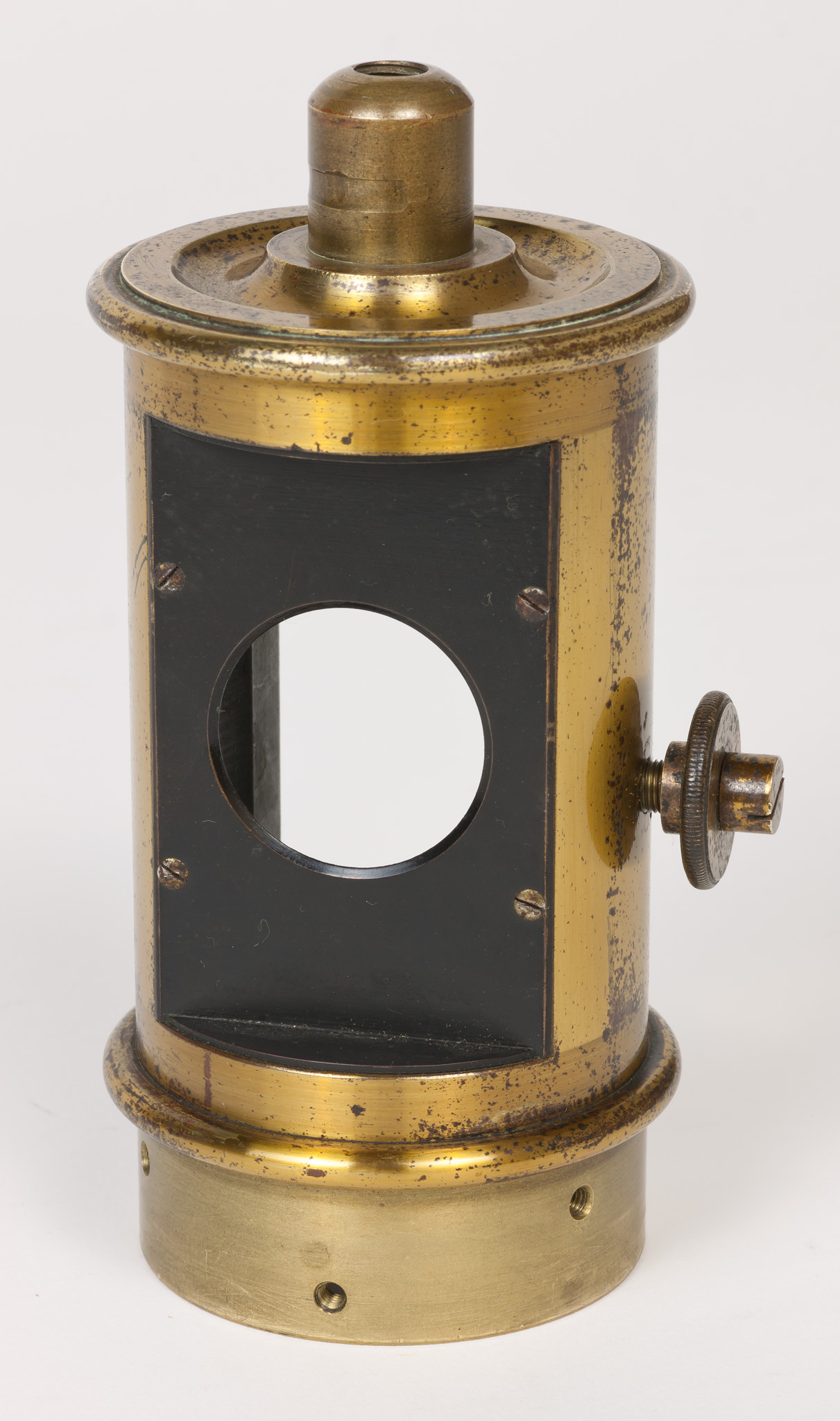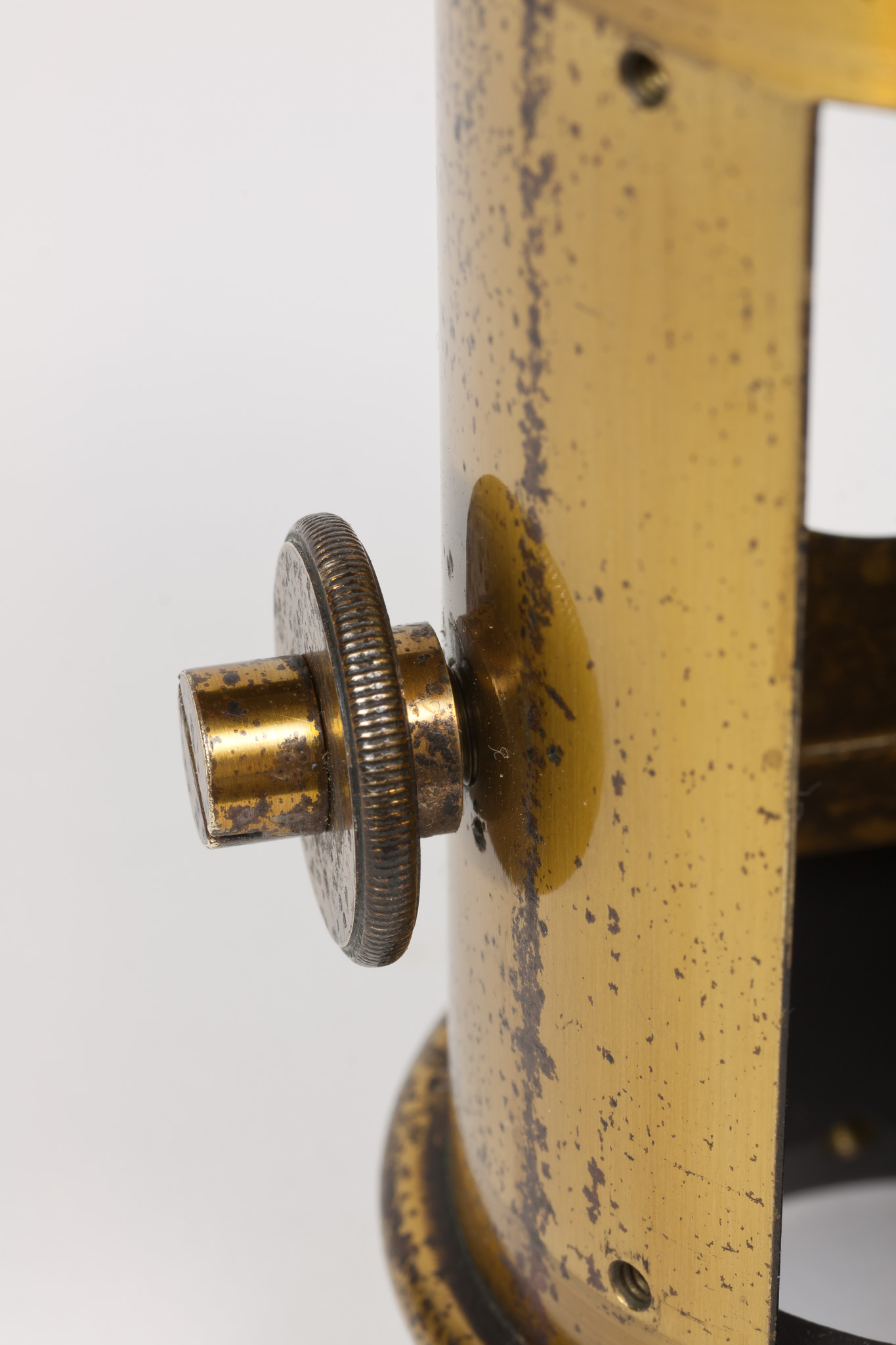 Sulla parete del tubo intermedia tra le due finestre c'è un foro filettato entro cui si avvita una grossa vite dotata di un fermo, avvitabile separatamente per mezzo di un dicso dal bordo zigrinato. La vite termina all'interno del tubo con una punta smussata che evidentemente serviva a premere e a tenere bloccato qualche dispositivo.
