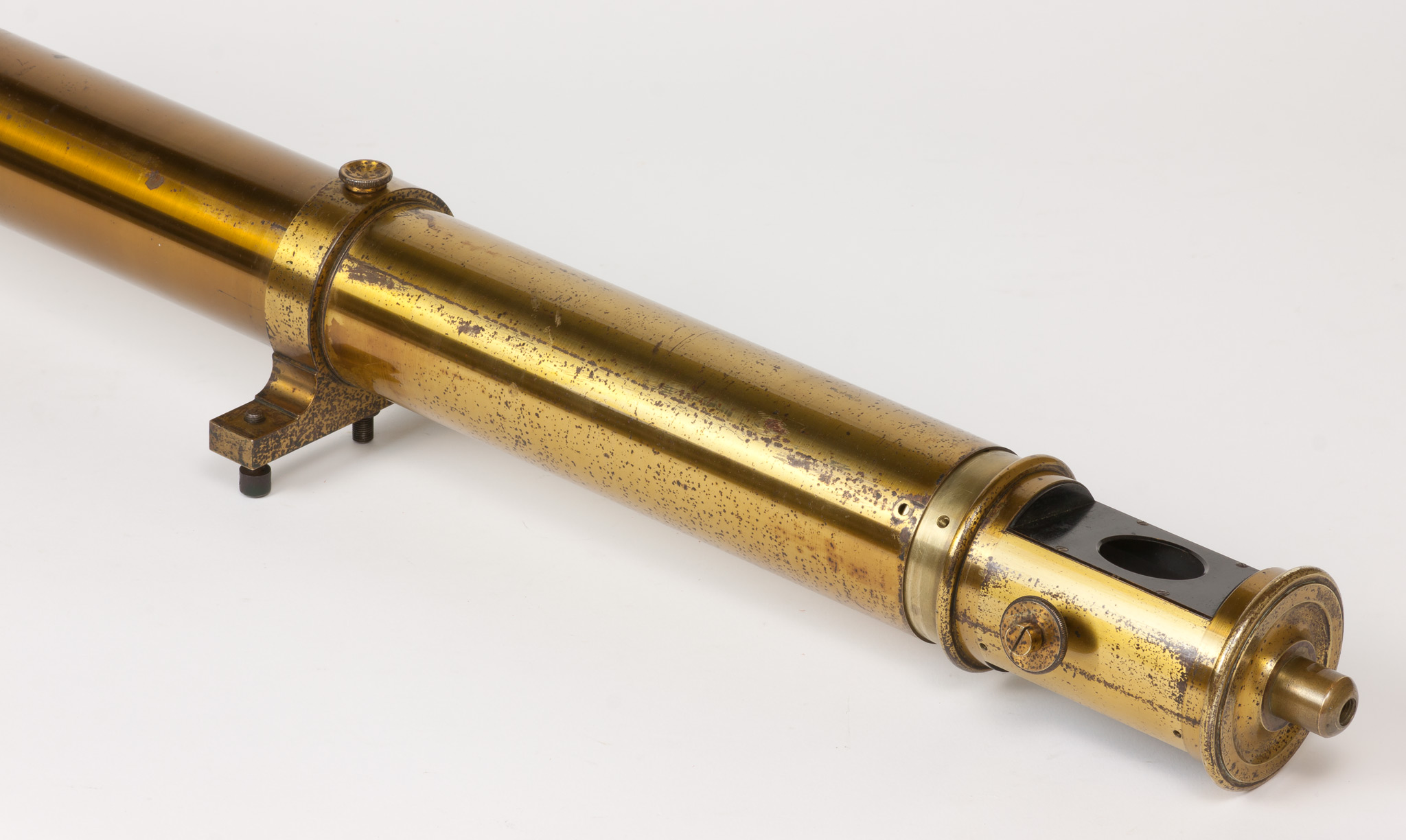 I fori per le viti sono messi in posizione tale che è possibile montare la parte terminale in modo che la sua finestra rettangolare sia allineata con la barra di ottone del tubo del cannocchiale (che verosimilmente era rivolta verso il basso); questa possibilità di montaggio è illustrata nelle fotografie come ipotesi A. Tuttavia, se si montano i pezzi in questo modo, il quarto foro (filettato) presente sul raccordo della parte terminale e il quarto foro (passante) all'estremità del tubo principale risultano sfasati di 120°; ad entrambi corrisponde una parte piena dell'altro pezzo, cosicché risultano inutilizzabili. Per realizzare la corrispondenza tra questi due fori occorre montare la parte terminale ruotata di 120° rispetto alla configurazione precedente (nelle foto, ipotesi B), ma in questo modo la finestra con foro rotondo della parte terminale risulta essere orientata a un angolo di circa 60° rispetto alla barra di ottone del tubo principale, una configurazione piuttosto improbabile.