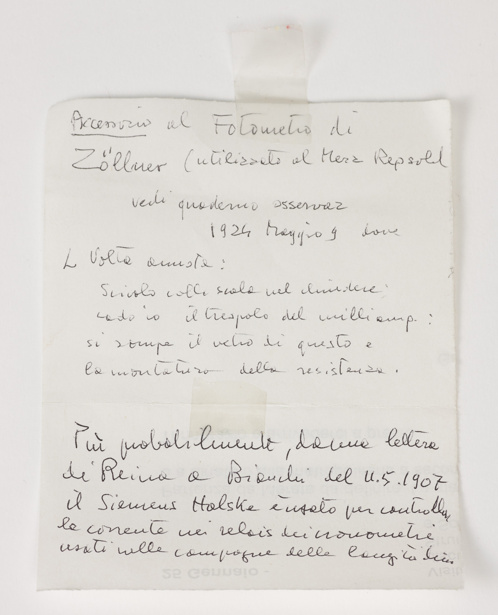 Note di Pietro Broglia.Milliamperometro di precisione Siemens-Halske, probabilmente serviva per controllare la corrente di alimentazione dei relais dei cronometri registratori usati nelle campagne di longitudine [CS 11.5.1907 lettera di Reina a Bianchi]. Usato sicuramente per controllare la corrente della lampada che dà la stellina artificiale nel fotometro di Zollner applicato al Merz-Repsold [L.Volta, 9.5.1924 quaderno osserv.] e successivamente nel fotometro visuale a cuneo, costruito da C. Milani.