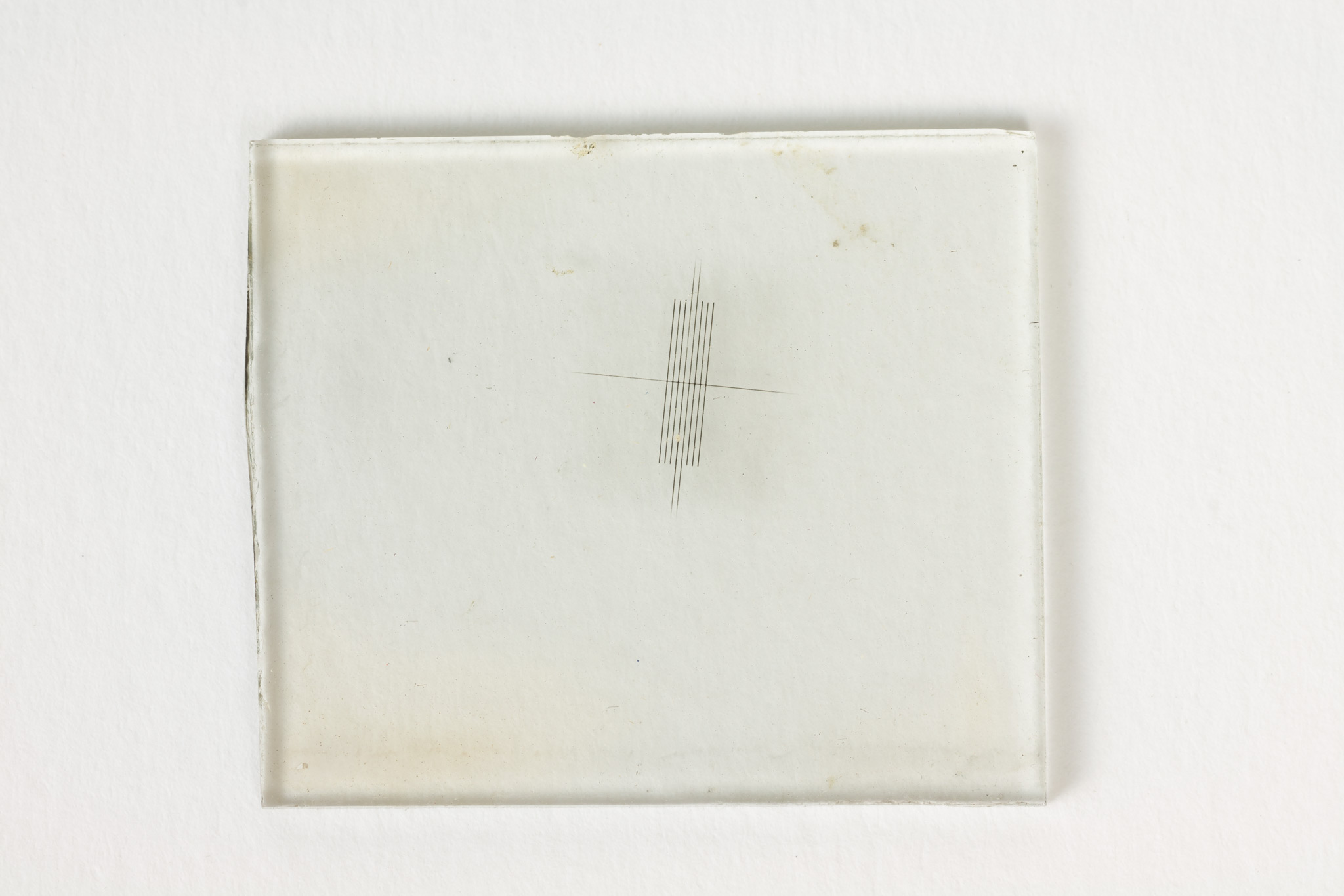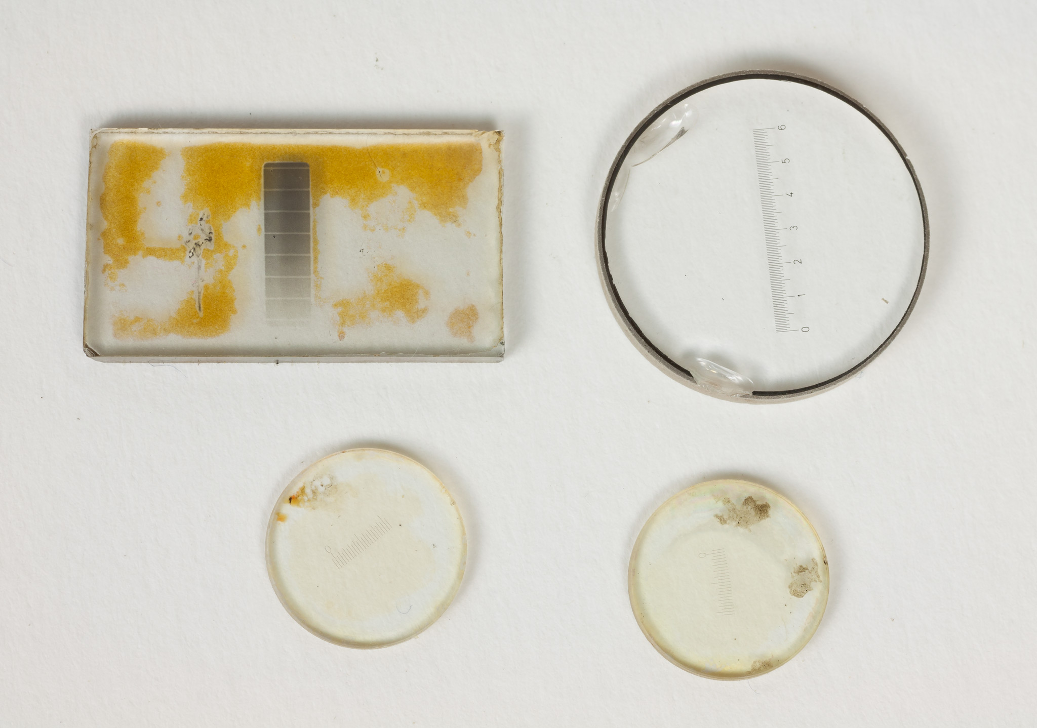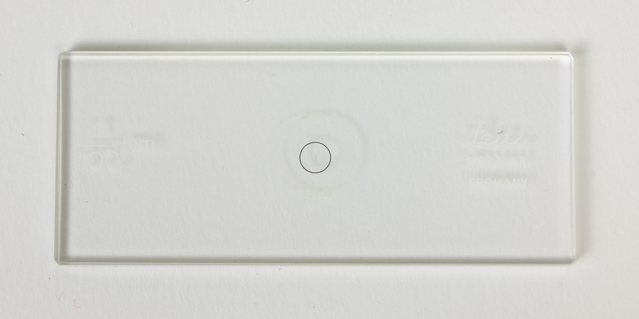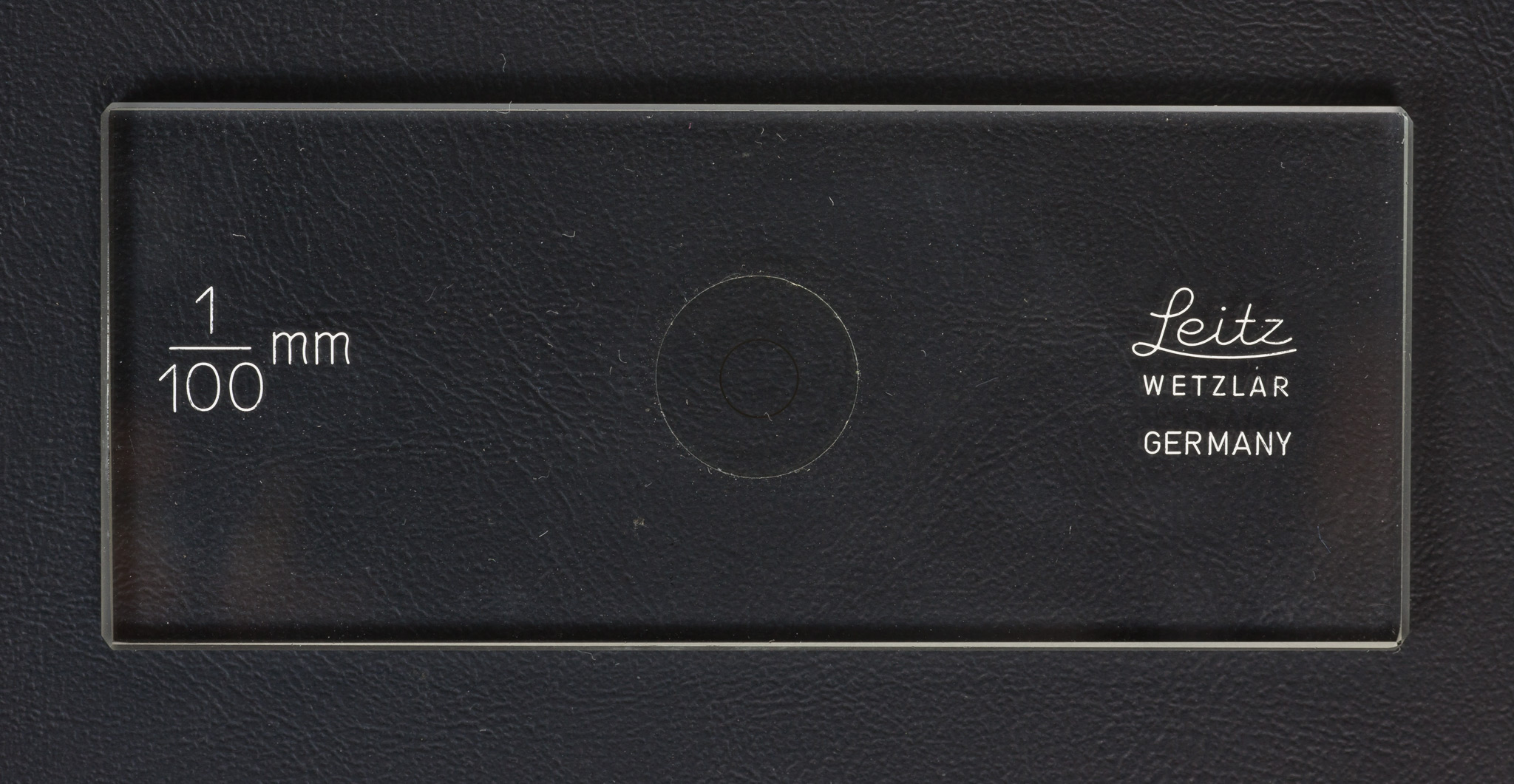 (B) Vetrino rettangolare Leitz con scala lunga 1 mm divisa in 100 parti