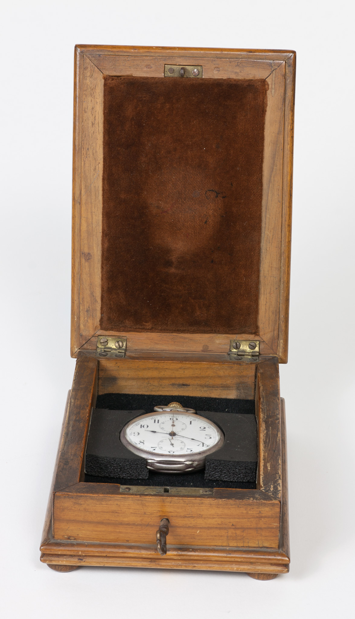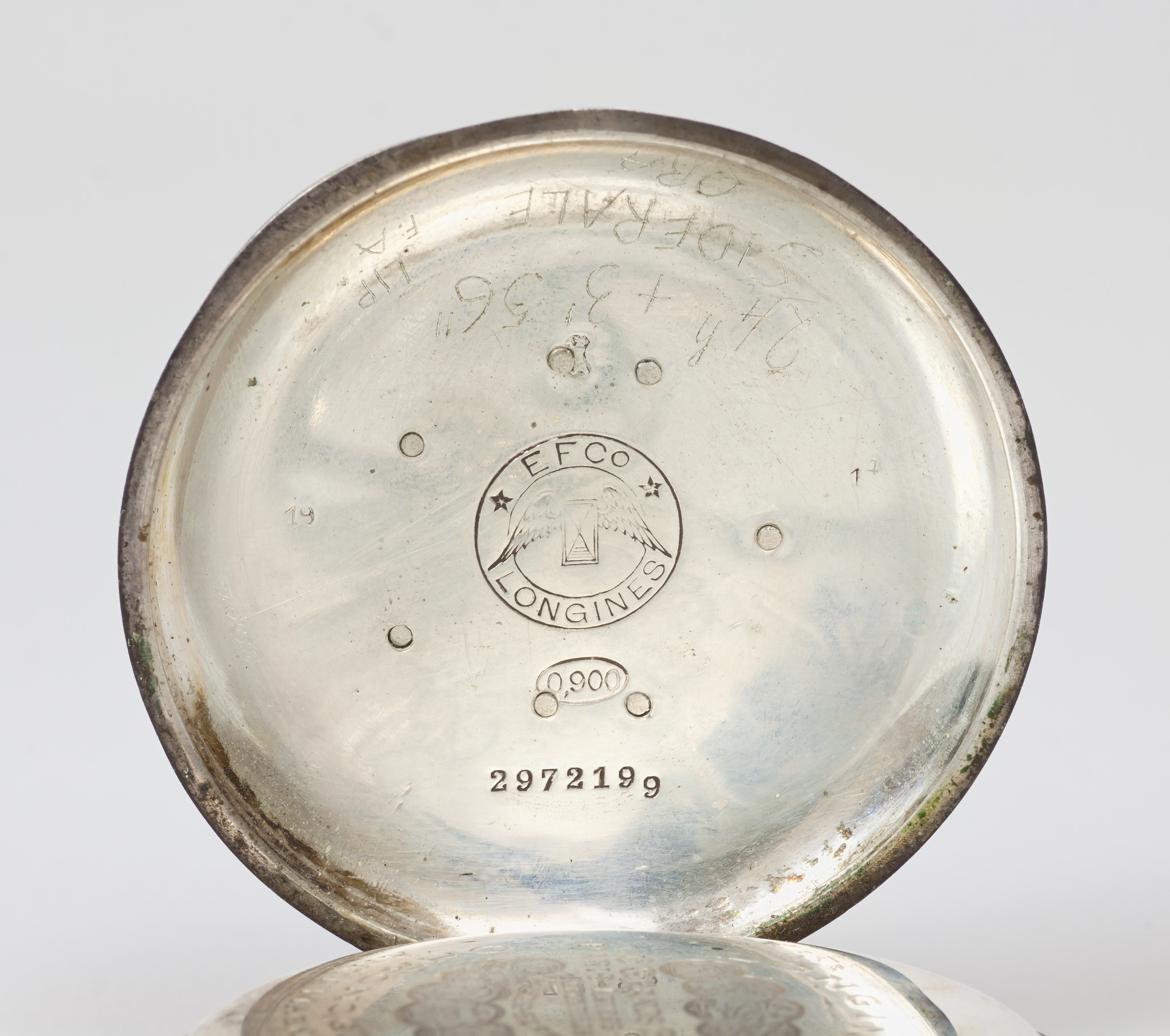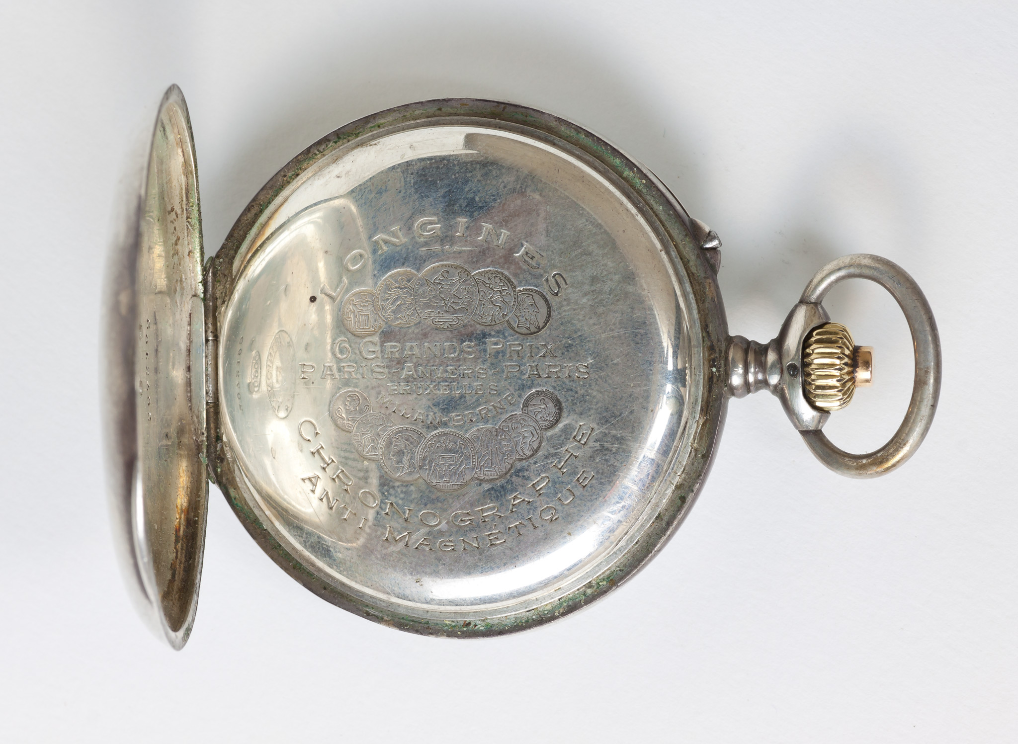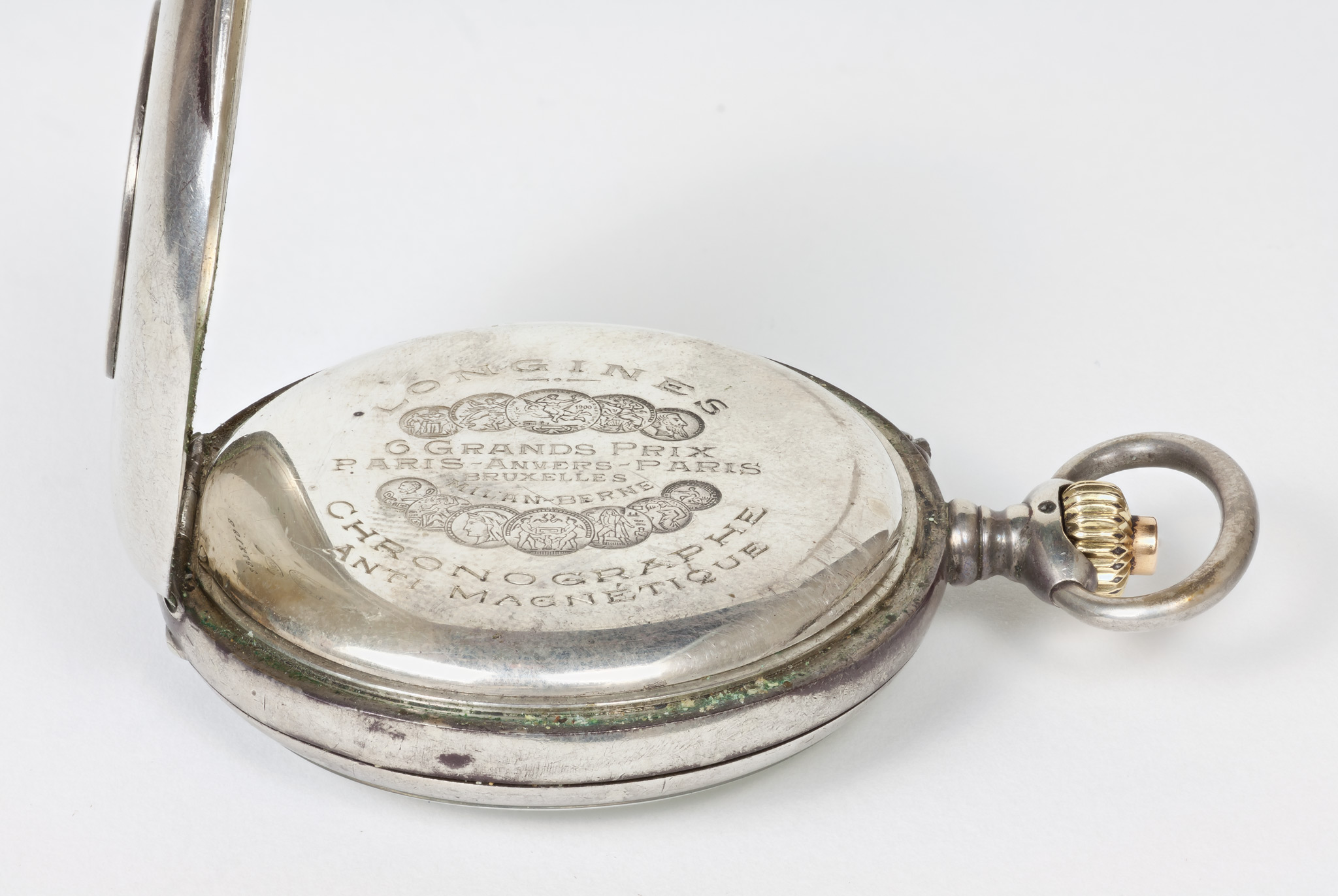 L'iscrizione riportata sul coperchio interno (Exposition universelle internationale 1900) fissa la data di costruzione all'inizio del XX secolo. Internamente al coperchio esterno una incisione riporta che l'orologio segna il tempo siderale.