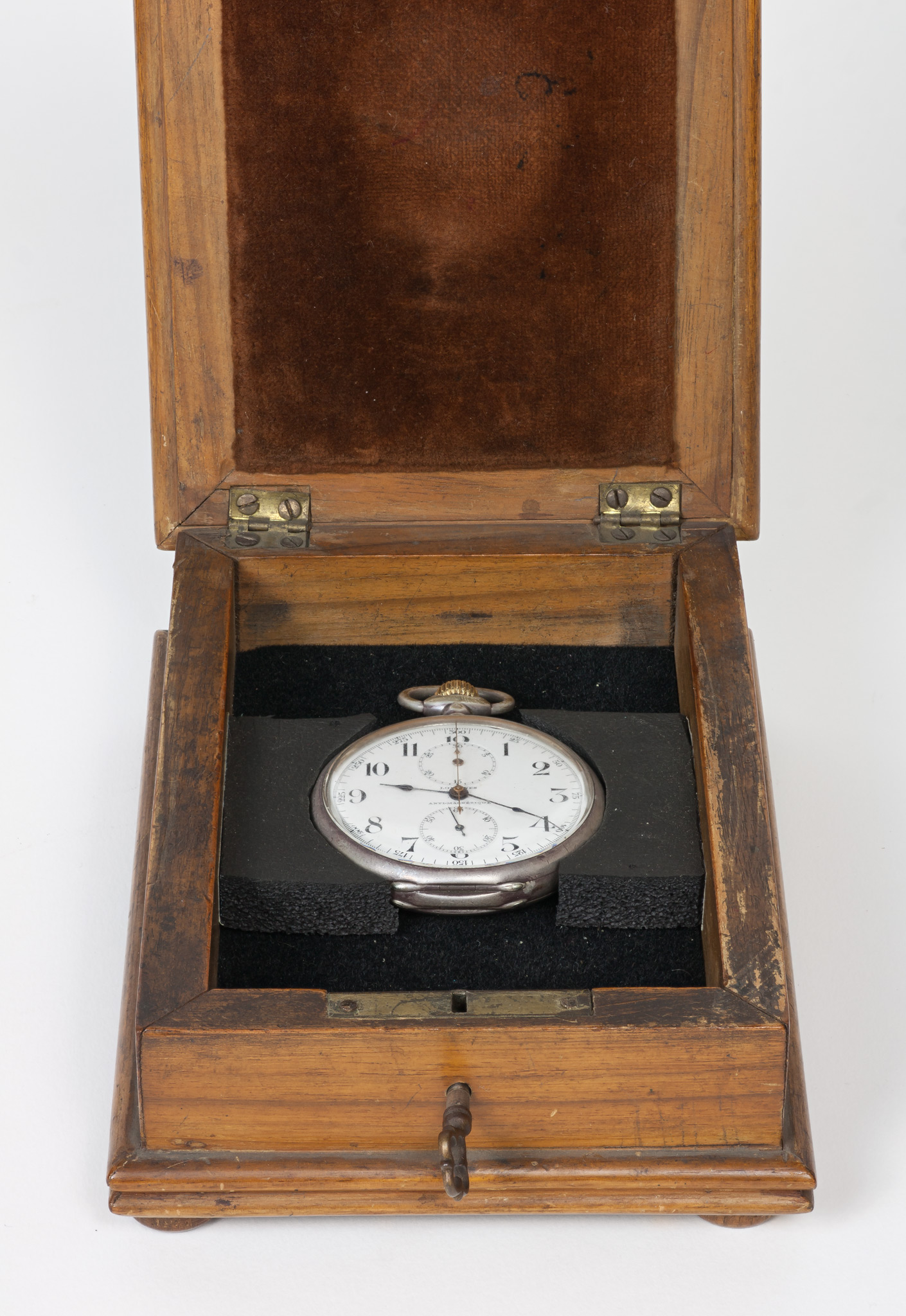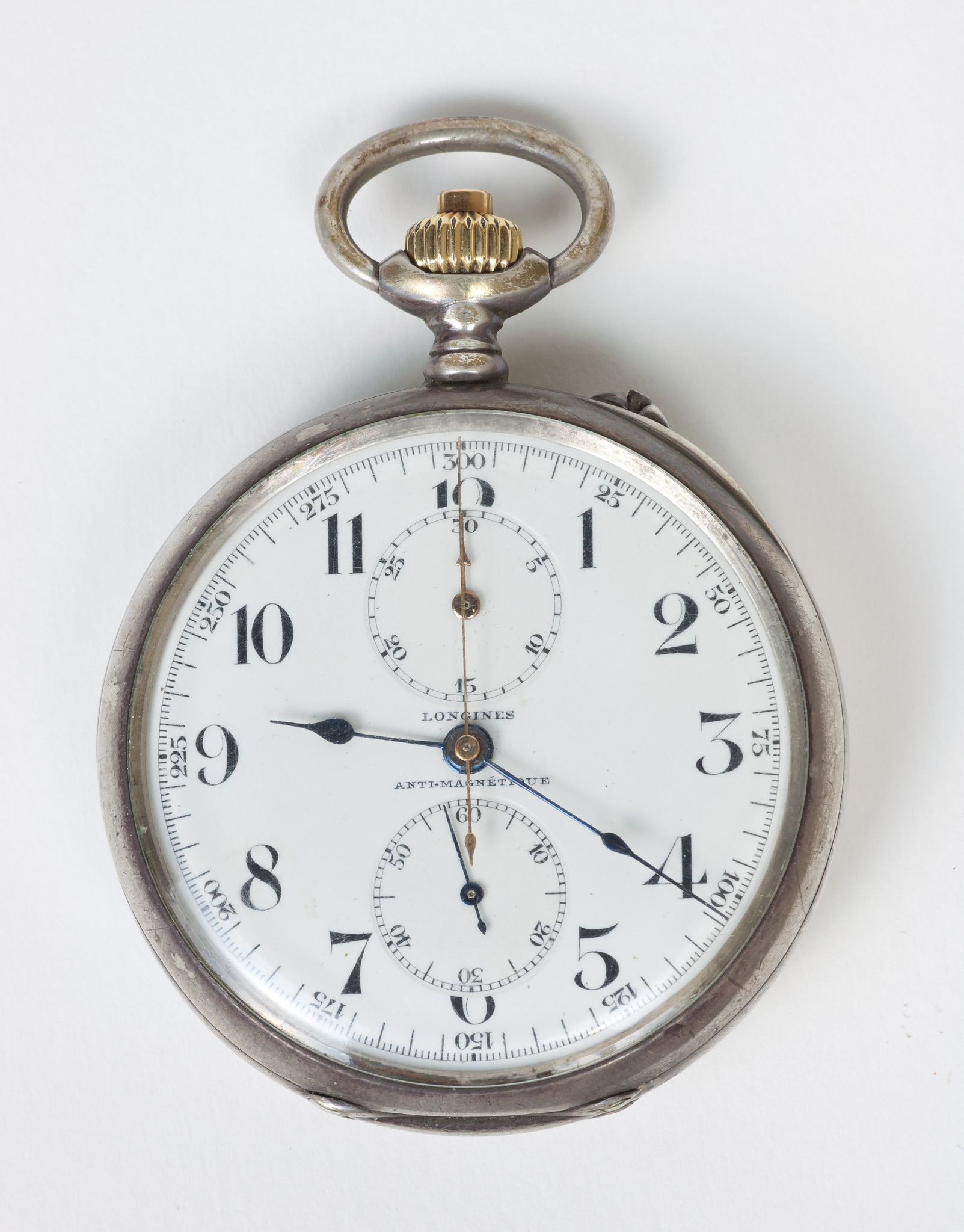 Note di Pietro Broglia.L'orologio ha le dimensioni: 51-70-16 mm; il quadrante porta l'iscrizione LONGINE / ANTI-MAGNÉTIQUE. La numerazione da 1 a 12 ore è incisa su una gradazione di 42 mm di diametro, mentre i secondi si leggono su una gradazione di 13 mm di diametro. La gradazione da 42 mm è suddivisa in 300 trattini minori, con cifre ogni 25 per l'utilizzo come cronometro, corrispondendo l'intervallo di un trattino ad un quinto di secondo. Un pulsante coassiale alla rotella di caricamento comanda l'avvio e l'arresto del cronometro. Una gradazione, pure di 13 mm di diametro, indica i minuti cronometrati.