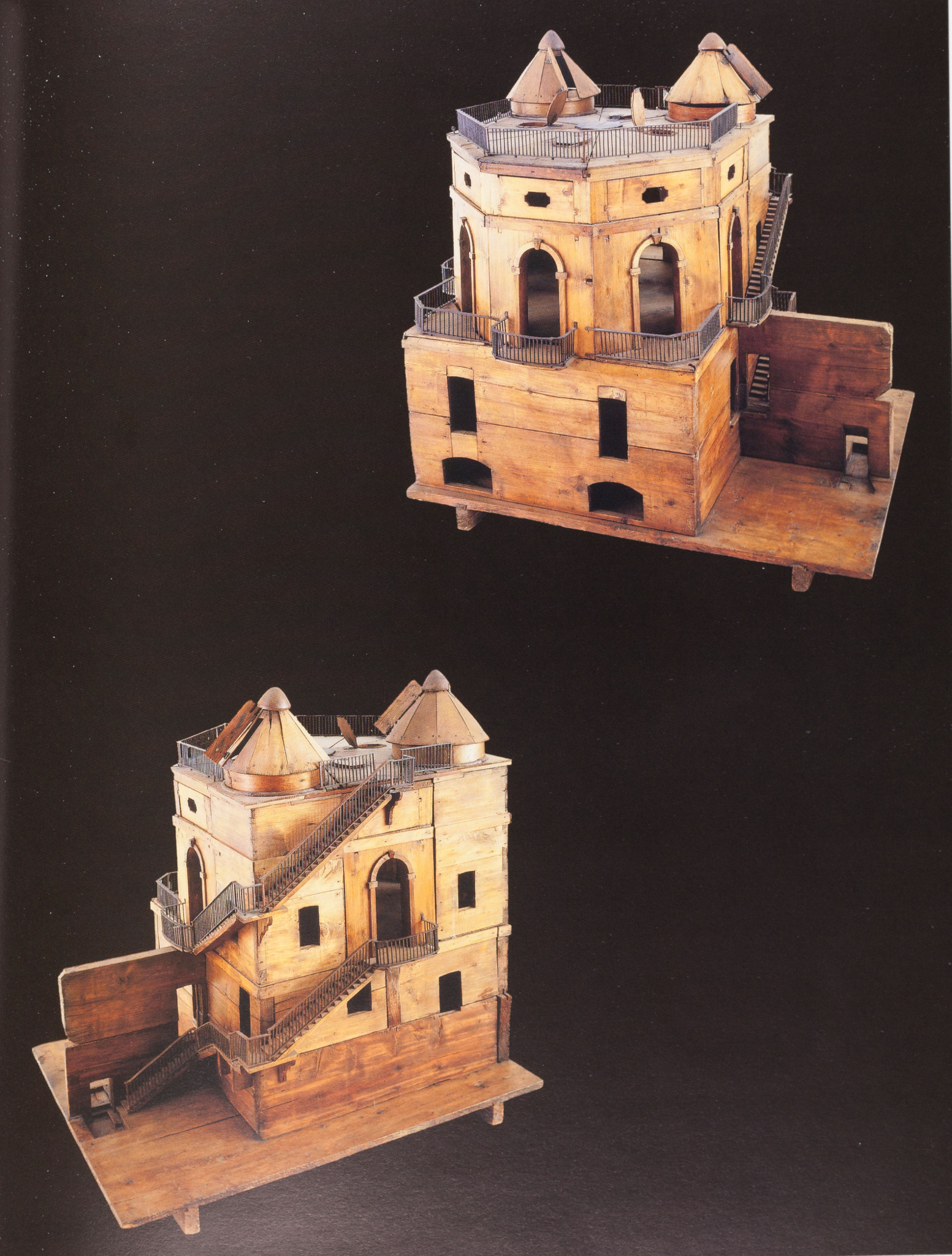 Modello ligneo originale della specola di Boscovich costruita nel 1764-65, visto da sud-sud-est (sopra) e da nord-nord-est (sotto).