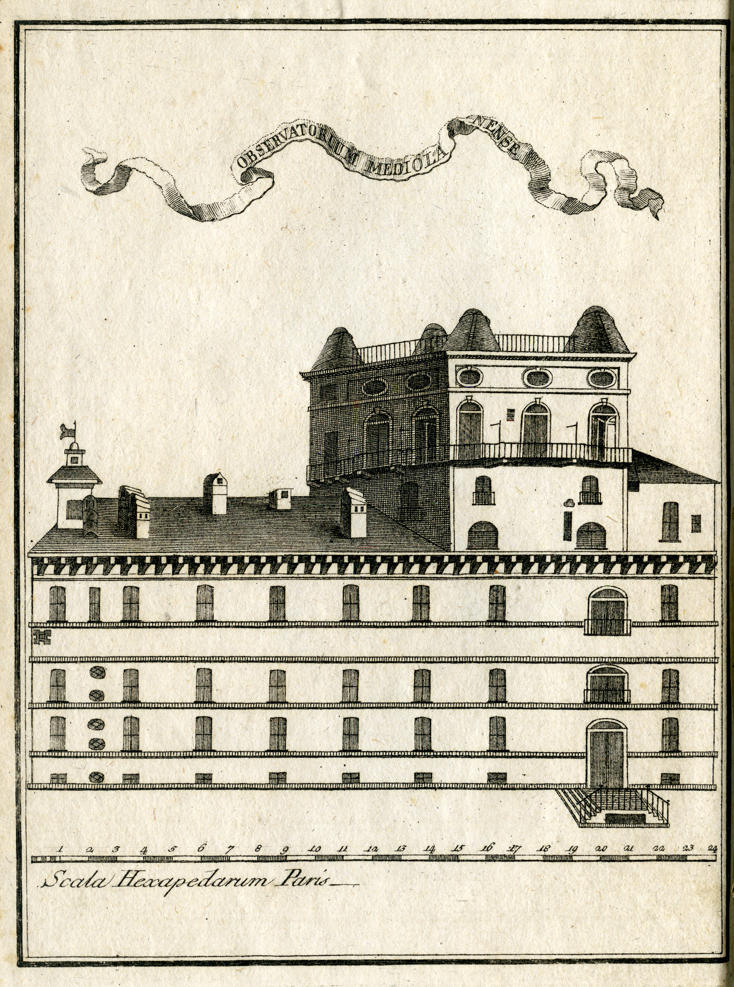 Veduta della Specola di Brera dal lato sud (Orto Botanico) riportata nell'antiporta delle Effemeridi di Milano per il 1777.