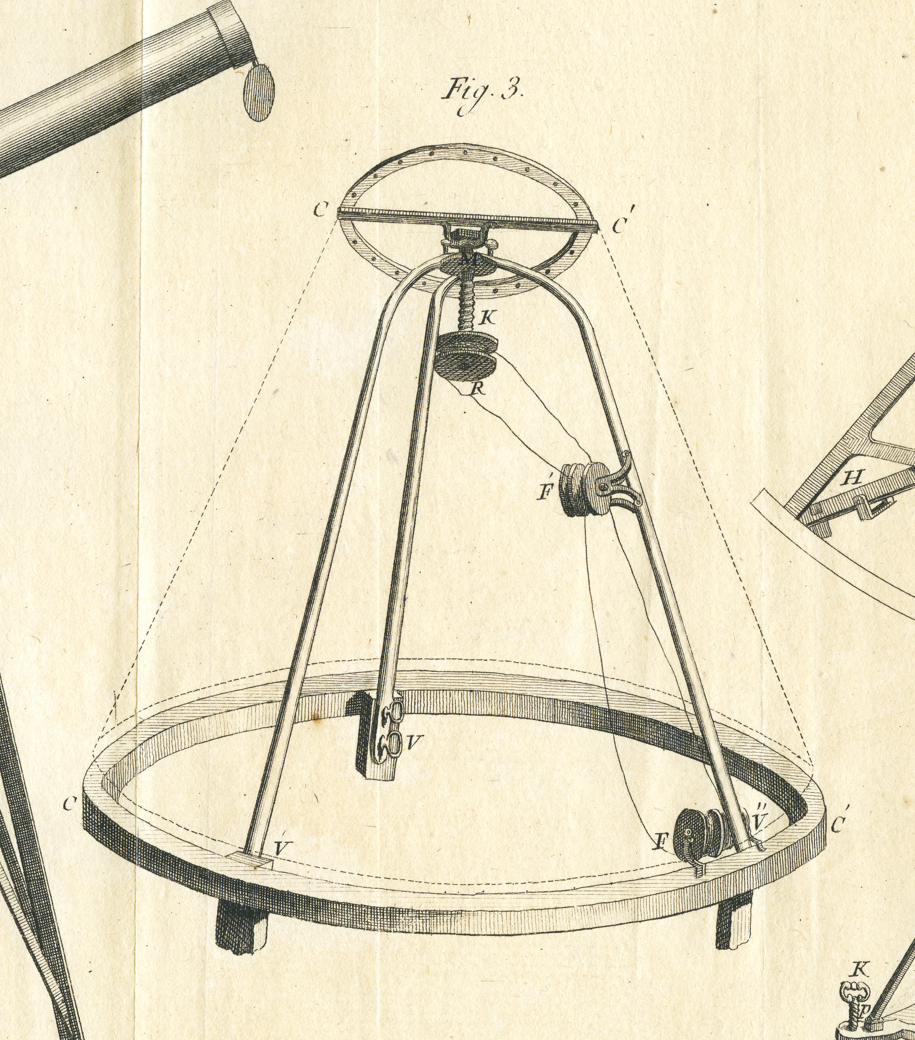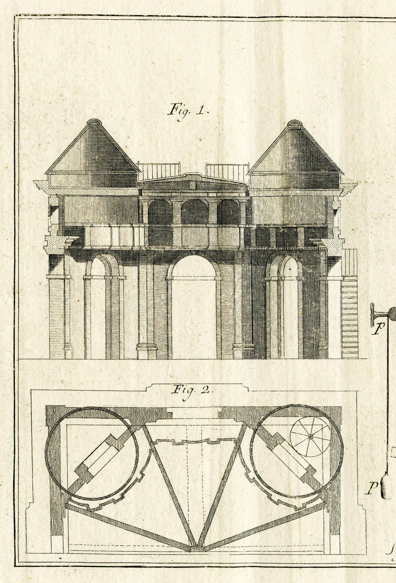 Struttura portante e meccanismo di rotazione delle torrette coniche della specola di Boscovich, pubblicato sulle Effemeridi di Milano per il 1780.