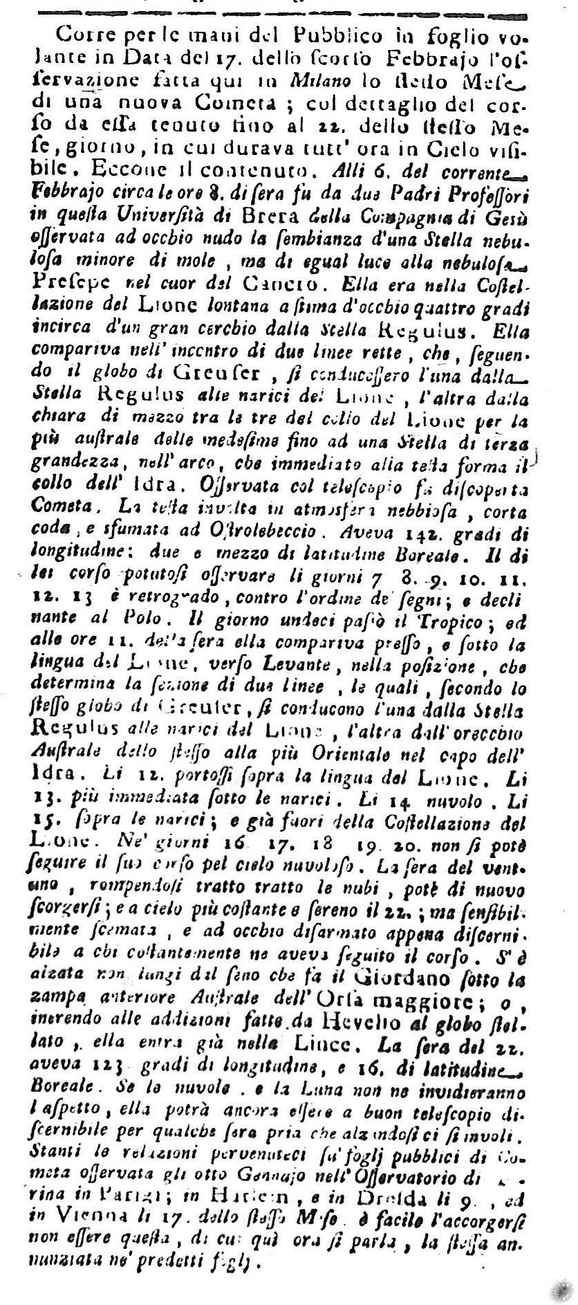 Notizia riportata sulla gazzetta milanese Ragguaglj di varj Paesi del 5 marzo 1760 della scoperta di una nuova cometa fatta da due Padri gesuiti, professori del Collegio di Brera.