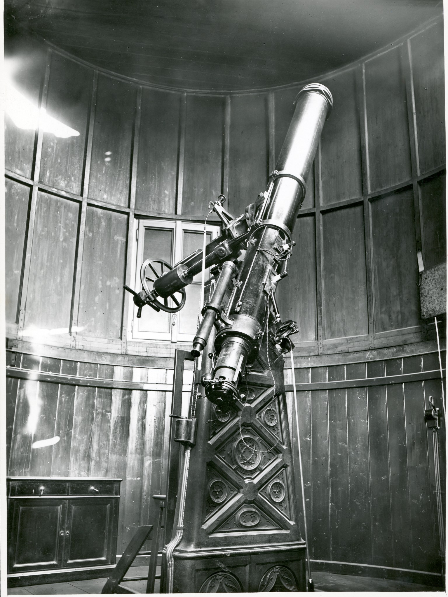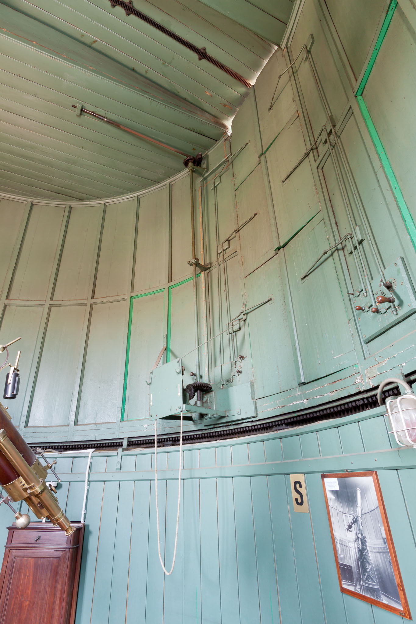Particolare del sistema di apertura della fenditura di osservazione della cupola del rifrattore Merz da 8 pollici, visto dall'interno della cupola stessa. La finestra verticale della fenditura è mostrata con i pannelli interni aperti, mentre le persiane esterne sono chiuse. La parte superiore della fenditura, ricavata nel soffitto del cilindro che costituisce la cupola, può essere aperta facendola scorrere per mezzo di un sistema a cremagliera, azionato dai comandi visibili alla sinistra della finestra.