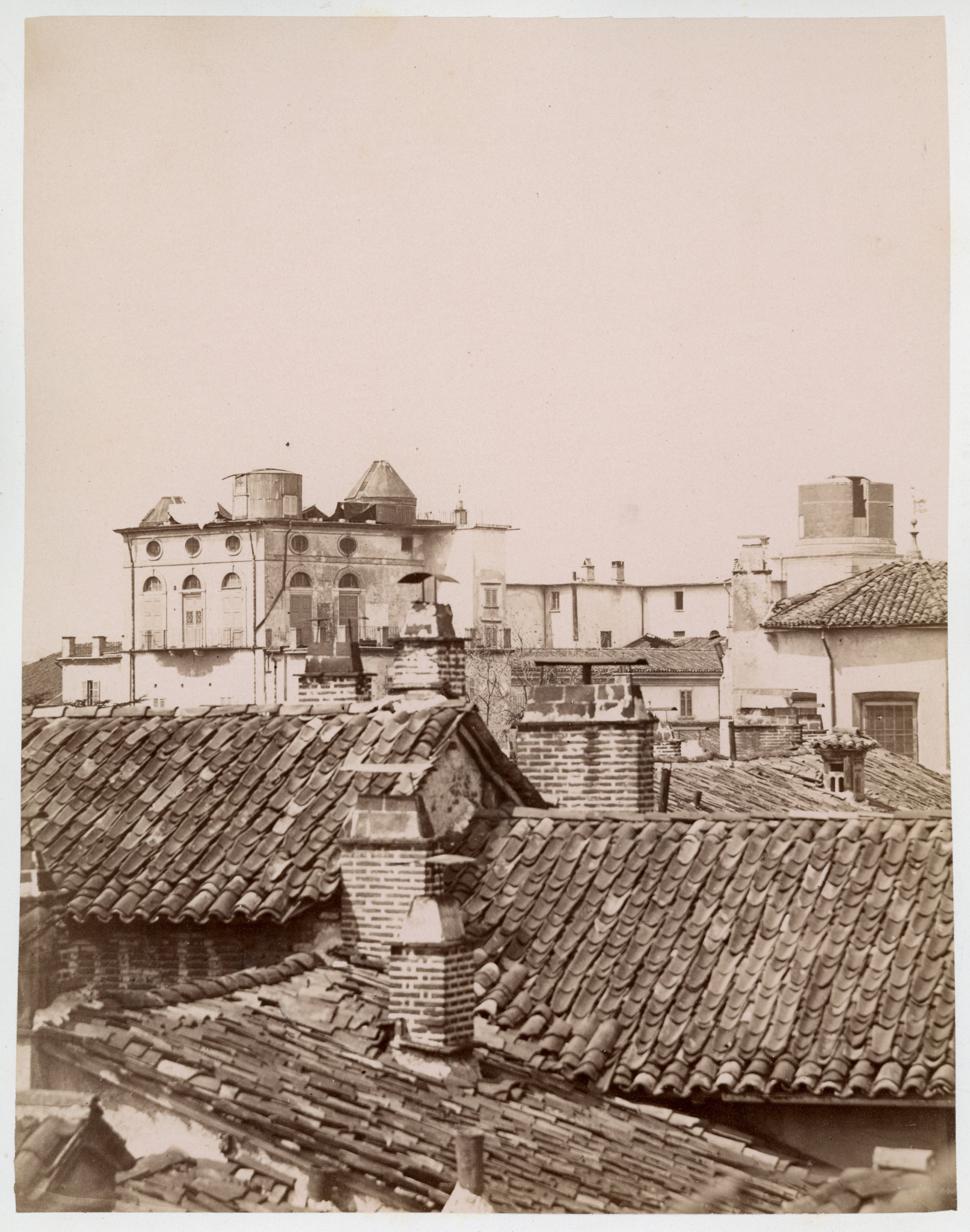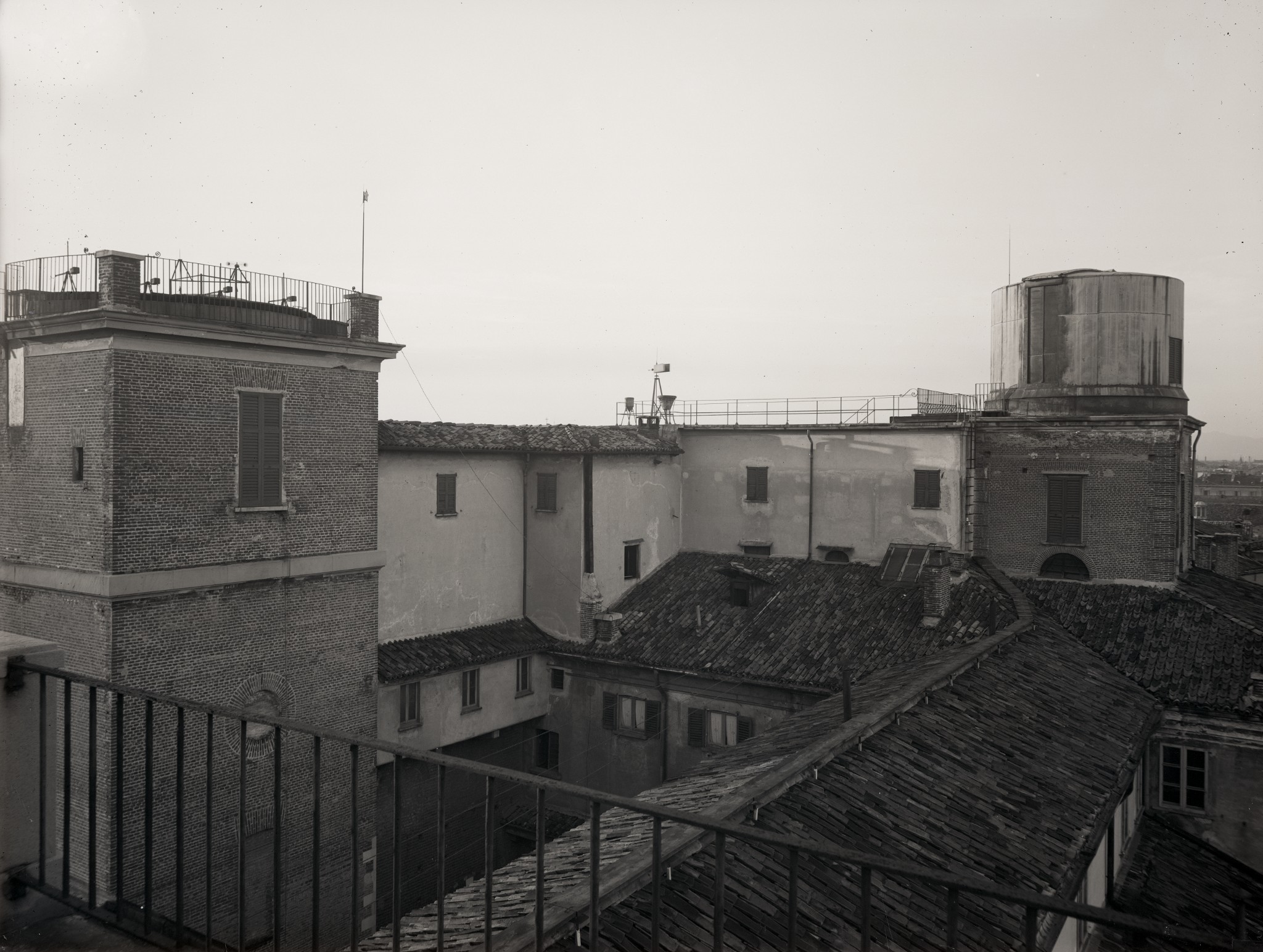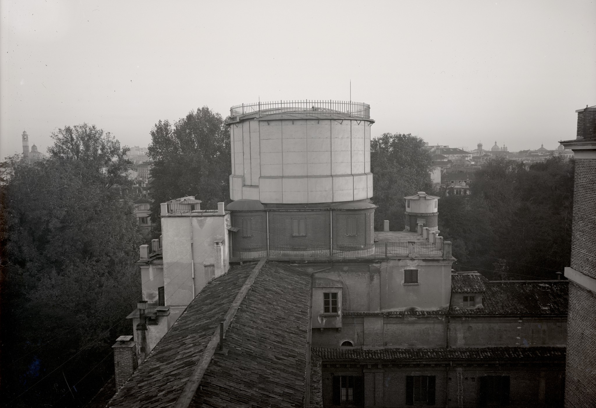 Benché il rifrattore Merz da 8 pollici fosse giunto a Milano nel 1865, esso rimase inutilizzato per circa 10 anni, perché lo stanziamento iniziale non comprendeva il costo per la costruzione della sua cupola, che fu inaugurata solo nel 1875. In questa fotografia d'epoca, ripresa da sud-est, si vede (all'estrema destra) il cilindro della nuova cupola, con la fenditura di osservazione aperta, appena dopo la sua costruzione. A sinistra è visibile la torretta quadrata della vecchia specola di Boscovich, sormontata da alcuni cupolini, che verrà demolita nel 1882 per far posto alla grande cupola del rifrattore Merz-Repsold da 18 pollici.