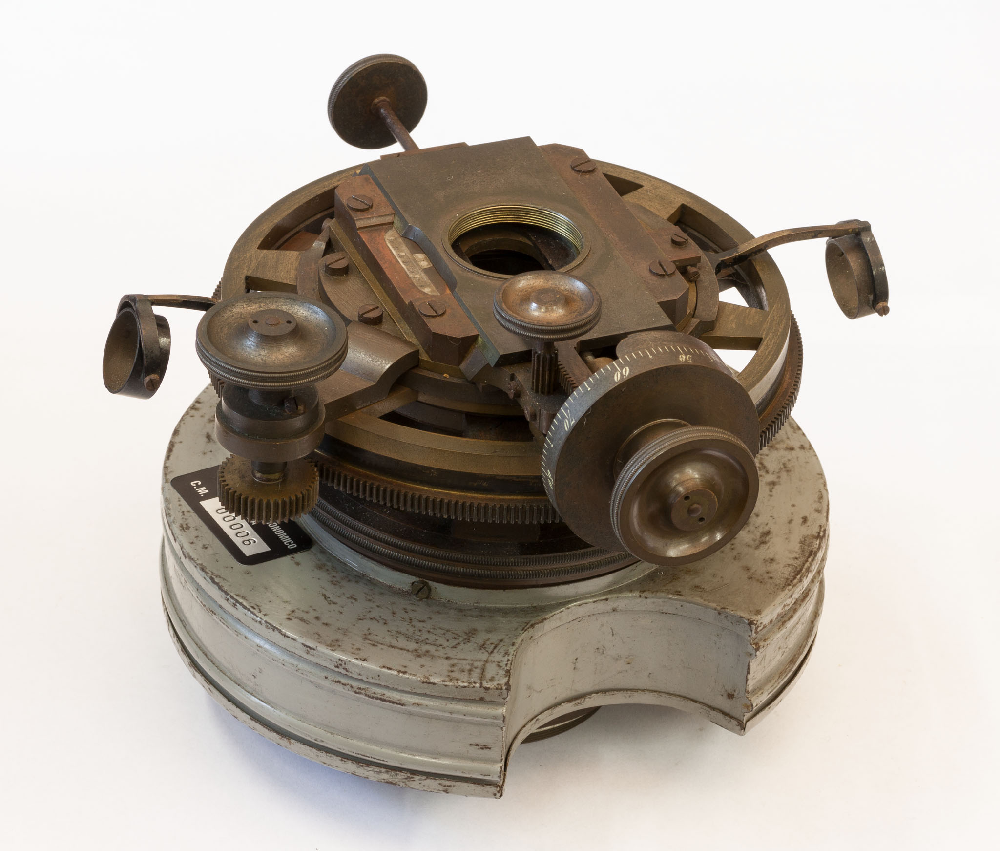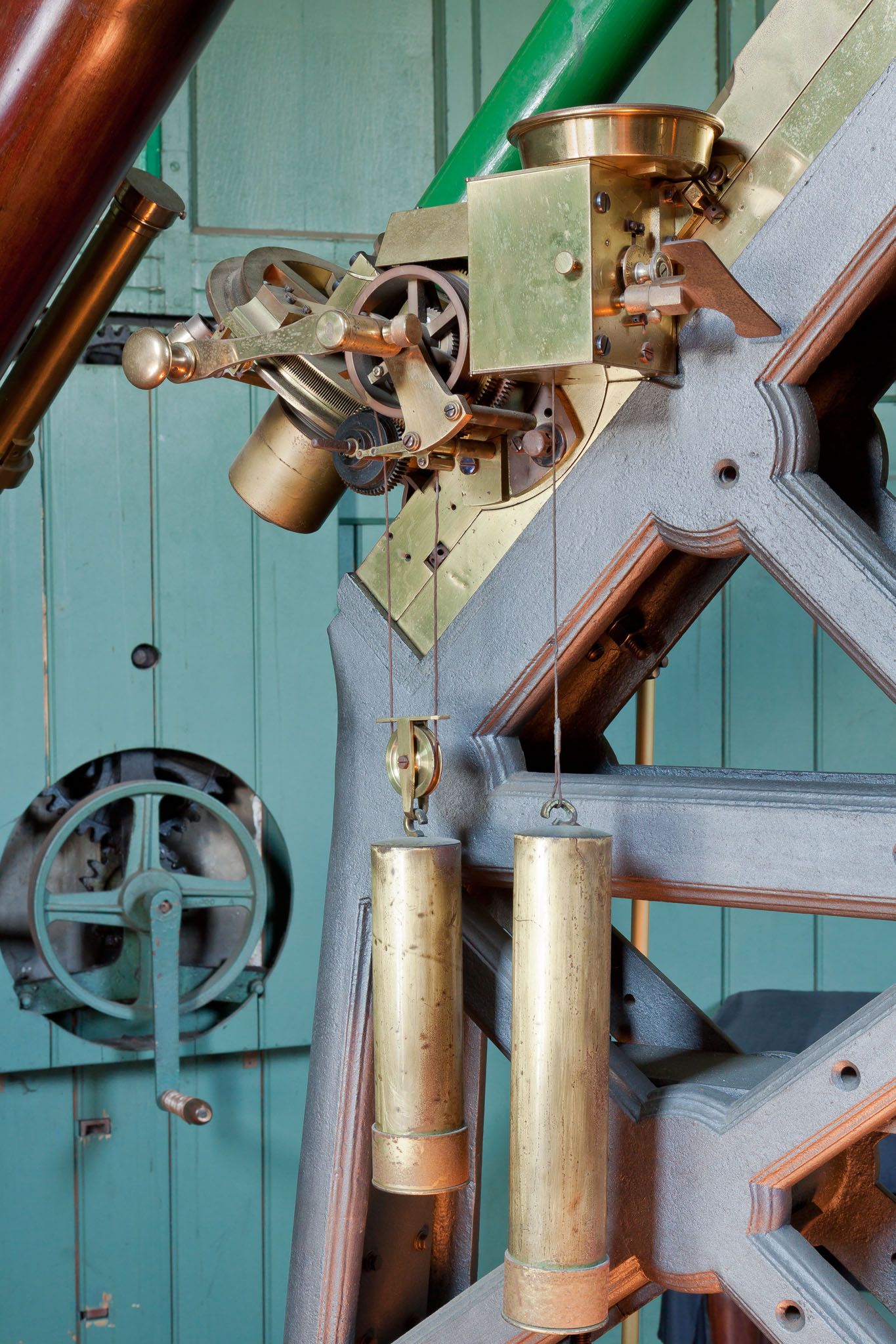 Il meccanismo che controlla il moto orario del rifrattore Merz da 8 pollici. Si tratta di un congegno puramente meccanico, in cui la forza motrice è prodotta dalla caduta di due grossi pesi di piombo; la velocità di rotazione dell'asse orario è regolabile per mezzo di un sistema a frizione, contenuto nella scatoletta rotonda posta alla sommità del congegno.