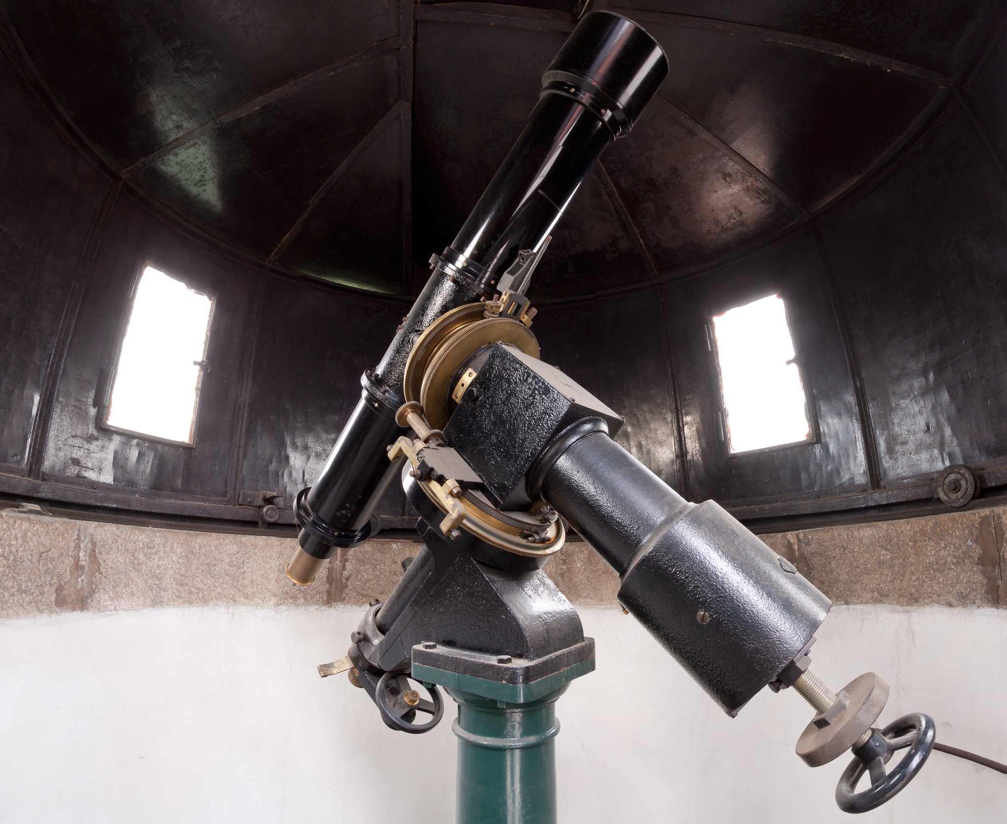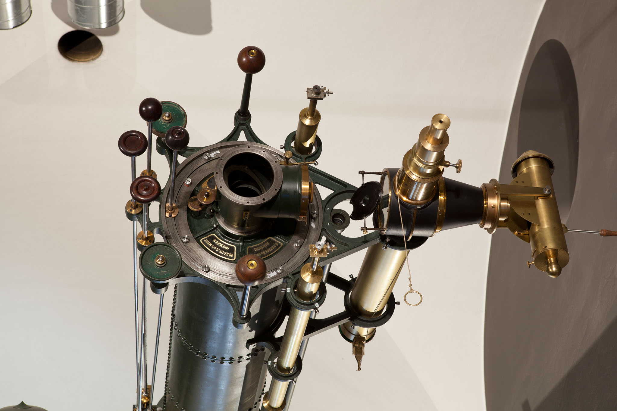 La parte posteriore del rifrattore Merz-Repsold da 18 pollici dopo il restauro, esposto nella galleria del Museo Nazionale della Scienza e della Tecnologia Leonardo da Vinci di Milano (settembre 2017): sono visibili il cercatore e la lampada per l'illuminazione dei cerchi graduati (a destra), i microscopi per la lettura dei cerchi graduati e i comandi per la regolazione fine del puntamento.