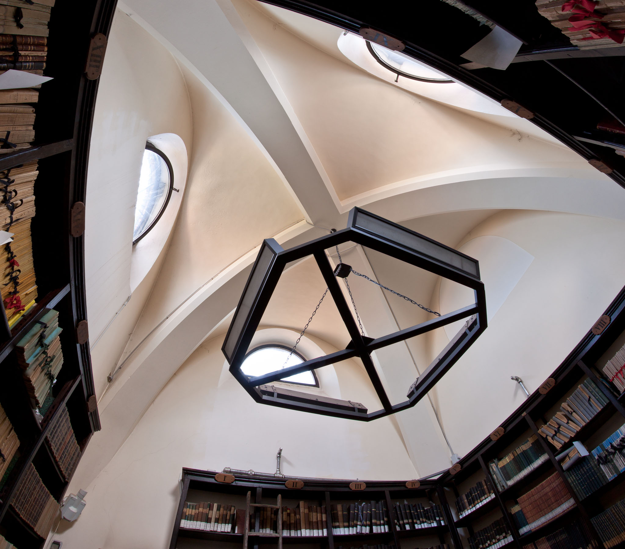 Il soffitto della stanza che si trova sotto il sottocupola della cupola del rifrattore Merz da 8 pollici (stanza attualmente adibita ad archivio). Le quattro robuste costole del soffitto a volta sostengono il peso della sovrastante colonna di granito che regge il telescopio e lo scaricano sui muri portanti dell'edificio.
