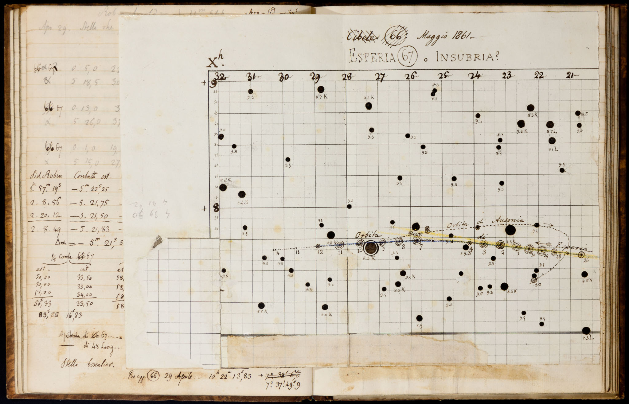 Disegno di Schiaparelli (tratto dai suoi quaderni osservativi) che illustra il moto orbitale dell'asteroide Esperia, da lui scoperto il 29 aprile 1861 utilizzando il settore equatoriale di Sisson, uno strumento costruito un secolo prima e che aveva un obiettivo di soli 10 cm di diametro. Le difficoltà incontrate da Schiaparelli nell'osservare questo asteroide furono uno dei fattori che lo convinsero della necessità di dotare l'Osservatorio di telescopi più potenti e più moderni.