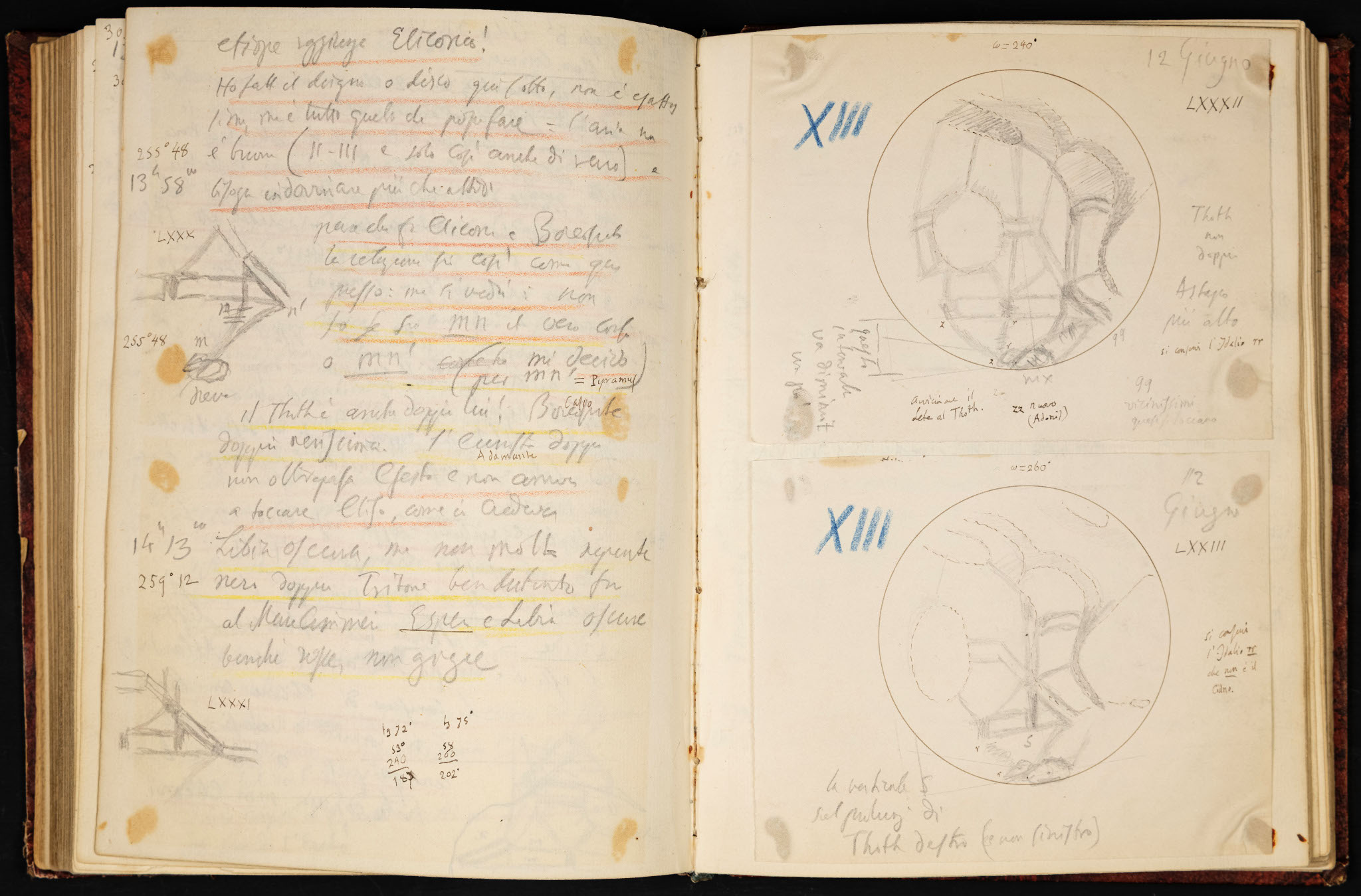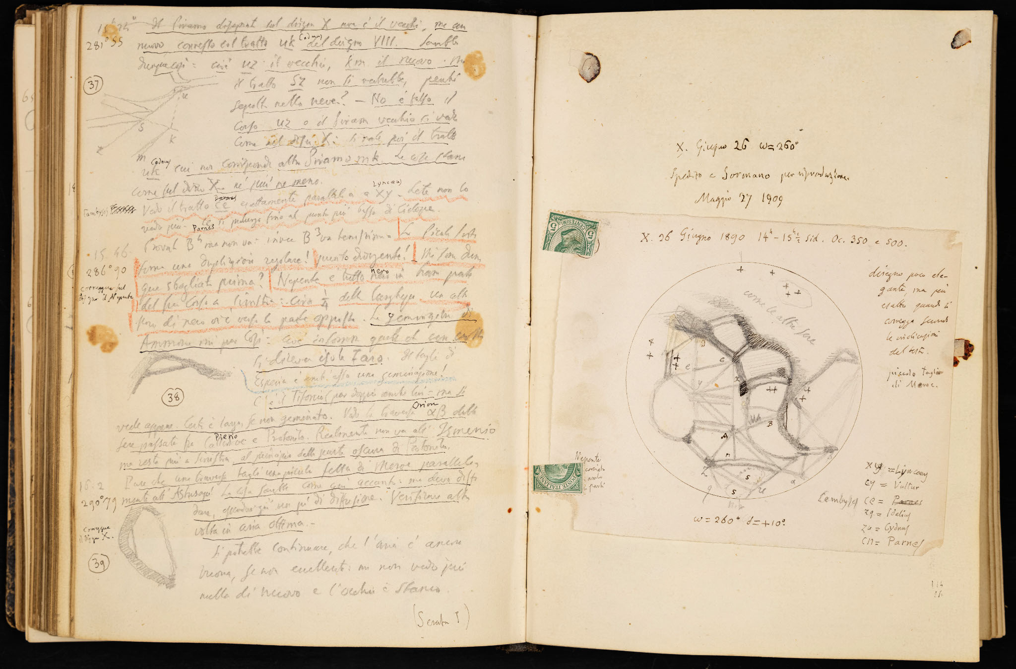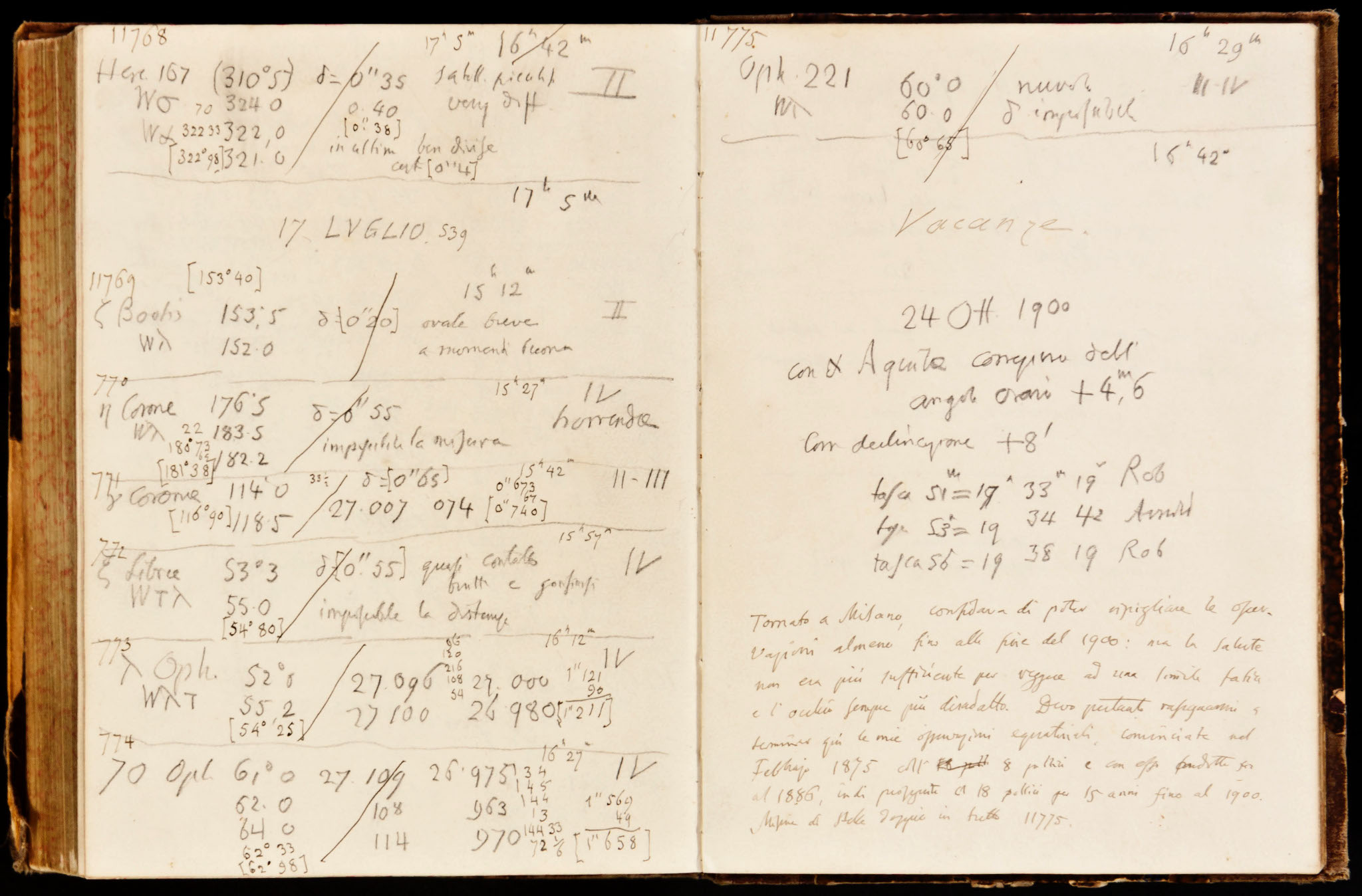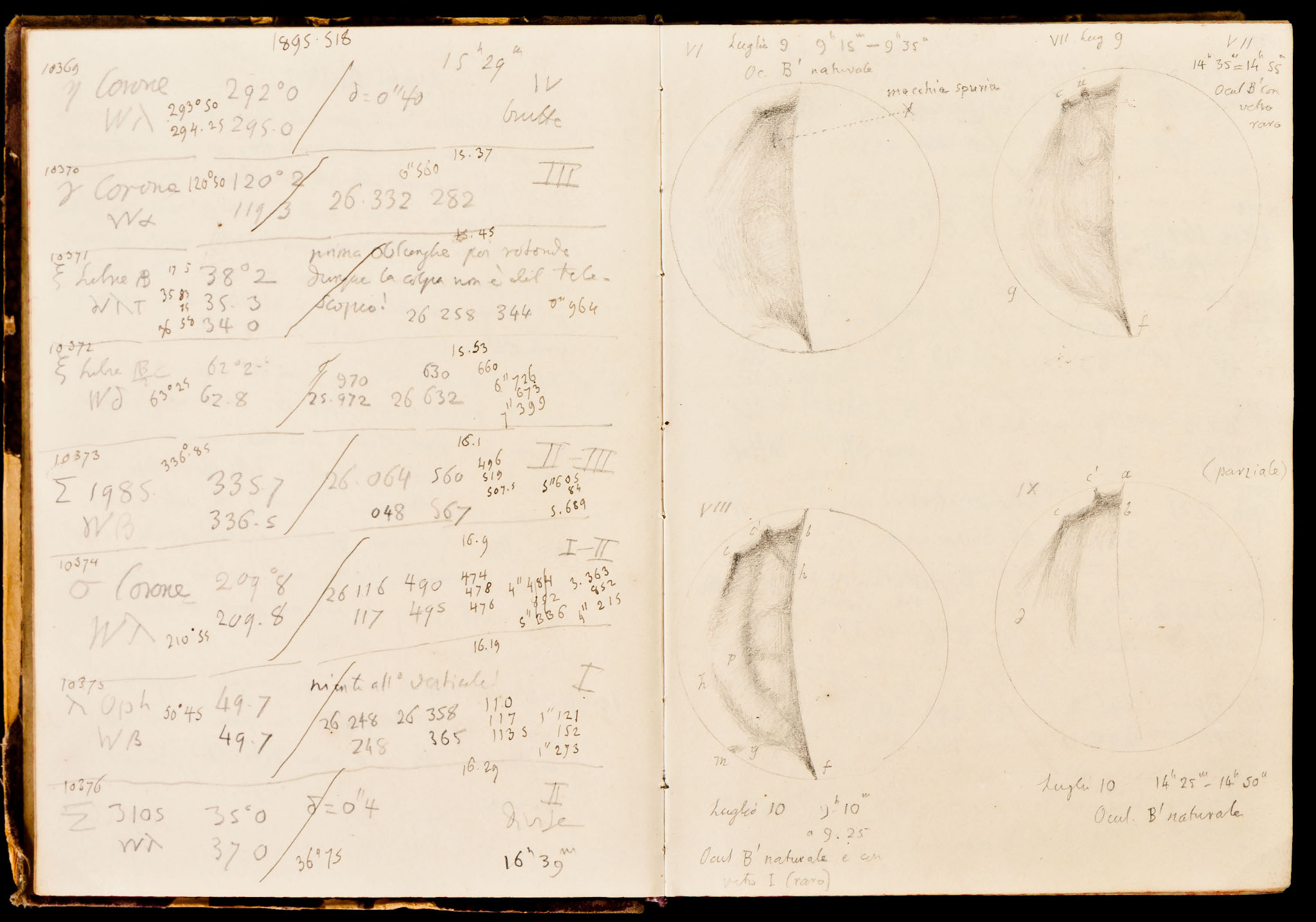 Una pagina dai diari osservativi di Schiaparelli (luglio 1895) con misurazioni micrometriche di stelle doppie (a sinistra) e disegni di Venere, fatti nel tentativo (infruttuoso) di determinare il periodo di rotazione del pianeta attorno al proprio asse. Le barre trasversali tracciate sulle misurazioni di stelle doppie indicano che esse sono state ridotte e trascritte nel registro definitivo.
