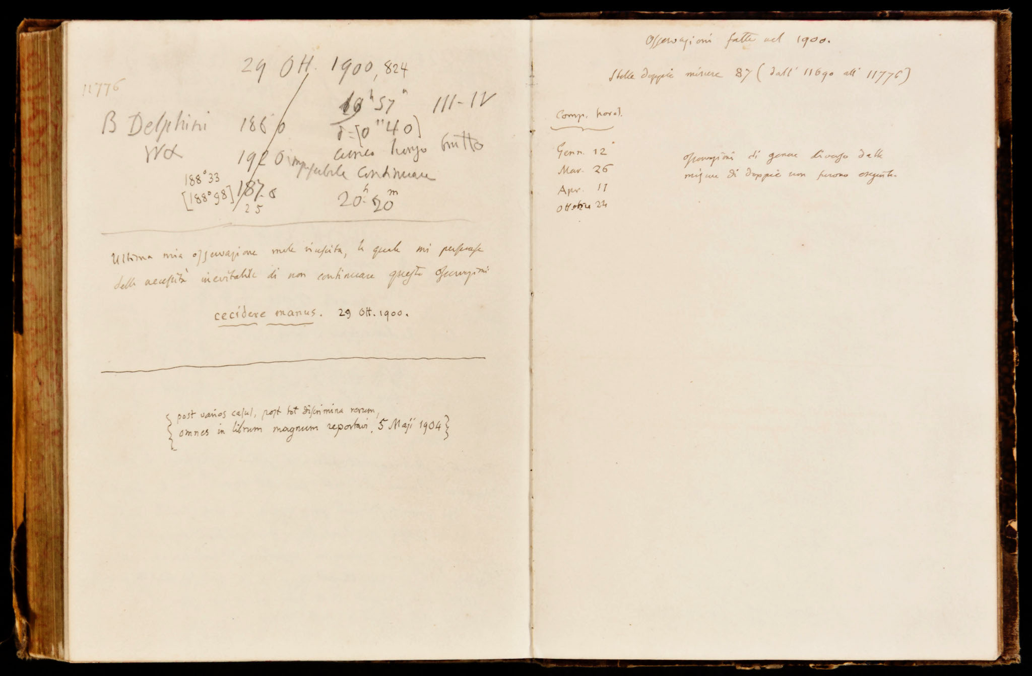 L'ultima pagina dei diari osservativi di Schiaparelli: Ultima mia osservazione male riuscita, la quale mi persuase della necessità inevitabile di non continuare queste osservazioni. Cecidere manus. 29 Ott. 1900.
