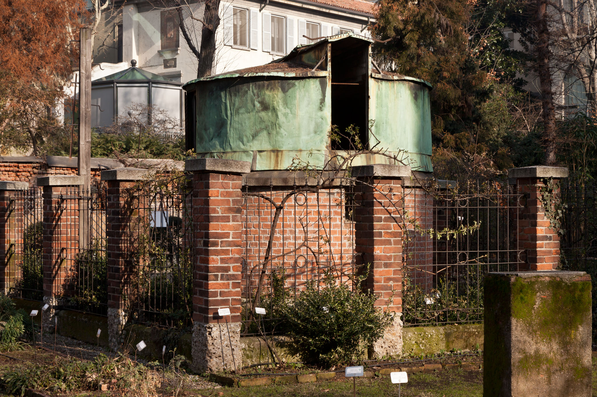 Cupolino costruito nel 1875 nell'Orto Botanico per ospitare gli strumenti dei passaggi che dovevano servire alle campagne di longitudine e alle misurazioni di latitudine dell'Osservatorio; il cupolino fu costruito a livello del terreno per ovviare alle flessioni dell'edificio che compromettevano la stabilità del puntamento degli strumenti installati nei locali dell'Osservatorio. Alla sinistra del cupolino è visibile il palo a cui arrivavano i fili della linea telegrafica usati per la sincronizzazione degli orologi tra i diversi siti che partecipavano a una campagna di longitudine.