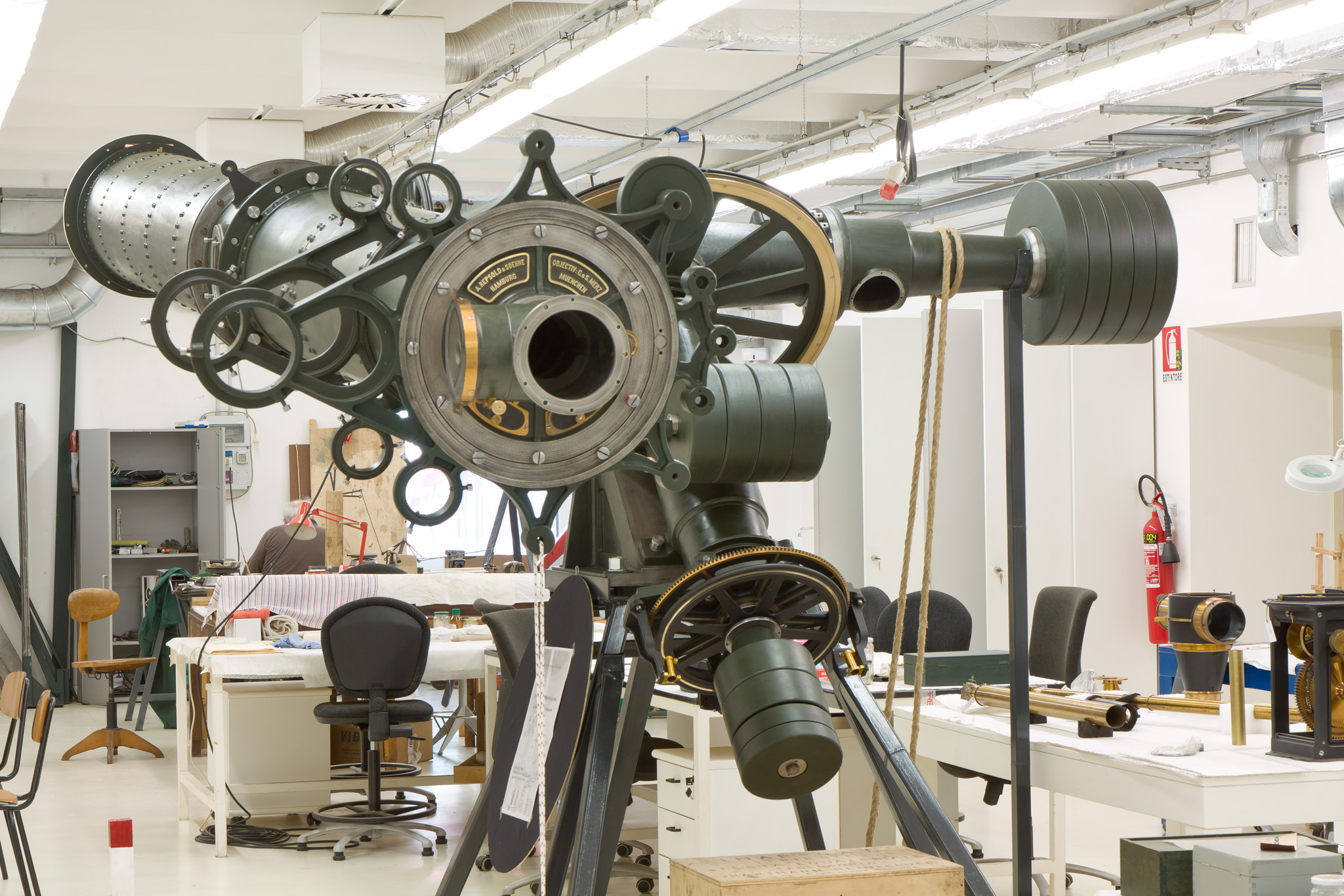 Il rifrattore Merz-Repsold da 18 pollici in fase di restauro (aprile 2011) nel laboratorio dell'ARASS-Brera.