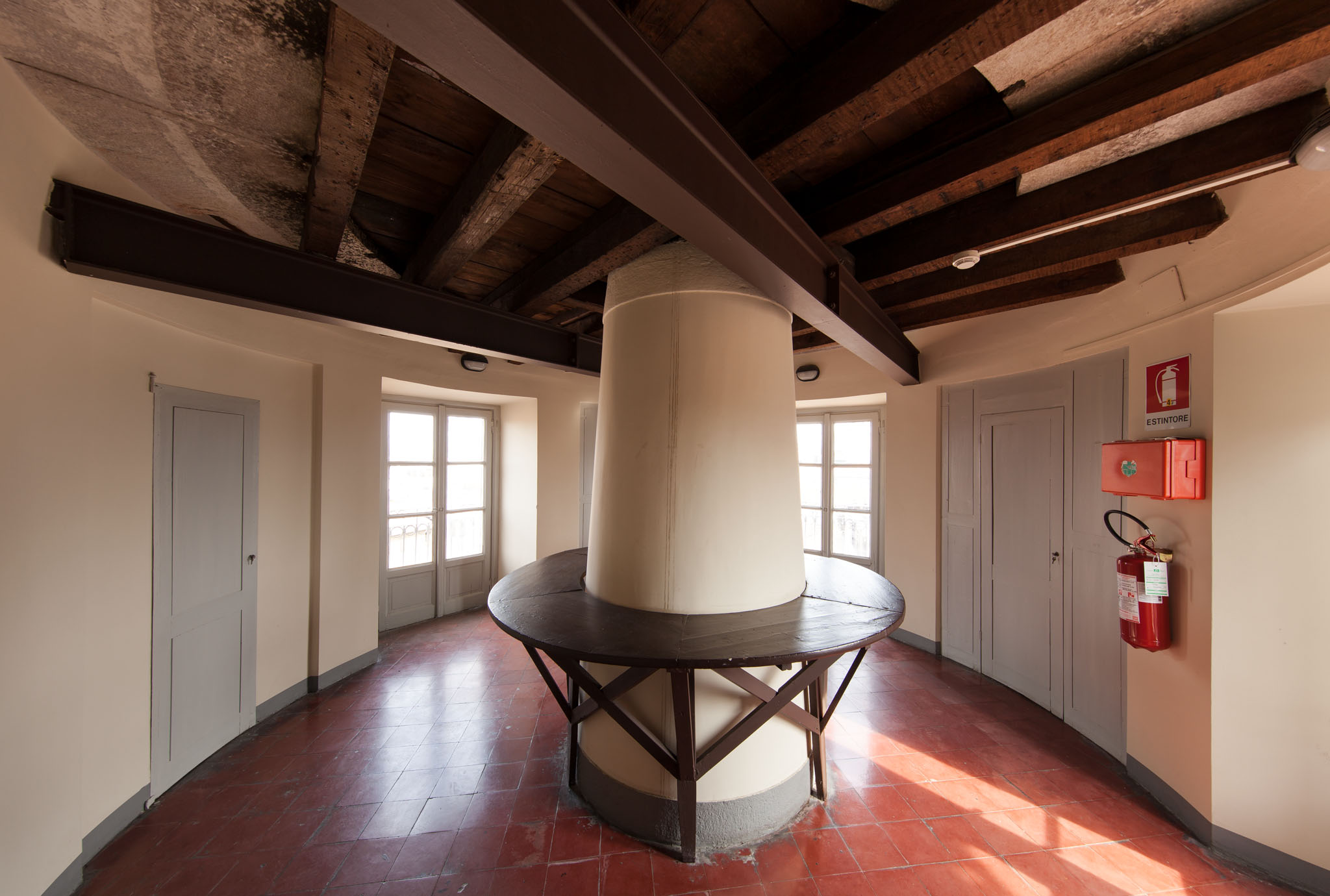 La stanza posta immediatamente sotto la cupola del rifrattore Merz da 8 pollici, con la colonna di granito che regge la montatura del telescopio.