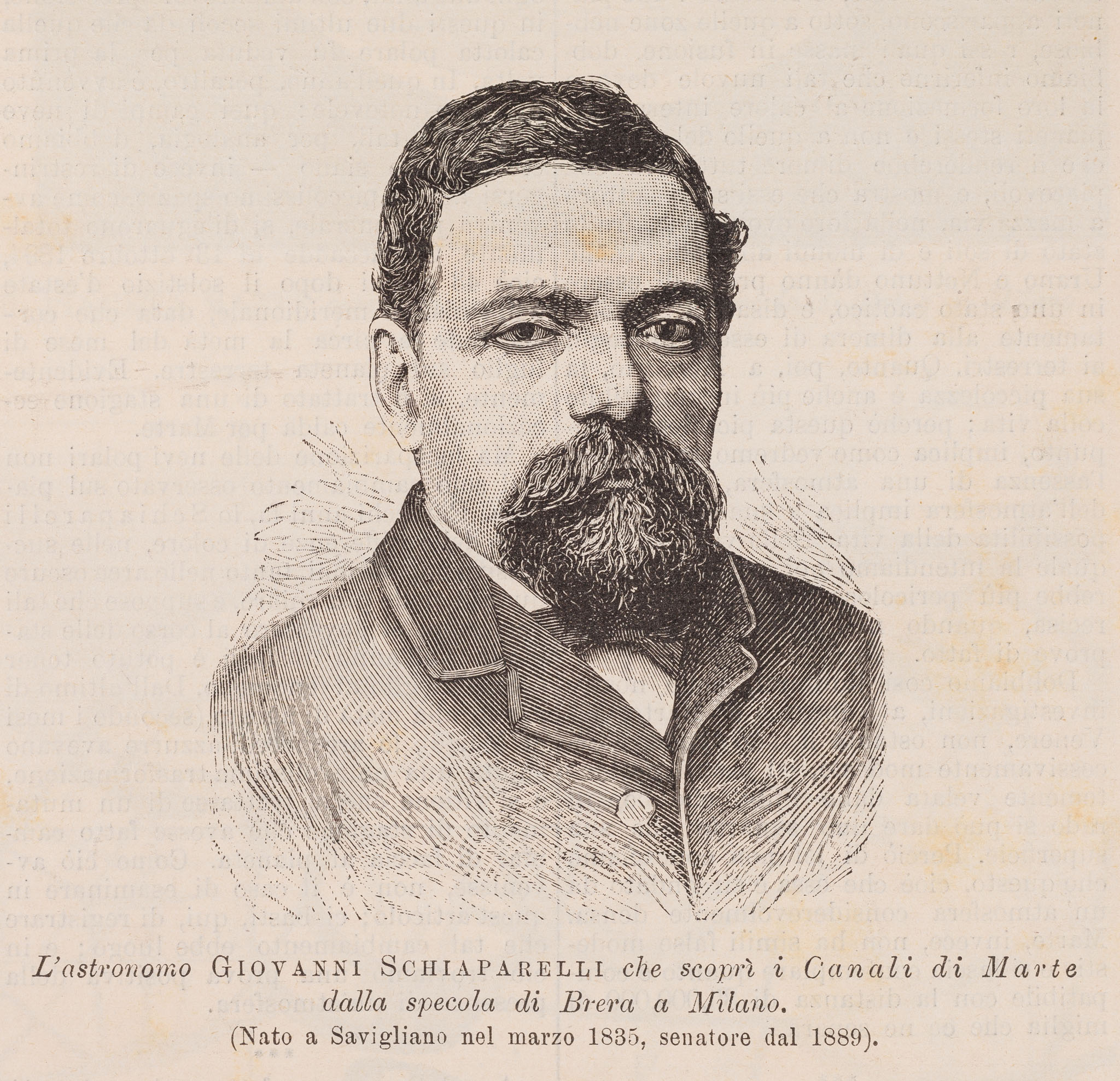 La copertina che La Domenica del Corriere, il settimanale del quotidiano Il Corriere della Sera, dedicò a Schiaparelli in occasione del suo pensionamento, nell'ottobre 1900. L'immagine, opera del disegnatore Achille Beltrame, ritrae l'astronomo di fianco al rifrattore Merz-Repsold, su cui è montato il micrometro filare che egli usò per le sue osservazioni di Marte e le misurazioni di stelle doppie.