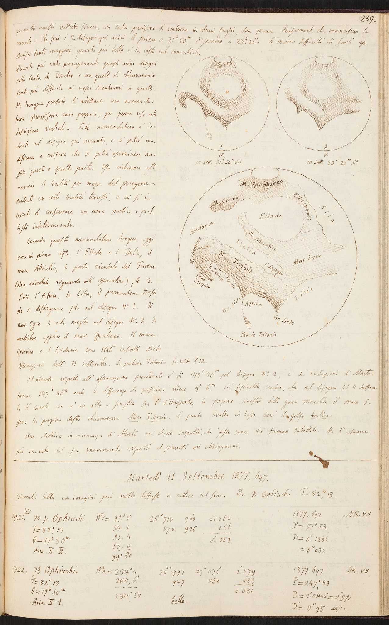 Una pagina dai diari osservativi di Schiaparelli, con appunti e disegni del pianeta Marte.
