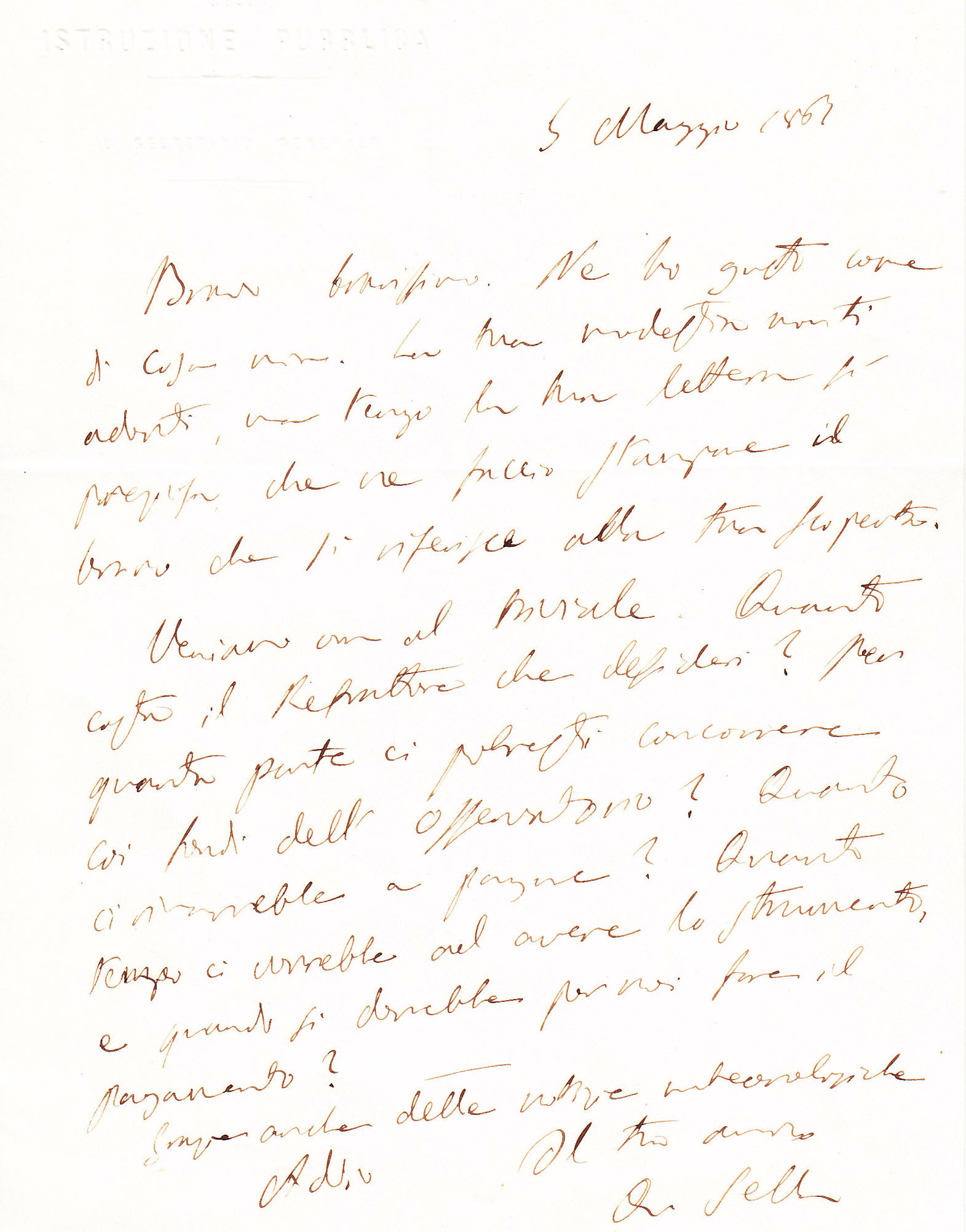 Lettera del 5 maggio 1861 con cui Quintino Sella, allora deputato del neonato Regno d'Italia, si complimenta con Schiaparelli per la sua recente scoperta dell'asteroide Esperia, e chiede informazioni per l'acquisto di un nuovo telescopio per l'Osservatorio di Brera. L'anno successivo Sella diventerà Ministro delle Finanze e in questa veste farà approvare lo stanziamento per il rifrattore Merz da 8 pollici.