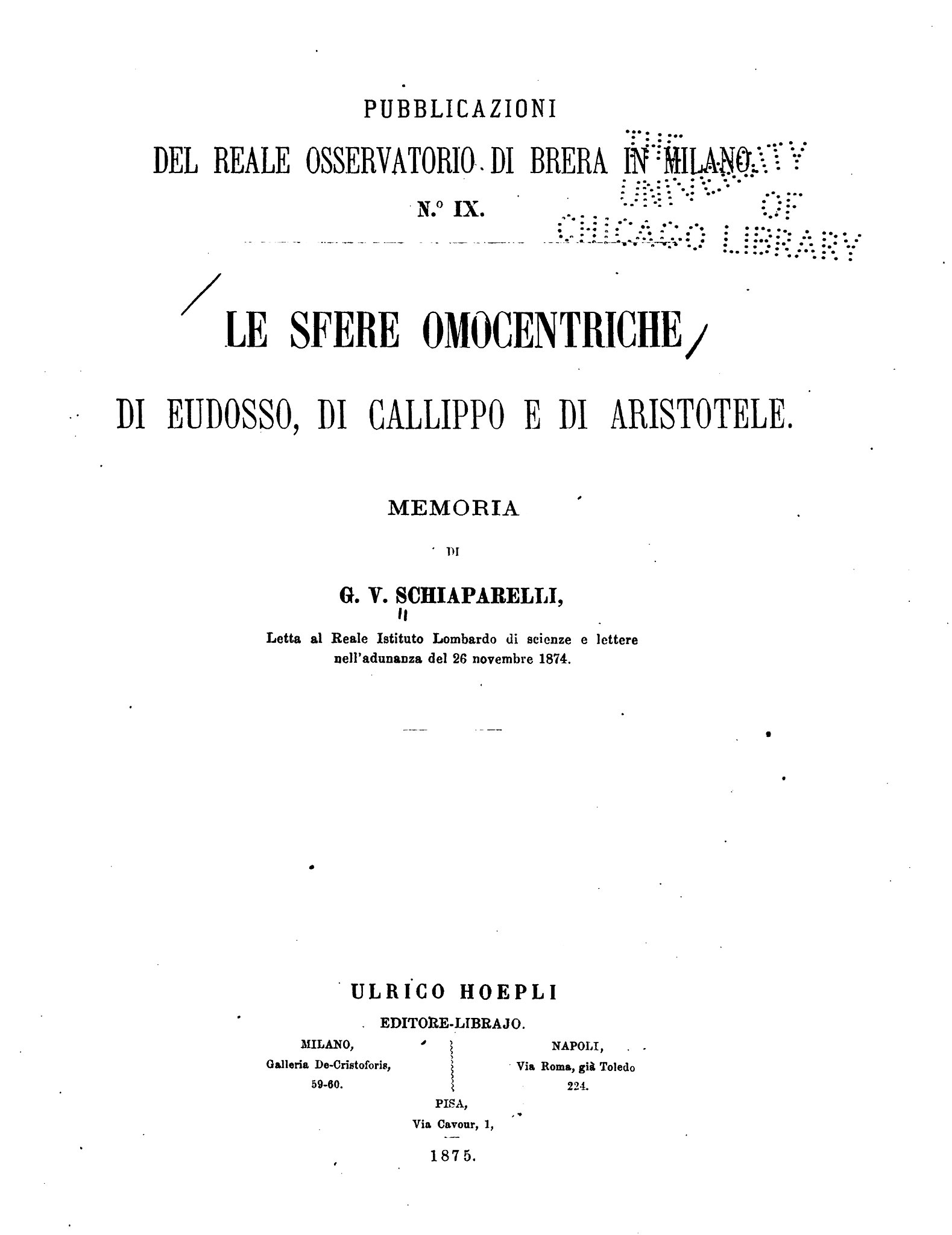 Intestazione dell'articolo di Schiaparelli, pubblicato nel 1875, sulle sfere omocentriche di Eudosso, un lavoro minuzioso (e citato ancora oggi) sui primordi della teoria planetaria nella Grecia antica.
