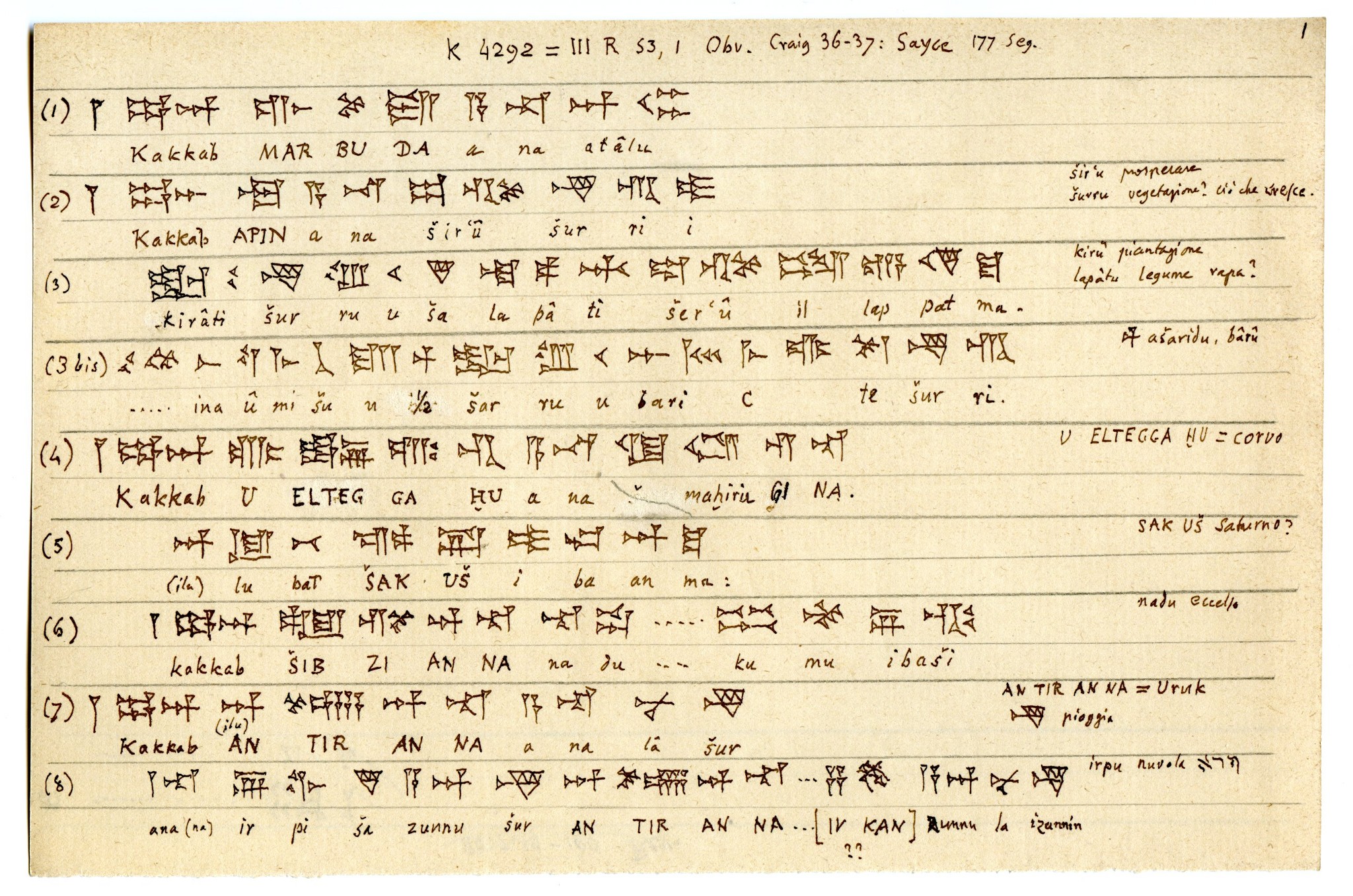 Una scheda di appunti di Schiaparelli, in cui l'astronomo ha trascritto e traslitterato un testo inciso su una tavoletta assiro-babilonese, scritta in caratteri cuneiformi, in cui è da supporre siano riportate osservazioni astronomiche. Schiaparelli dedicò gli ultimi anni della sua vita, dal pensionamento nel 1900 alla morte nel 1910, ad approfondire i suoi studi sulla storia dell'astronomia antica.