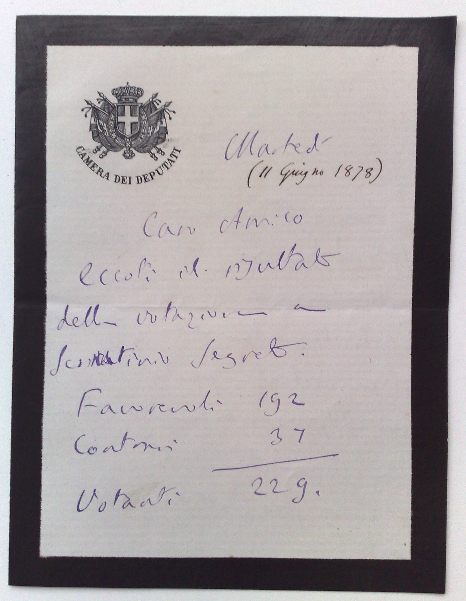 La lettera con cui Quintino Sella comunica a Schiaparelli il risultato della votazione con cui il parlamento ha approvato la legge che stanzia i fondi necessari per l'acquisto del rifrattore Merz-Repsold: 250 mila lire dell'epoca, pari a circa un milione di euro attuali (2021).