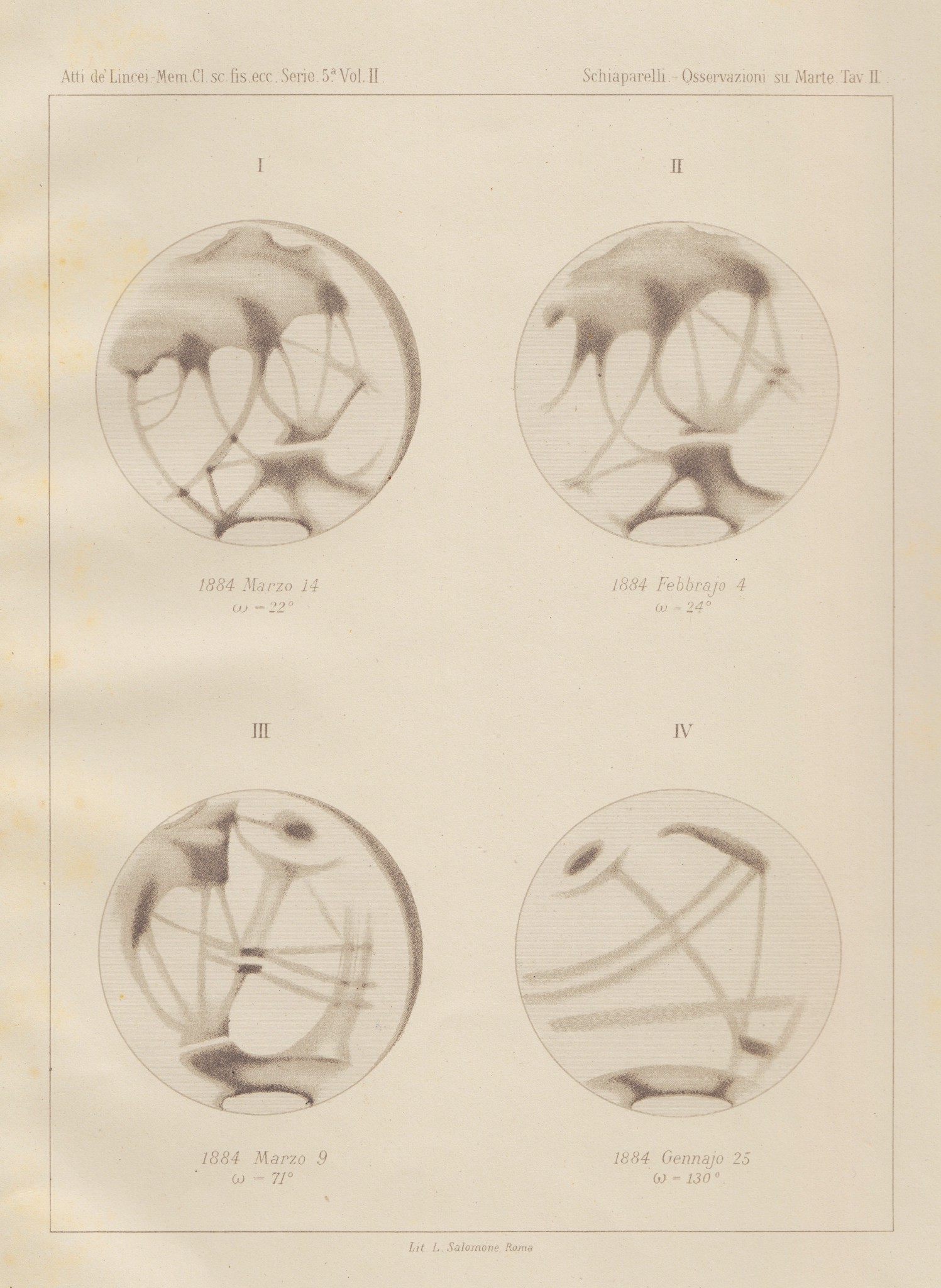 Disegni della superficie del pianeta Marte tratte dalla quarta memoria lincea di Schiaparelli, basate su osservazioni del 1884.