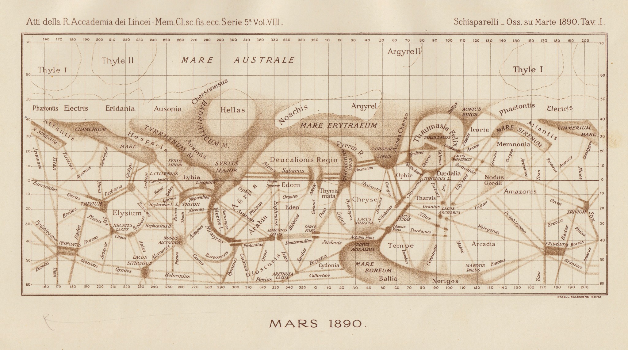 La prima mappa della superficie di Marte prodotta da Schiaparelli, basata sulle osservazioni ottenute durante l'opposizione del 1877 e pubblicata in appendice alla prima delle sette memorie lincee che l'astronomo dedicherà alla topografia del pianeta.