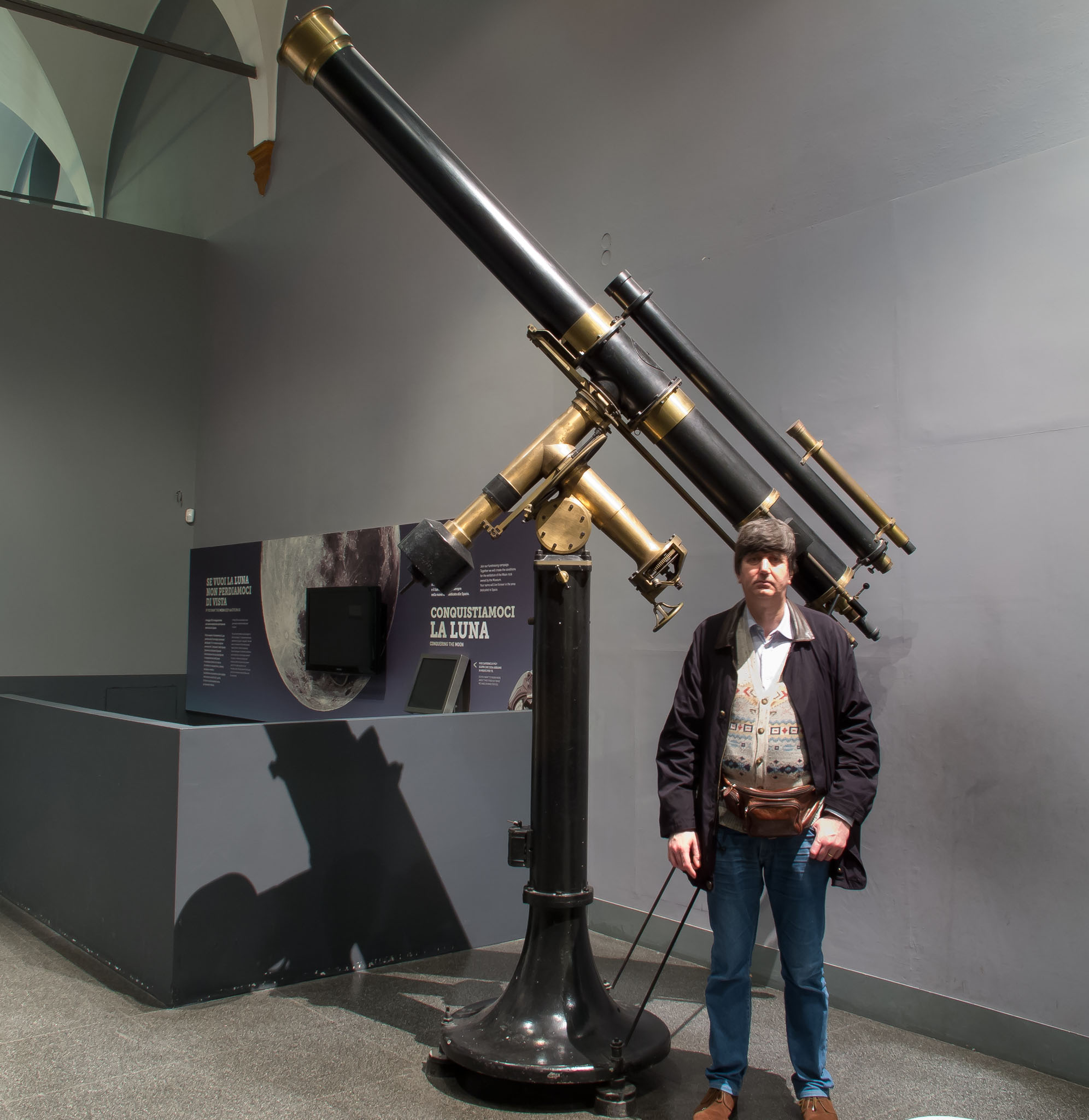 Giovanni Celoria fotografato di fianco al rifrattore Merz-Repsold di Schiaparelli, nella sua cupola a Brera.