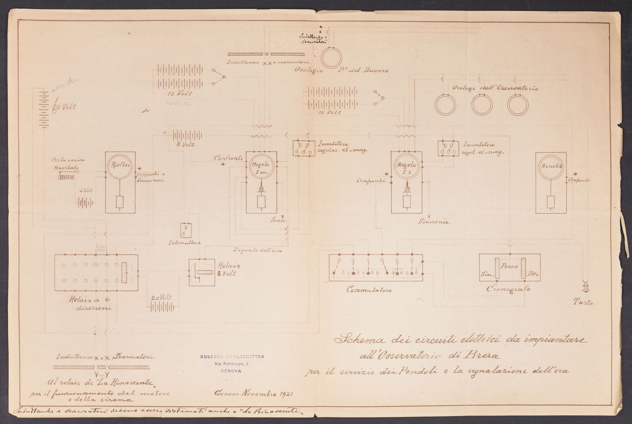 Schema dei circuiti elettrici dell'impianto che comandava la sirena per il segnale del mezzogiorno della Rinascente.