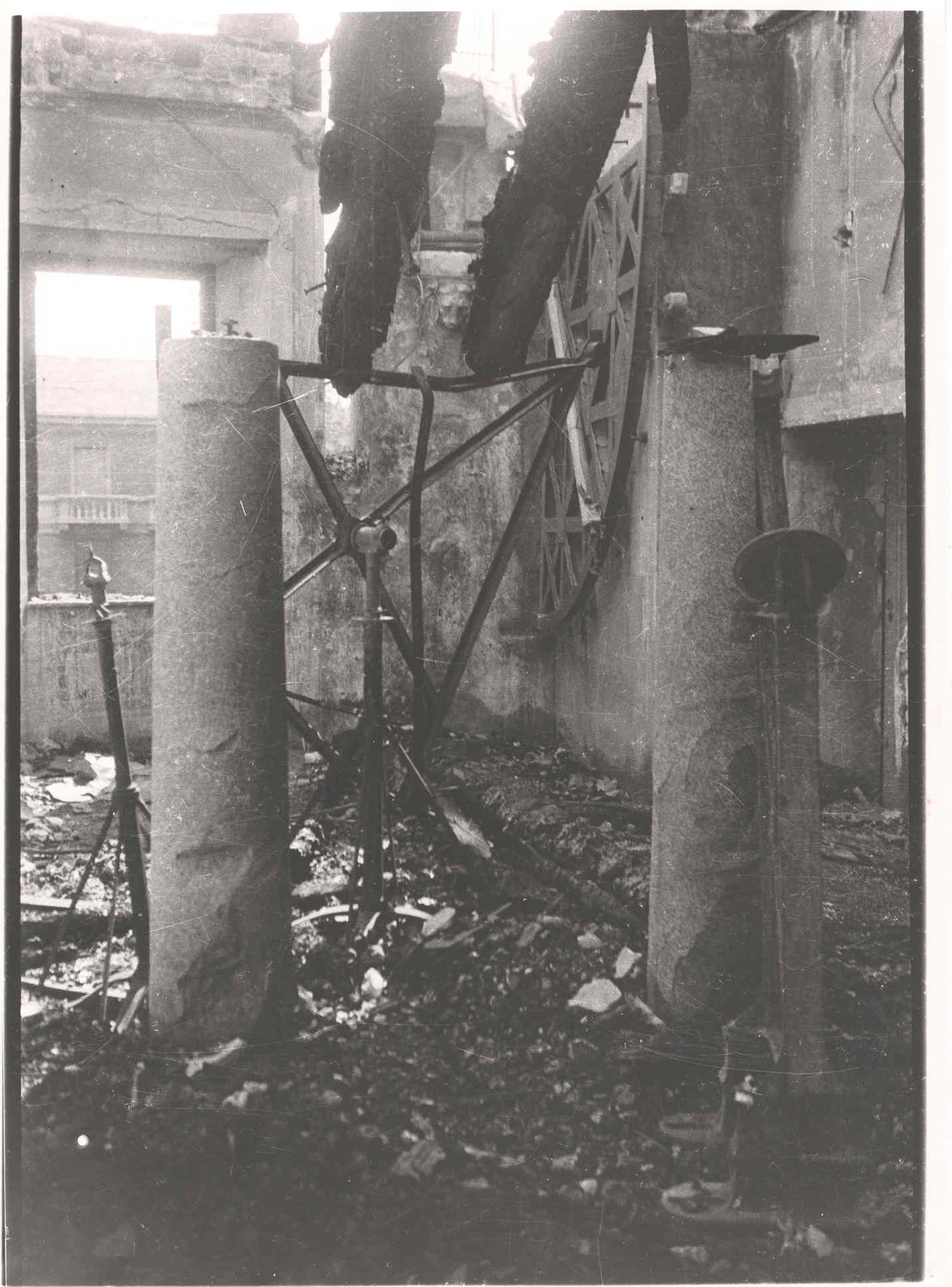 Gli effetti del bombardamento aereo che colpì il Palazzo di Brera la notte tra il 7 e l'8 agosto 1943. La fotografia mostra la distruzione della sala dove erano installati il quadrante murale di Ramsden (1789) e il sestante di Canivet (1765); entrambi gli strumenti sono stati in seguito restaurati e sono attualmente esposti nella galleria del Museo Nazionale della Scienza e della Tecnologia Leonardo da Vinci di Milano.