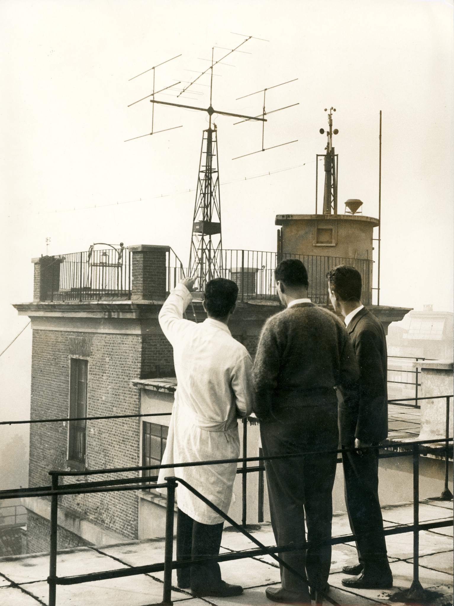 Antenne che servivano per il servizio del tempo fornito dal Centro di Cronometria di Brera (trasmissione di segnali orari e campioni di frequenza per uso scientifico e industriale), collocati sopra l'ex campanile della Chiesa di Santa Maria di Brera (la cosiddetta torre degli Umiliati). A destra delle antenne si vedono anche strumenti per le rilevazioni meteorologiche.
