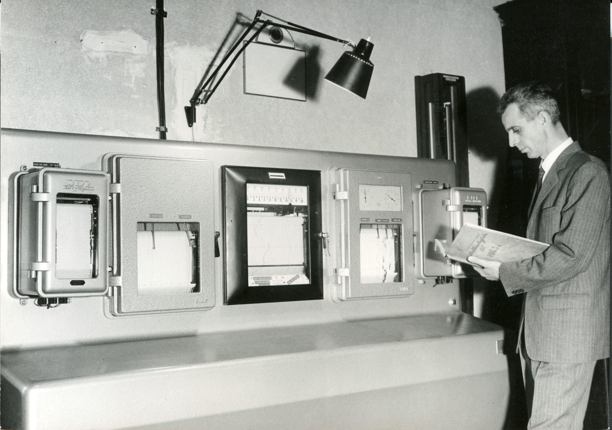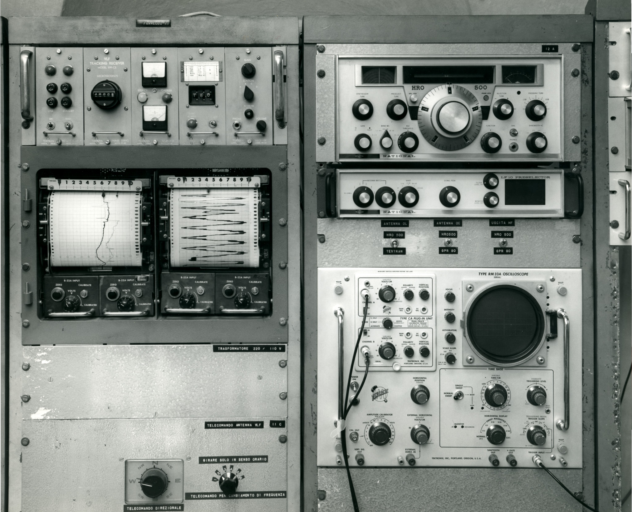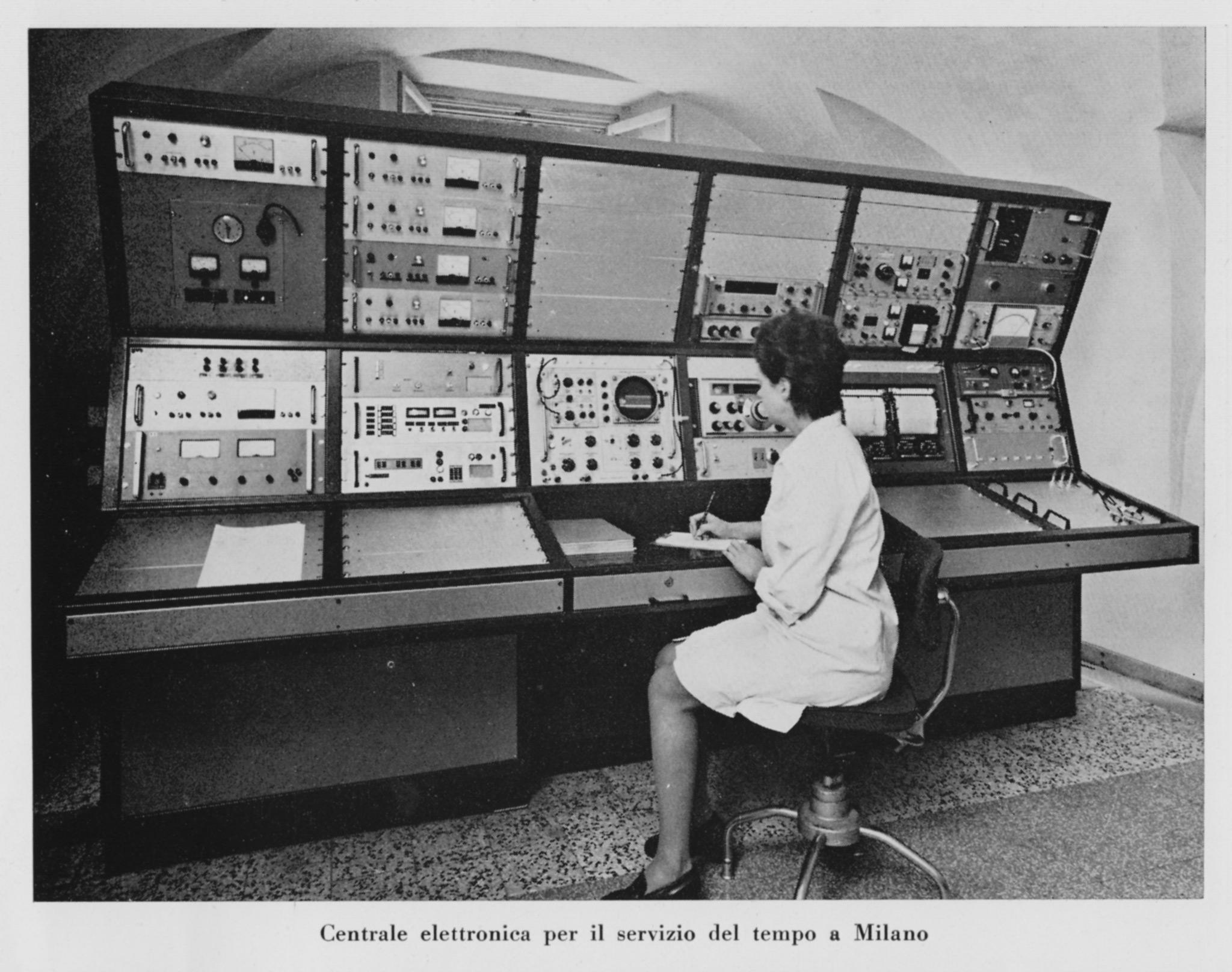 Apparecchiature per la ricezione di segnali orari e la loro elaborazione, che facevano parte della strumentazione dedicata allo studio del tempo e della rotazione terrestre (fotografia del 1970 circa).